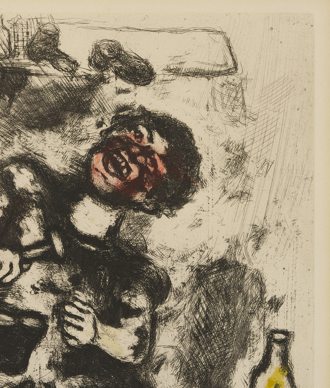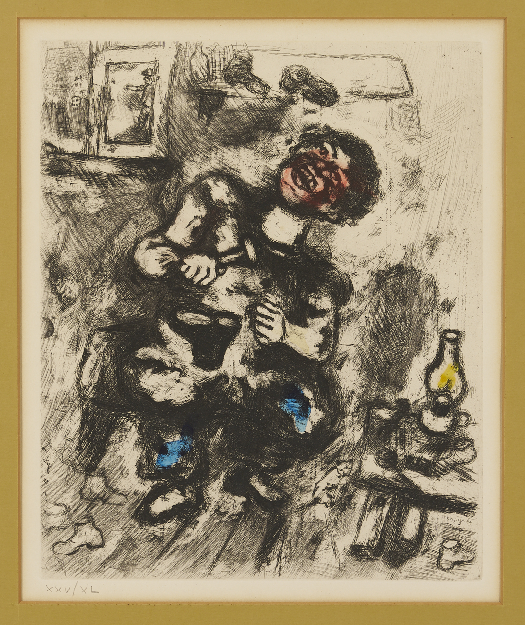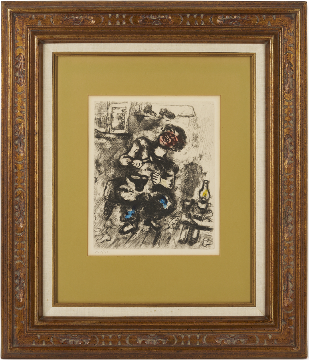 Marc Chagall (French/Russian, 1887-1985) etching with hand-coloring on wove paper with deckled right and lower edge, from Les Fables de la Fontaine, “Le Savetier et le Financier,” 1952. Published by Teriade Editeur, Paris. Signed in the plate and numbered XXV/XL in pencil, lower left. Ref.: Cramer books 22. Housed under glass in a giltwood frame with textile liner and gilt fillet and olive mat. Sheet: 15 1/4 in H x 11 5/8 in W. Framed: 28 1/4 in H x 24 1/2 in W.