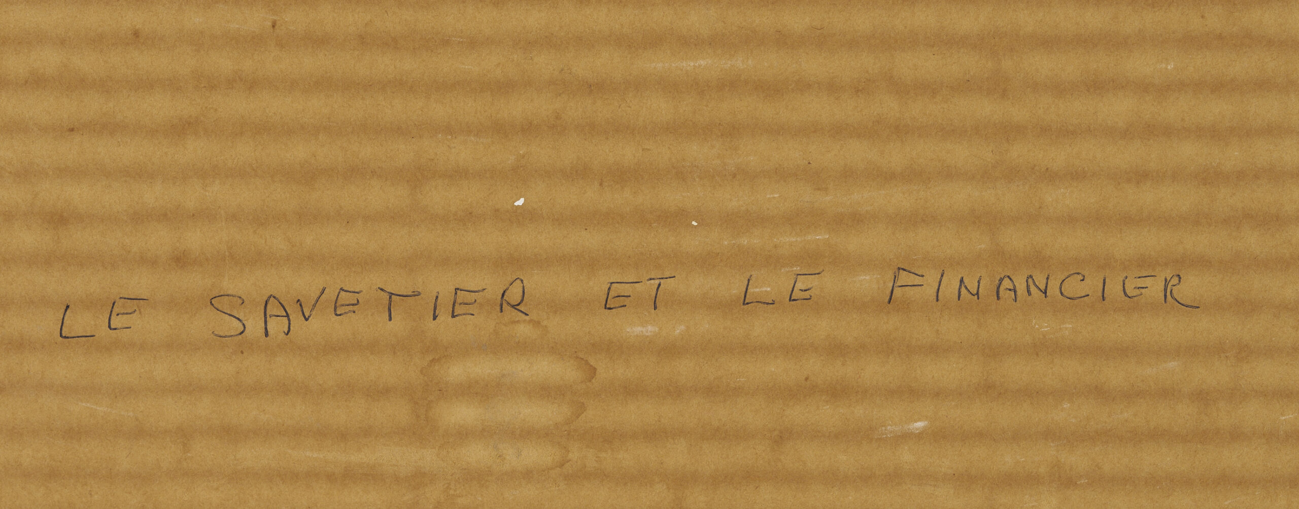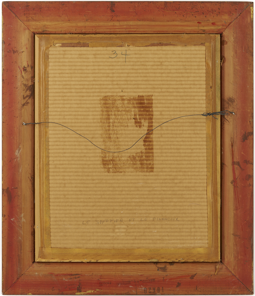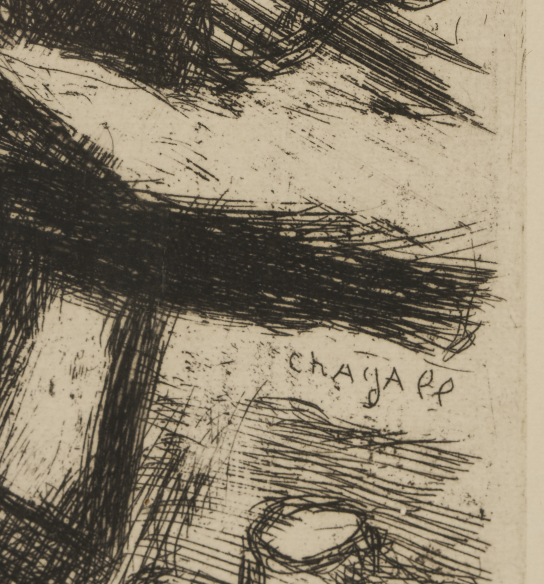 Marc Chagall (French/Russian, 1887-1985) etching with hand-coloring on wove paper with deckled right and lower edge, from Les Fables de la Fontaine, “Le Savetier et le Financier,” 1952. Published by Teriade Editeur, Paris. Signed in the plate and numbered XXV/XL in pencil, lower left. Ref.: Cramer books 22. Housed under glass in a giltwood frame with textile liner and gilt fillet and olive mat. Sheet: 15 1/4 in H x 11 5/8 in W. Framed: 28 1/4 in H x 24 1/2 in W.