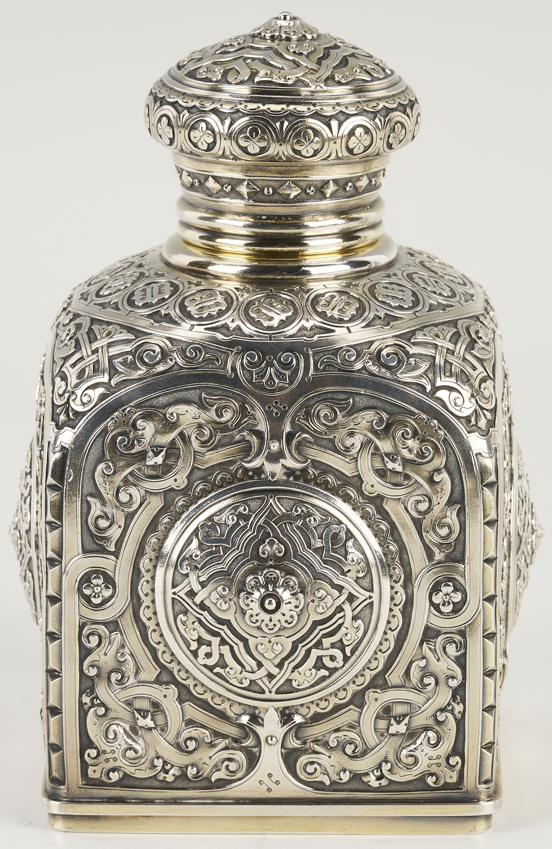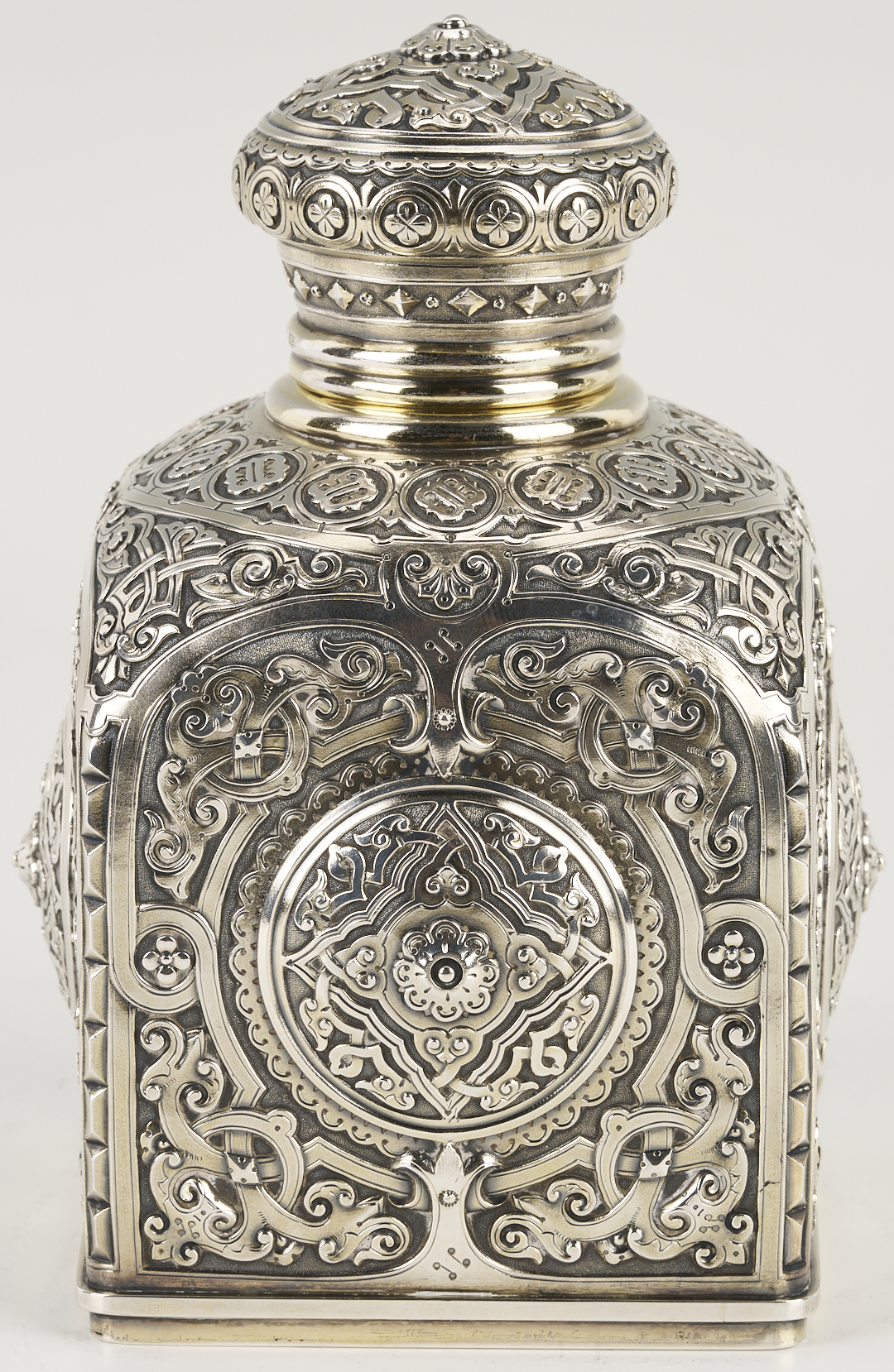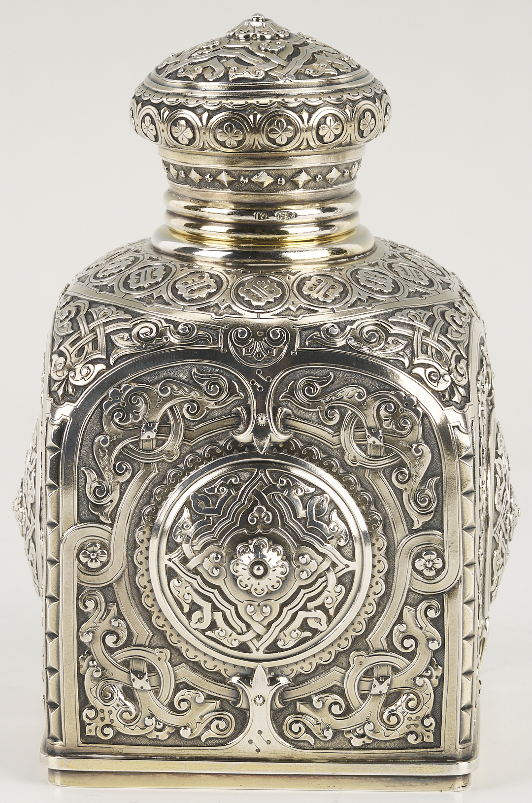 1st item: Pre- Russian Revolution Silver Tea Caddy, hallmarked for assayer Anatoly Apollonovich Artsybashev, Moscow, date 1888; maker’s mark rubbed, 84 zolotniki mark indicating 875/1000 fineness. Both base and detachable cover are hallmarked. The square form features an elaborate geometric medallion and arabesque design and a molded base. 16.71 oz troy. 5 3/4 in. H. 2nd item: Christofle silverplated tea caddy or jar of rounded footed form featuring a crown-engraved cartouche on one side and a vacant monogram reserve on the other, on a diapered ground. 6 in. H. French, late 19th to early 20th century.