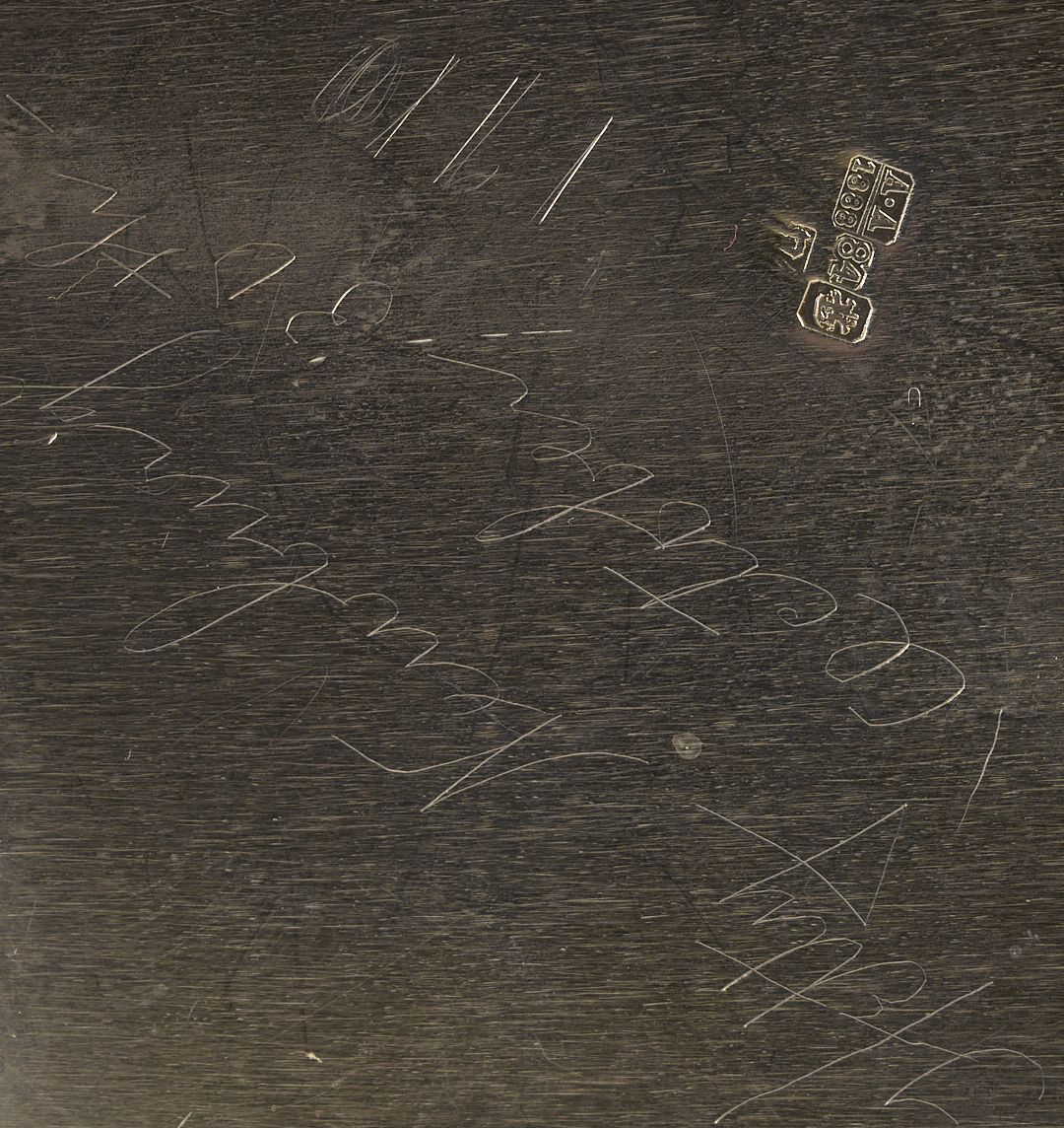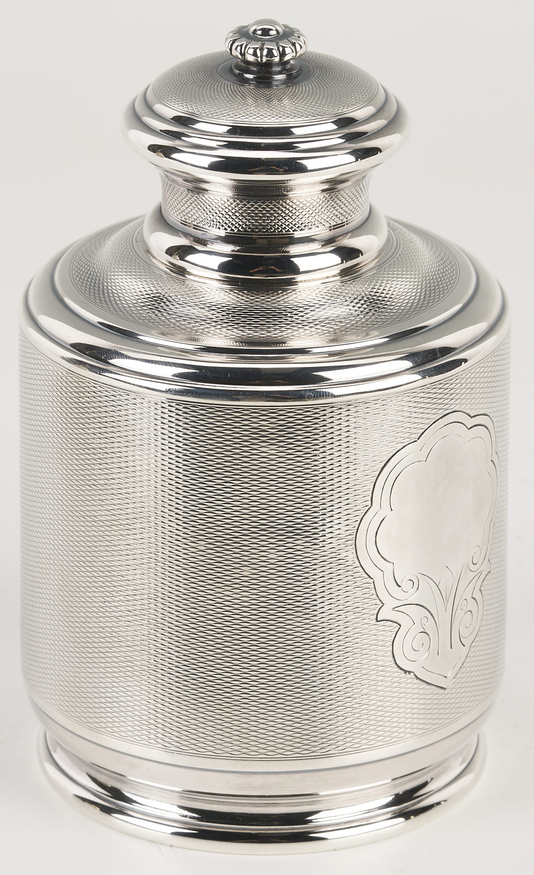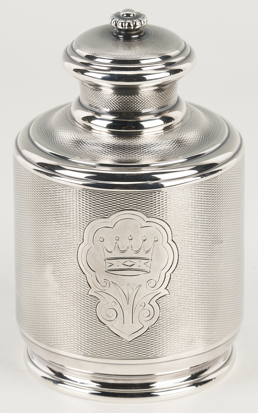 1st item: Pre- Russian Revolution Silver Tea Caddy, hallmarked for assayer Anatoly Apollonovich Artsybashev, Moscow, date 1888; maker’s mark rubbed, 84 zolotniki mark indicating 875/1000 fineness. Both base and detachable cover are hallmarked. The square form features an elaborate geometric medallion and arabesque design and a molded base. 16.71 oz troy. 5 3/4 in. H. 2nd item: Christofle silverplated tea caddy or jar of rounded footed form featuring a crown-engraved cartouche on one side and a vacant monogram reserve on the other, on a diapered ground. 6 in. H. French, late 19th to early 20th century.