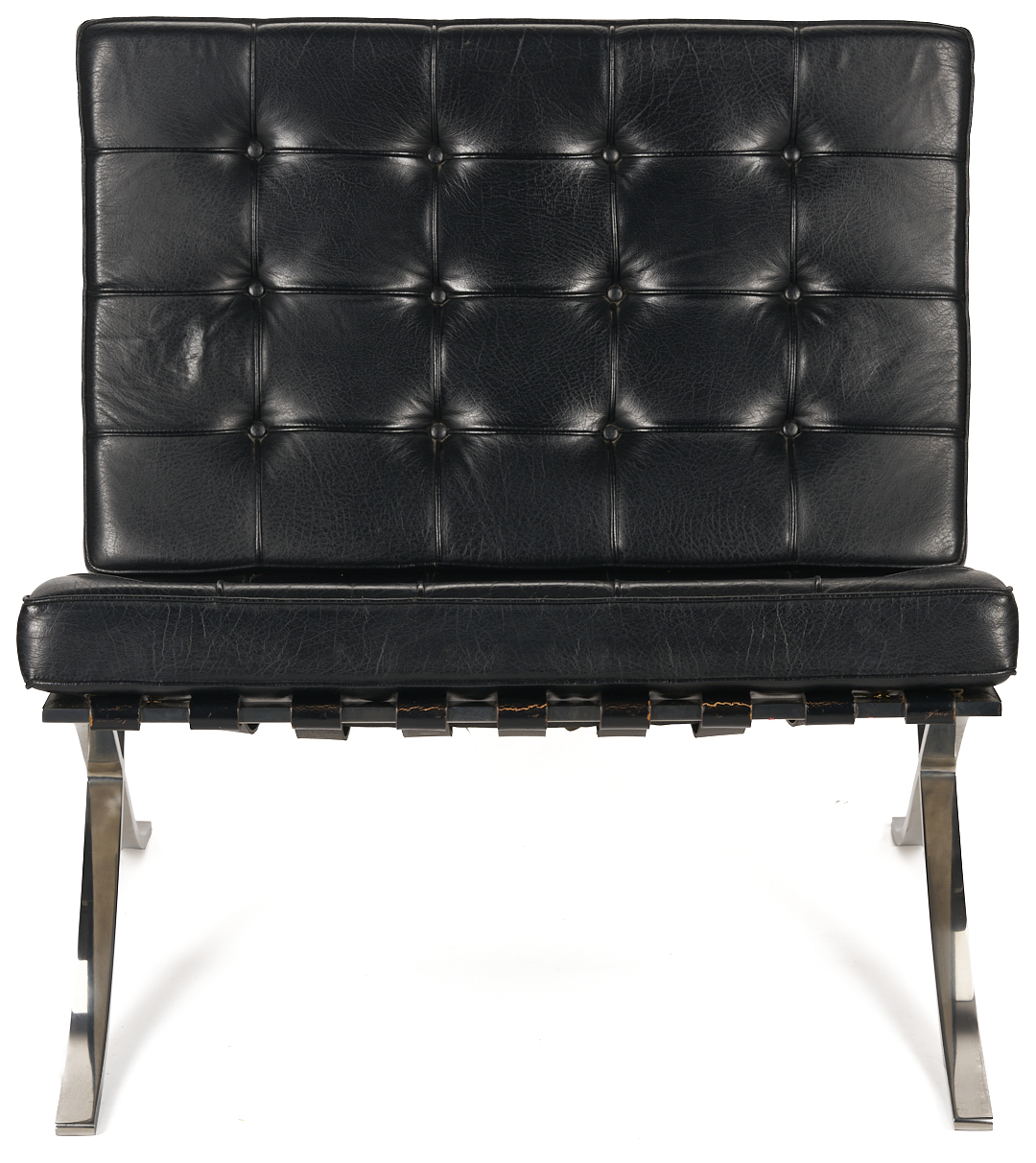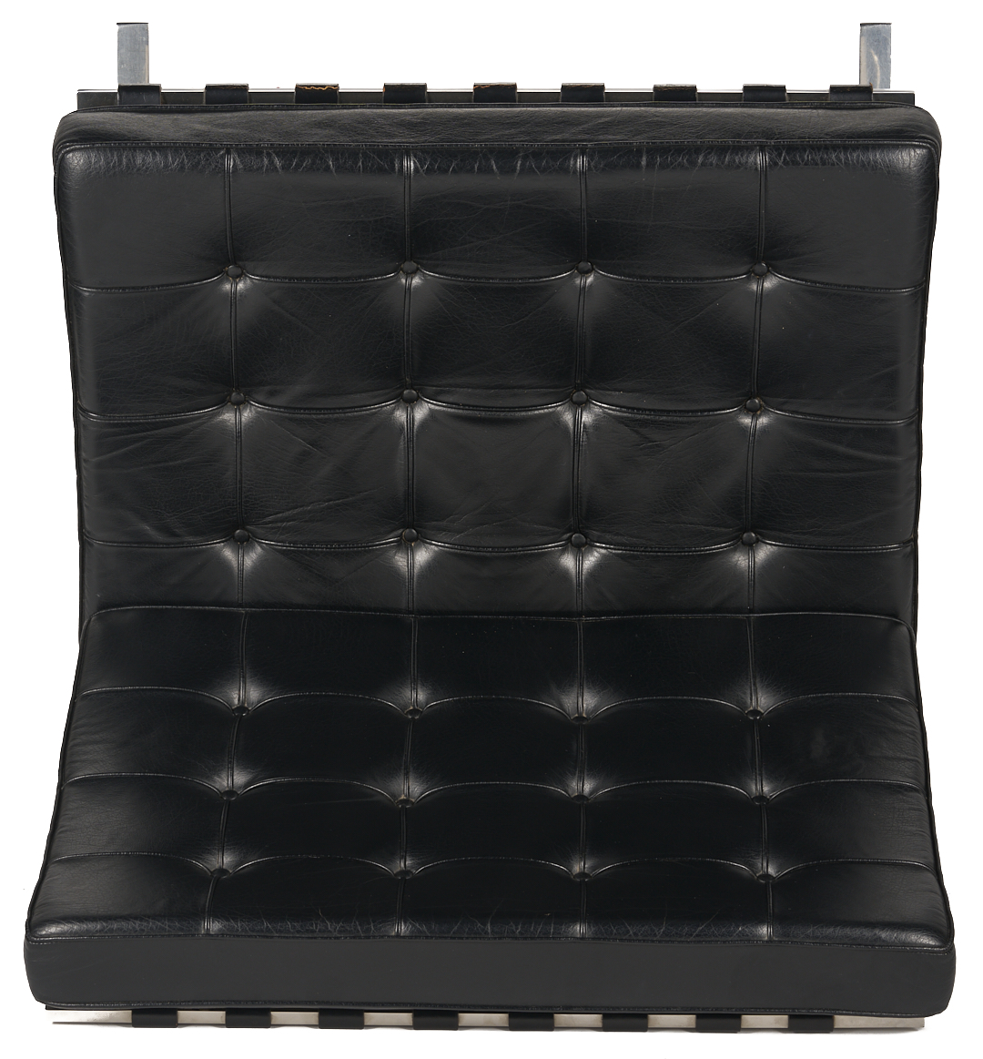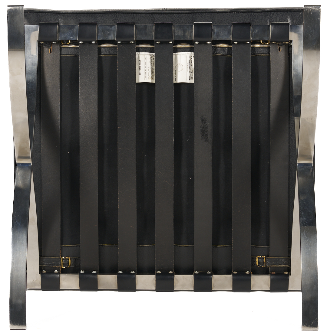 Barcelona chair and ottoman, both designed in 1929 by Ludwig Mies van der Rohe and manufactured by Knoll circa 1965. Original black tufted leather cushions with leather support straps, polished steel X-form legs. The chair retains the original tag for “Knoll Associates Inc., 745 Fifth Avenue, New York, NY”. The stool retains the original tag for “Knoll Associates Inc., 320 Park Avenue, New York, NY”. 30 in. H x 30 1/4 in. W x 30 1/2 in. D. Purchased in 1977 or 1979. Ref. Knoll Furniture: 1938-1960, Rouland and Rouland, page 80. Note: this auction includes 2 other similar Barcelona Chairs and Stools from the same estate collection.