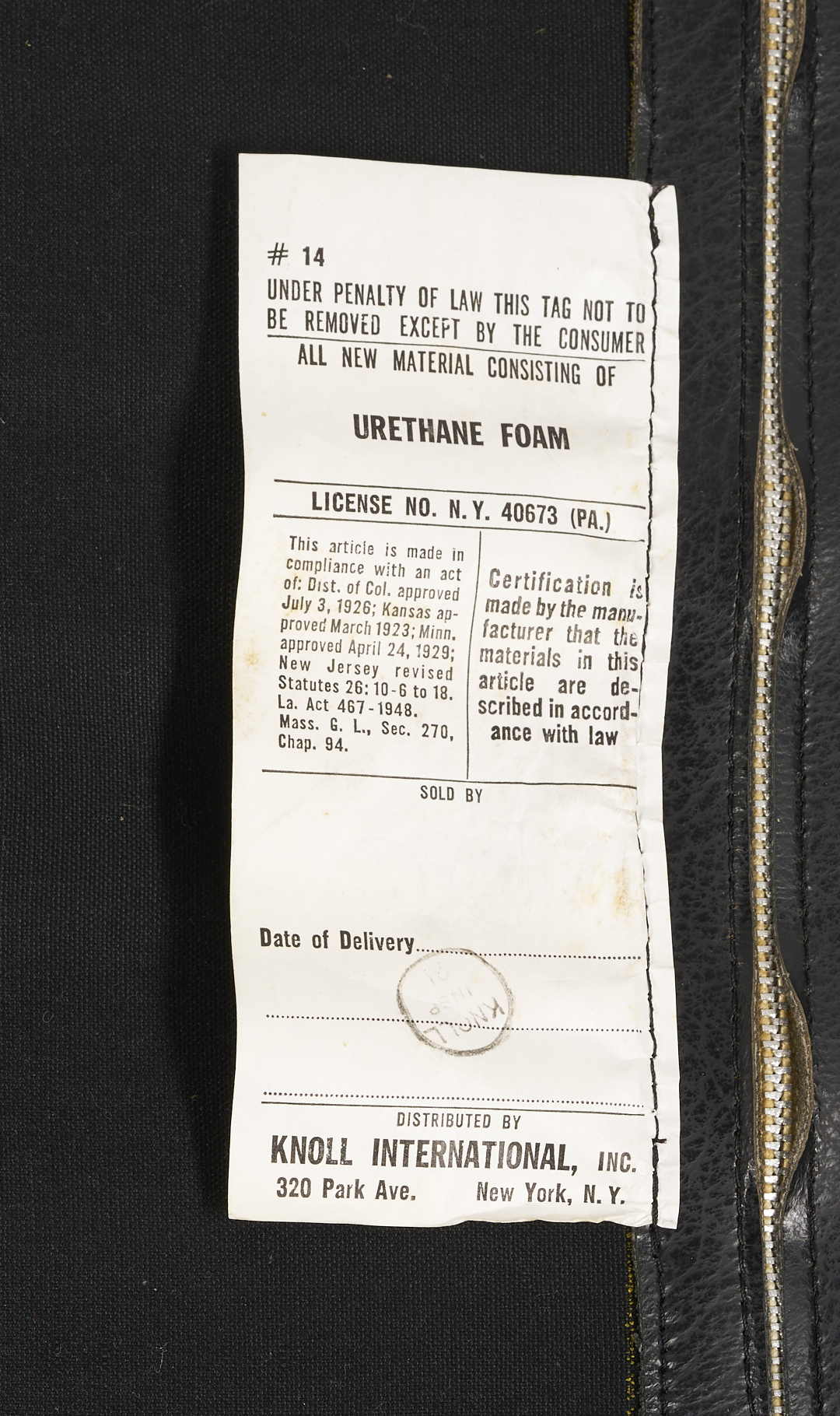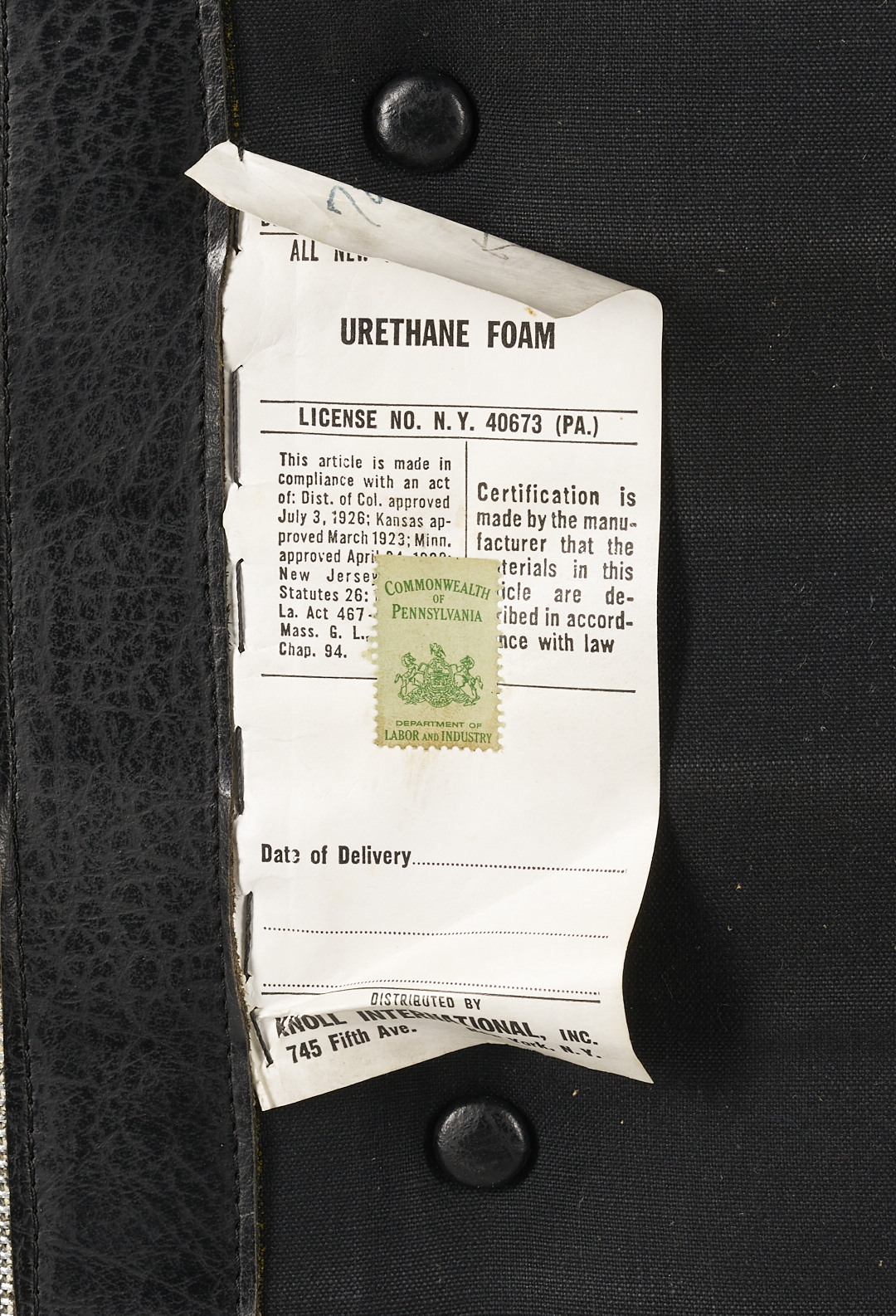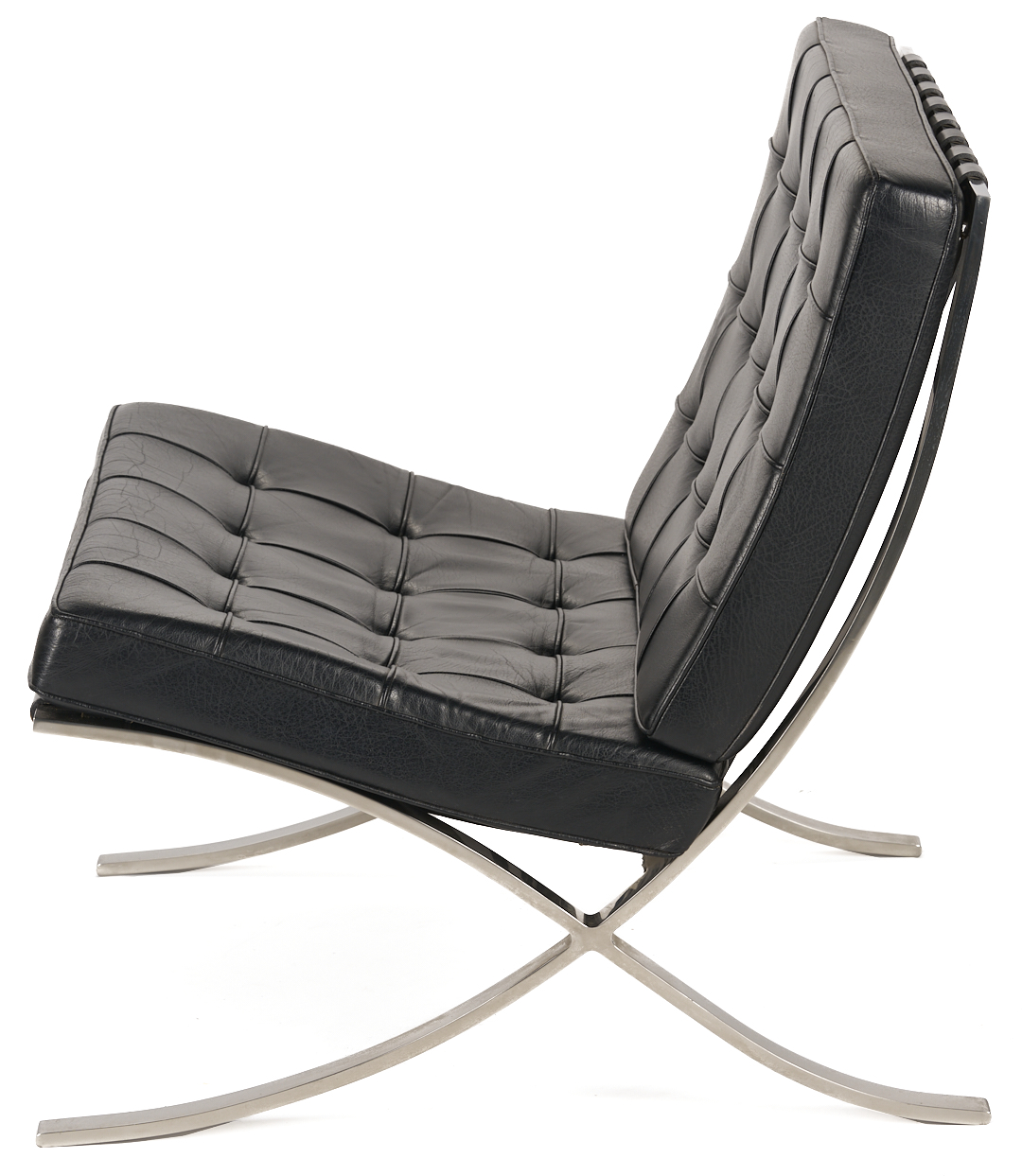 Barcelona chair and ottoman, both designed in 1929 by Ludwig Mies van der Rohe and manufactured by Knoll circa 1965. Original black tufted leather cushions with leather support straps, polished steel X-form legs. The chair retains the original tag for “Knoll Associates Inc., 745 Fifth Avenue, New York, NY”. The stool retains the original tag for “Knoll Associates Inc., 320 Park Avenue, New York, NY”. 30 in. H x 30 1/4 in. W x 30 1/2 in. D. Purchased in 1977 or 1979. Ref. Knoll Furniture: 1938-1960, Rouland and Rouland, page 80. Note: this auction includes 2 other similar Barcelona Chairs and Stools from the same estate collection.