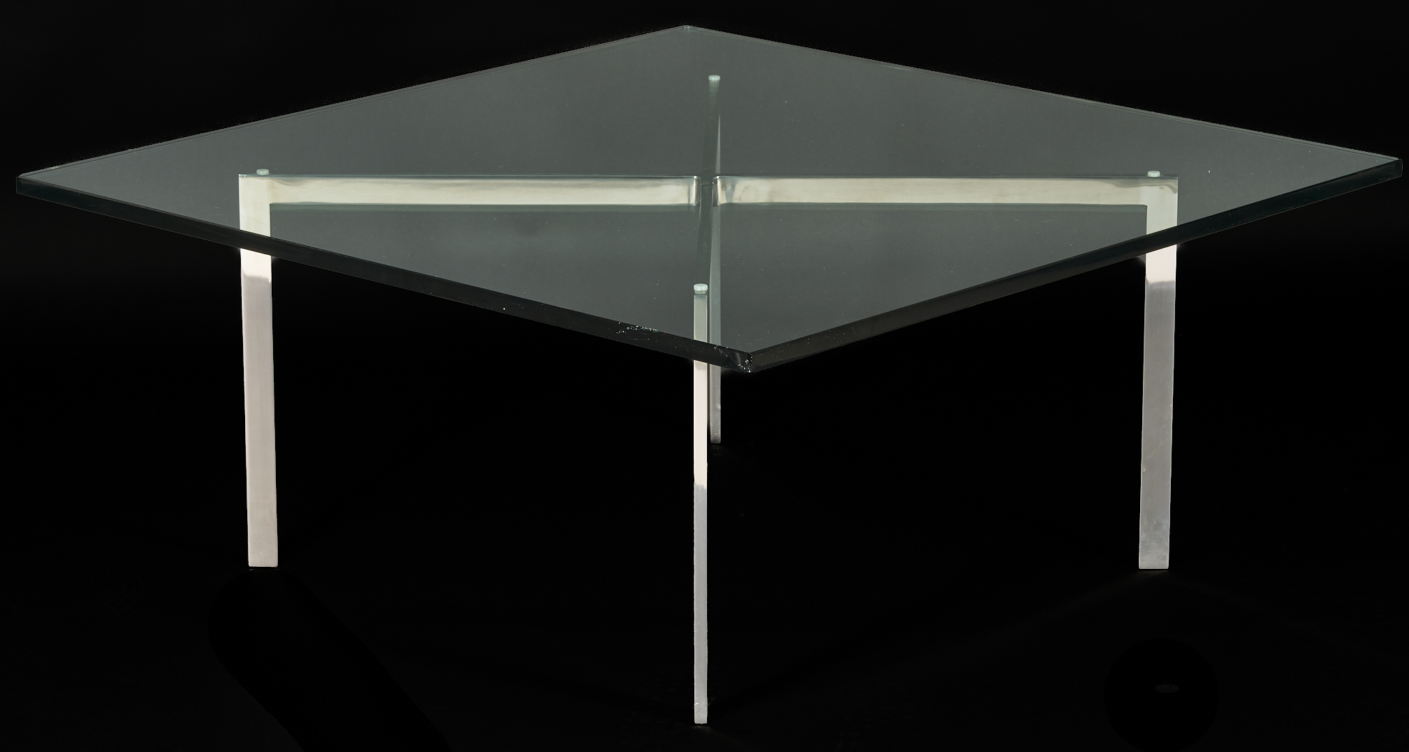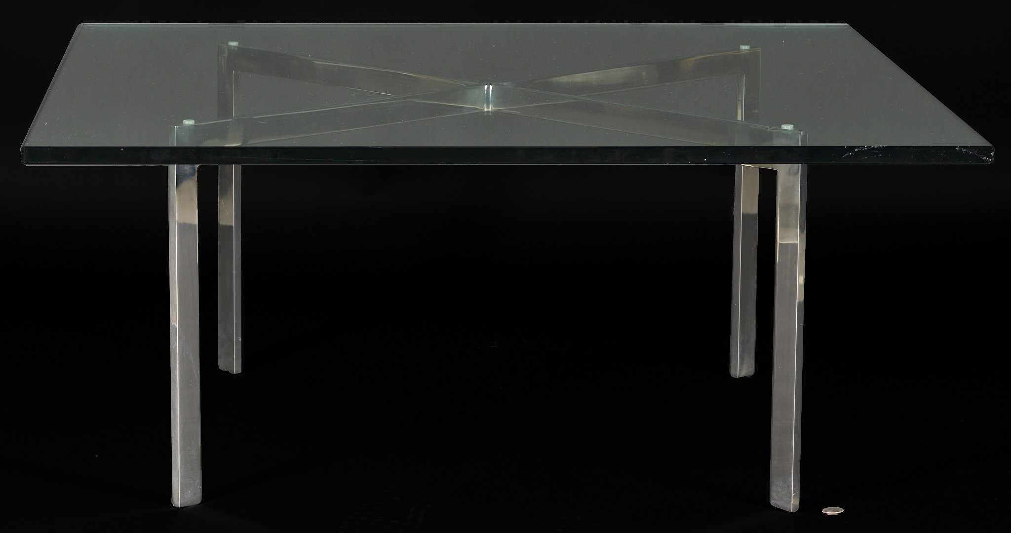 Barcelona Coffee Table, designed by Ludwig Mies van der Rohe (German, 1886-1969) and manufactured by Knoll Industries. Comprised of a thick square glass top with beveled edge resting upon a chrome x-shaped base. 17 1/4″ H x 40″ square. Note: Purchased in 1977.
