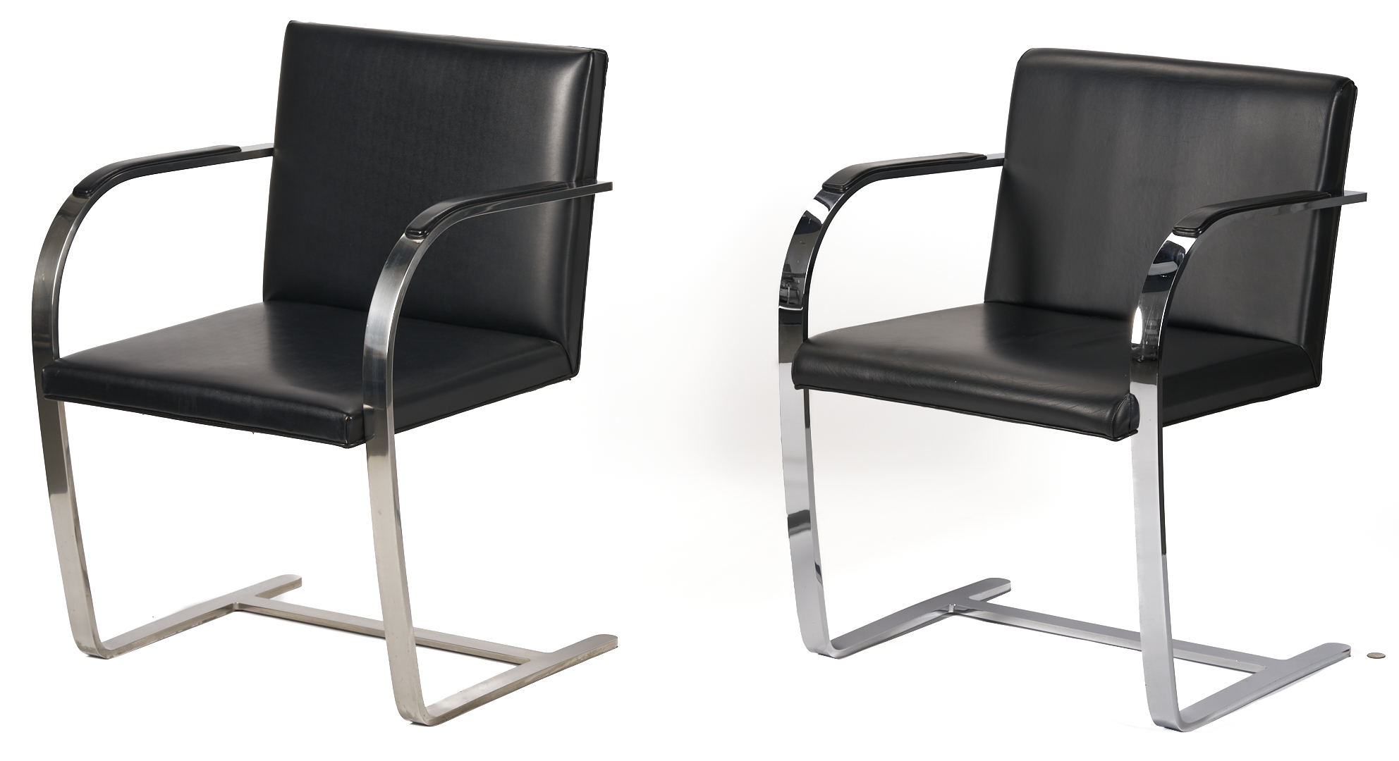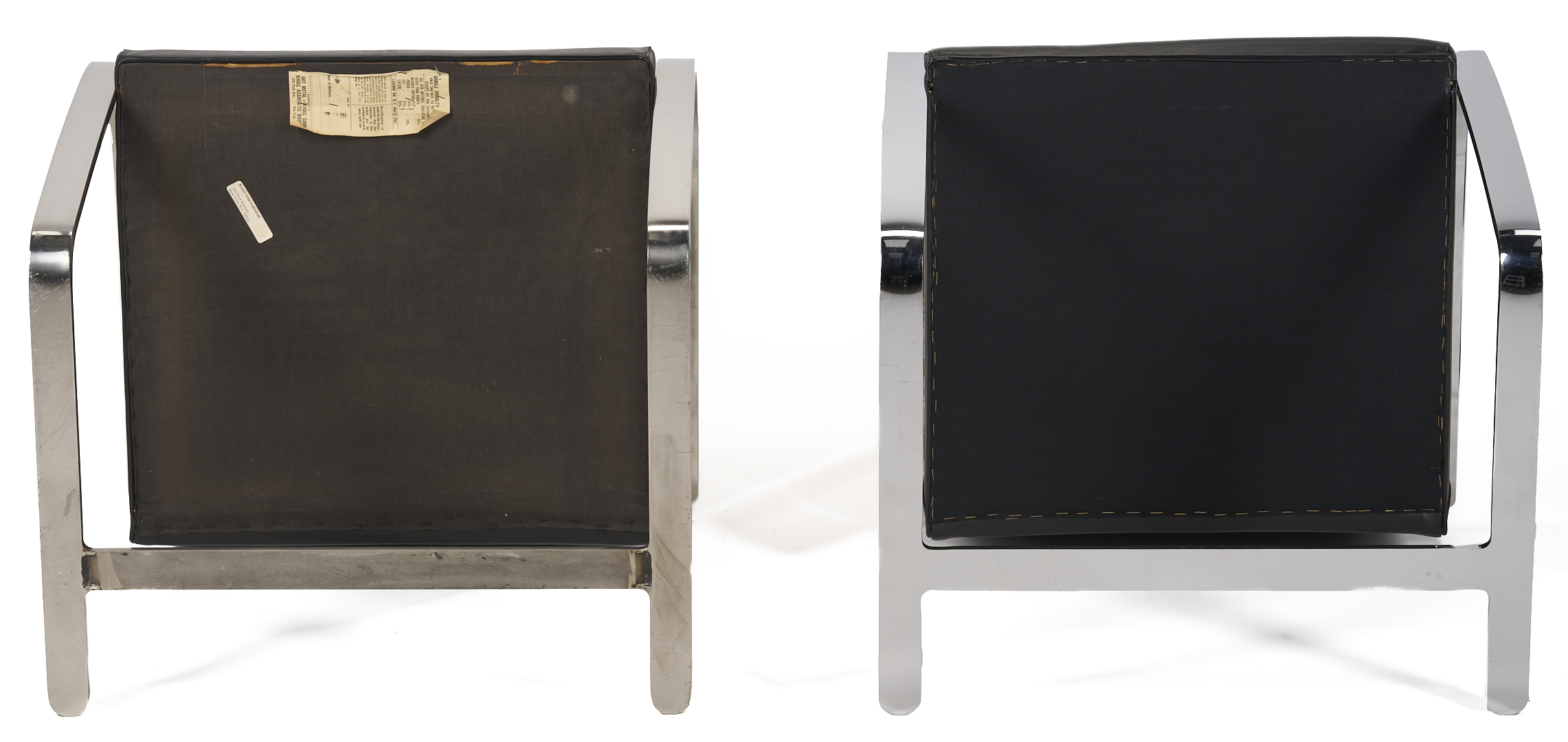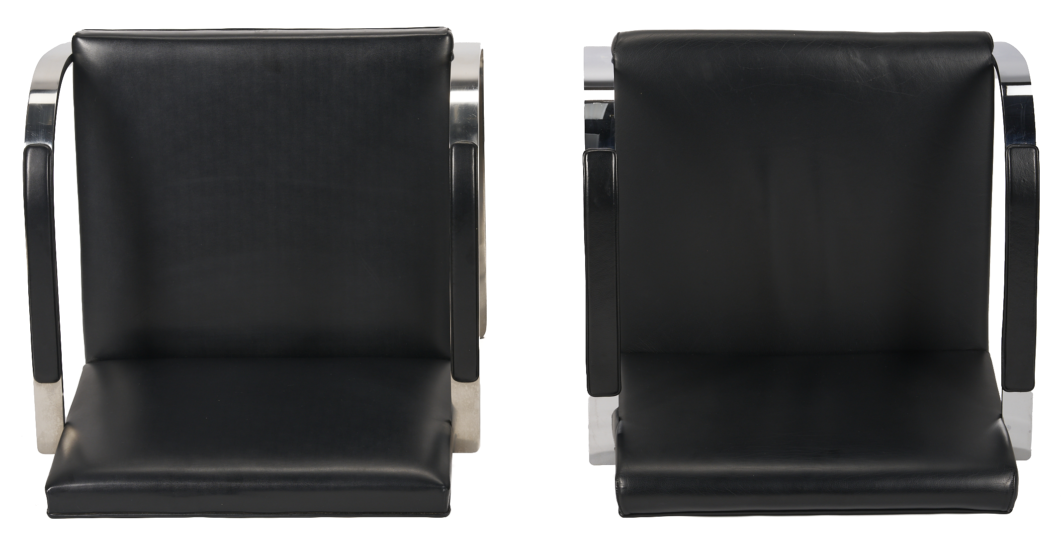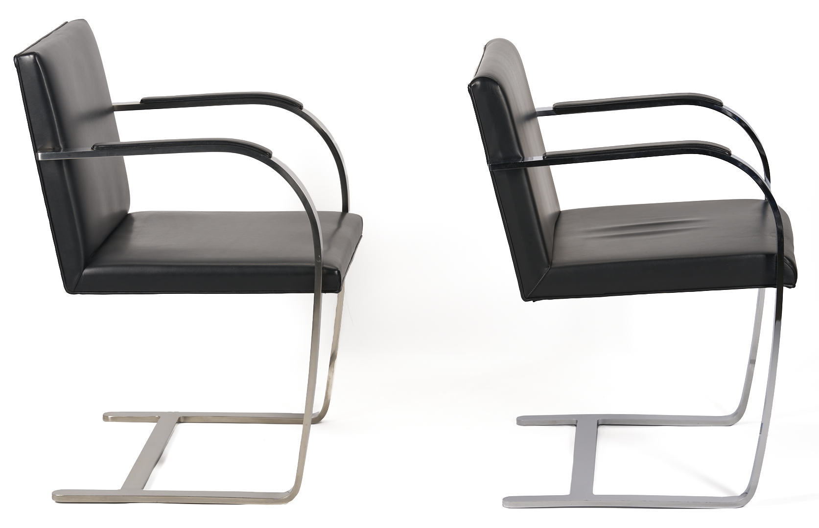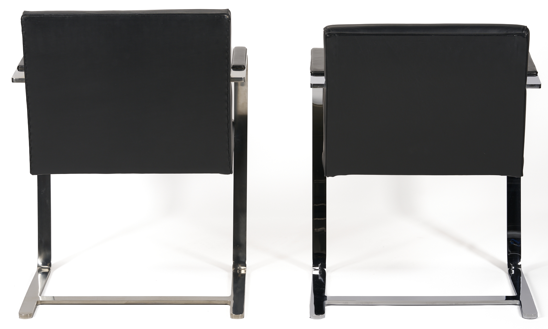 Pair of Knoll International Mid-Century Brno Flat Bar Arm Chairs, originally designed by Ludwig Mies van der Rohe in 1930. Padded black upholstery and stainless steel construction. One chair retains the original Knoll International tags. 30 in. H x 22 1/2 in. W x 20 in. D. Circa 1960s.