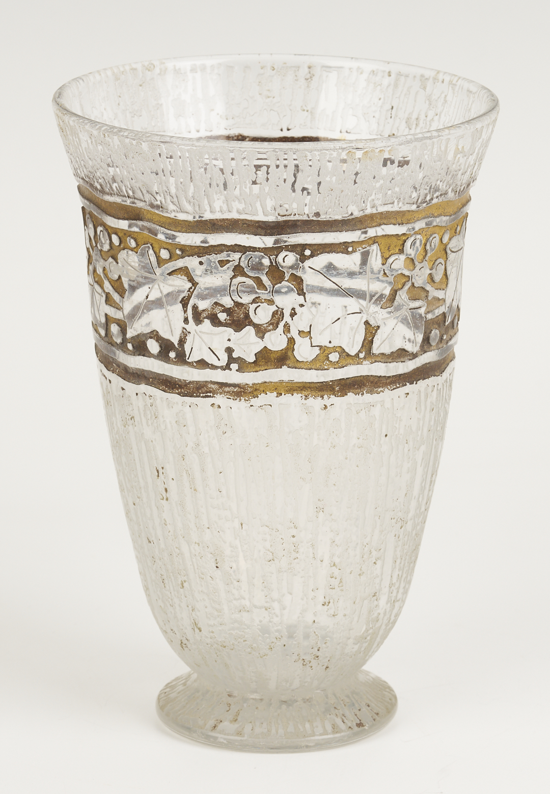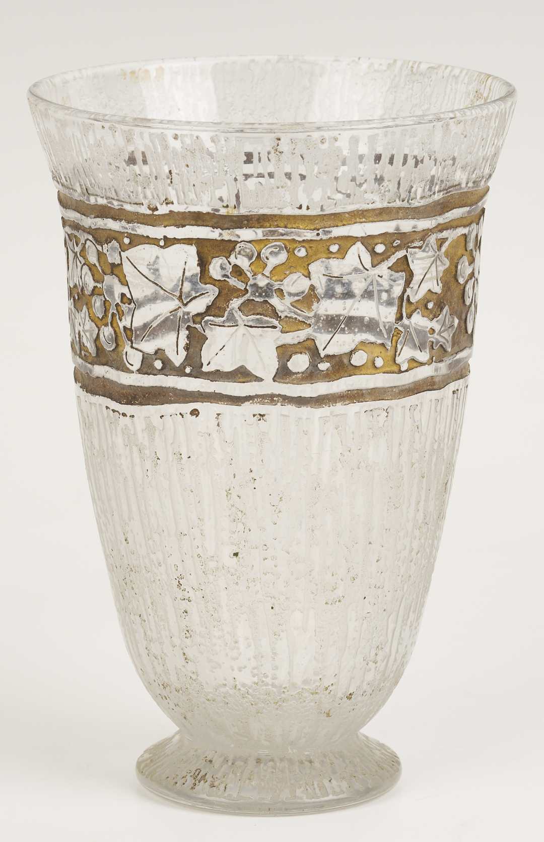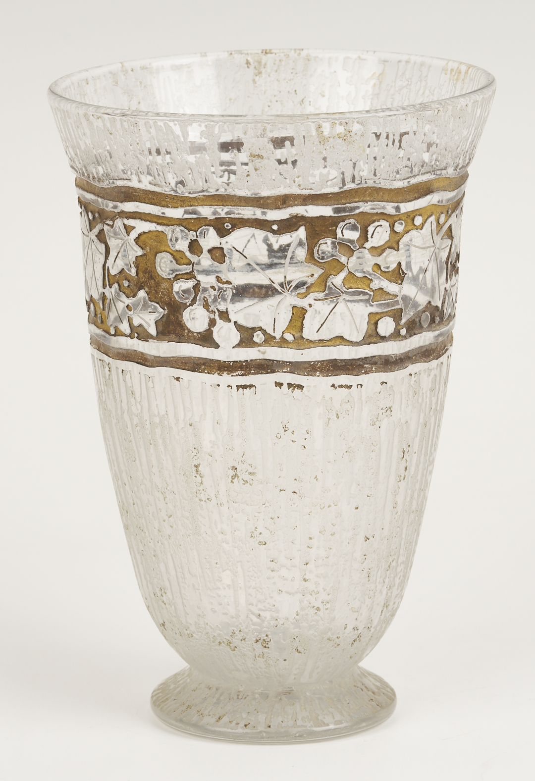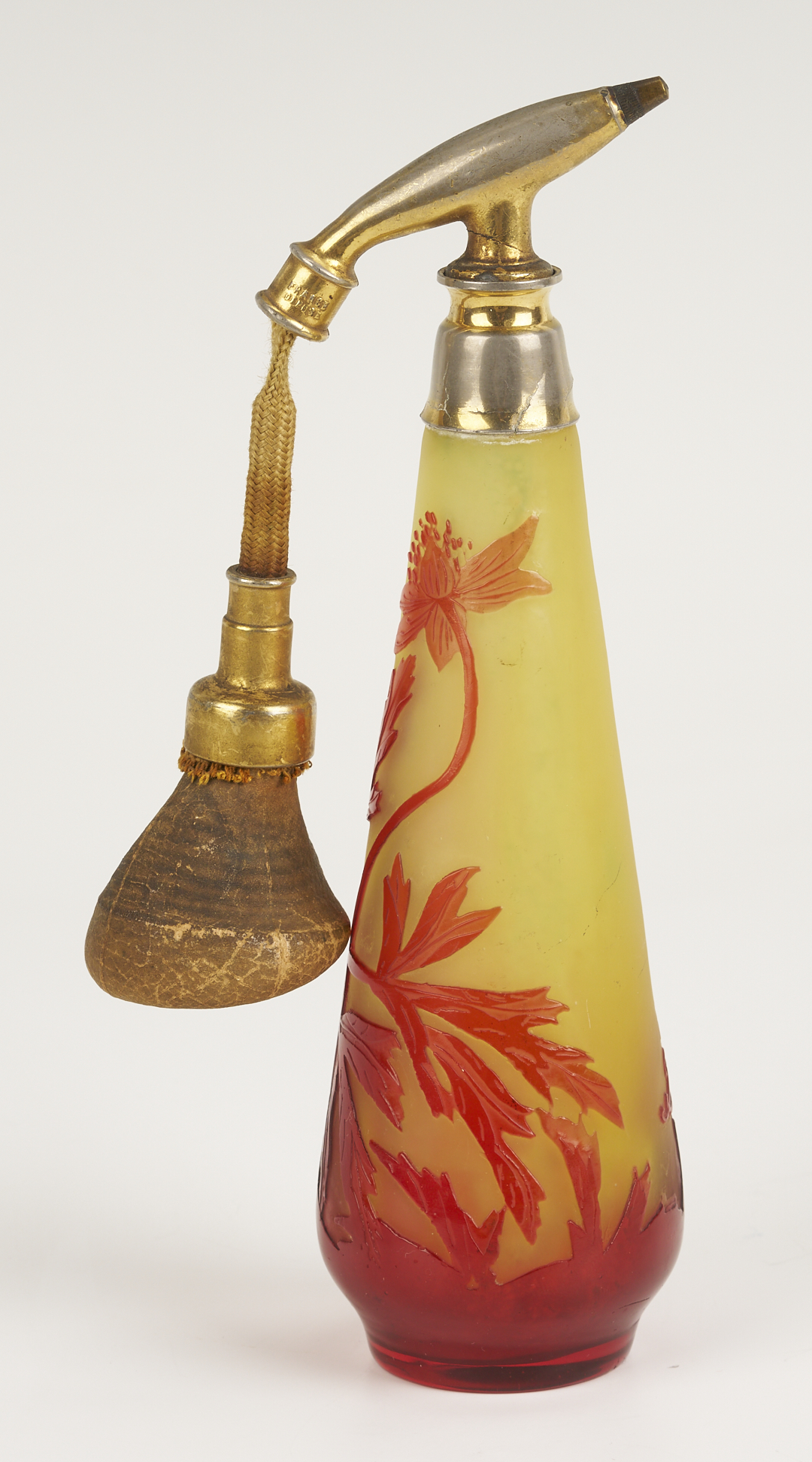 1st item: Galle cameo glass perfume atomizer, red and yellow colors cut in a floral and leaf design. Raised “Galle” signature on the lower body. Atomizer marked “France”. Bottle: 6 1/2 in. H. 7 5/8 in. total H. 1st Qtr. 20th century. 2nd item: Daum Nancy, France, Art Deco beaker form vase with leaf and berry gilt highlighted designs below the rim. Signed on the base. 7 in. H. Circa 1930s.