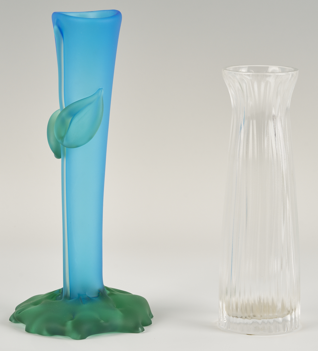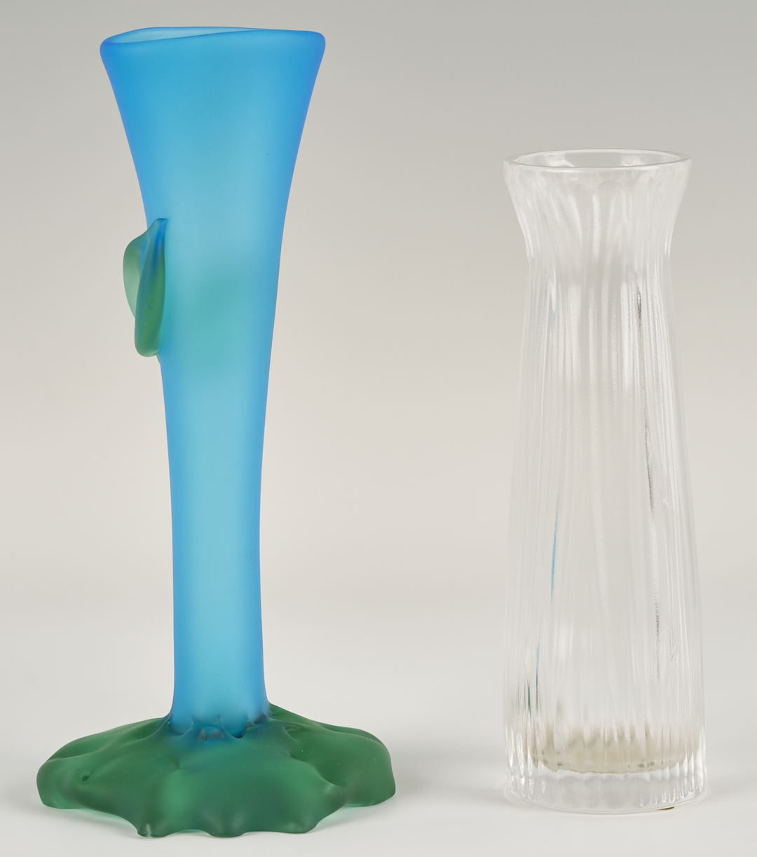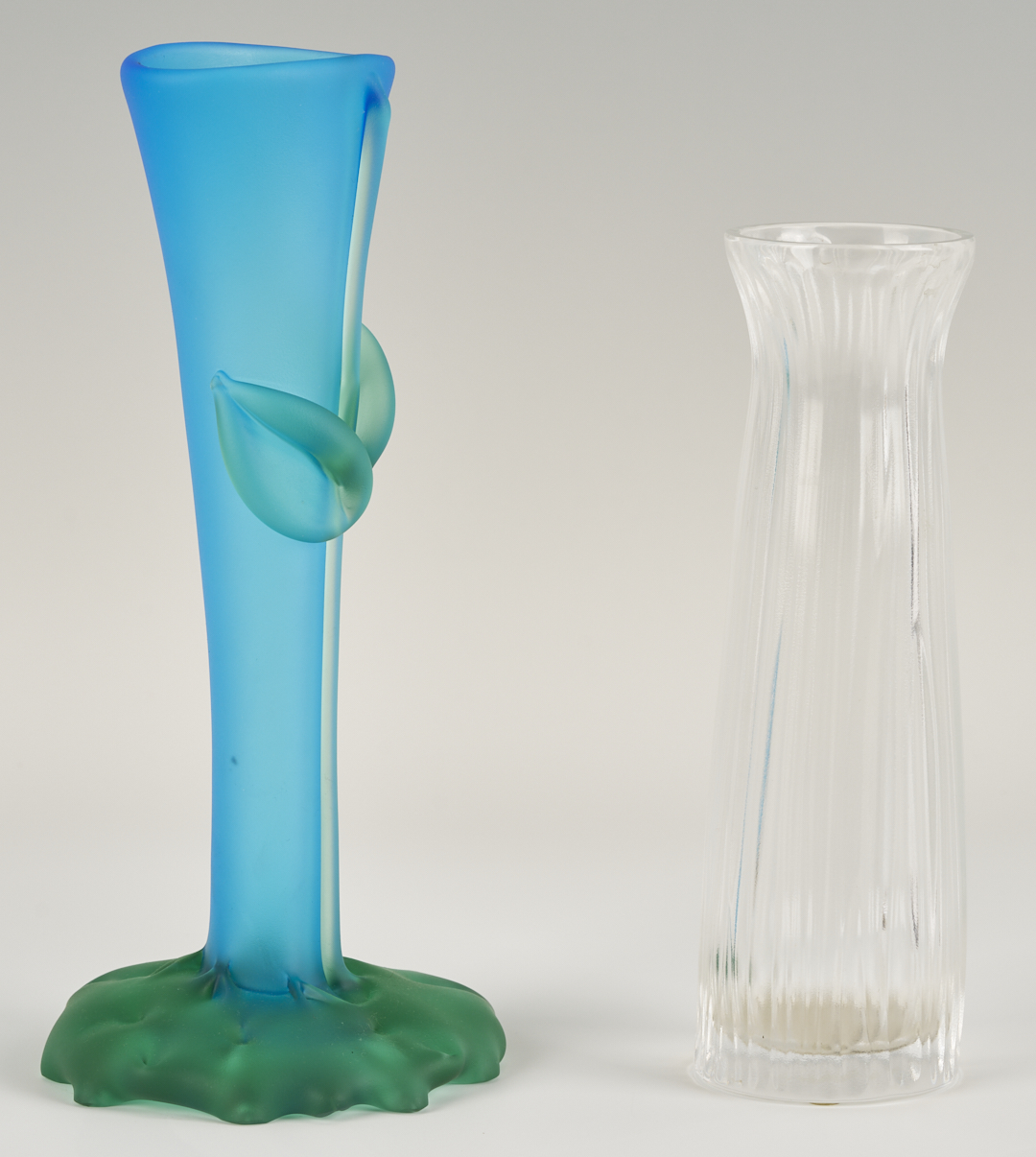 1st item: Tommie Rush (American, born 1954) frosted art glass vase with leaf design to one side and foliate base, in colors of blue and green. Impressed signature on the base. 9 1/2 in. H. 2nd item: Lalique France Brindelle vase with frosted finish and vertical texture. Signed on the base and retains the Lalique label. 8 in. H. Both items are 20th century.