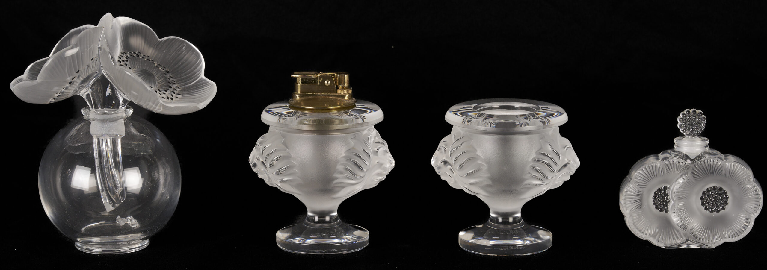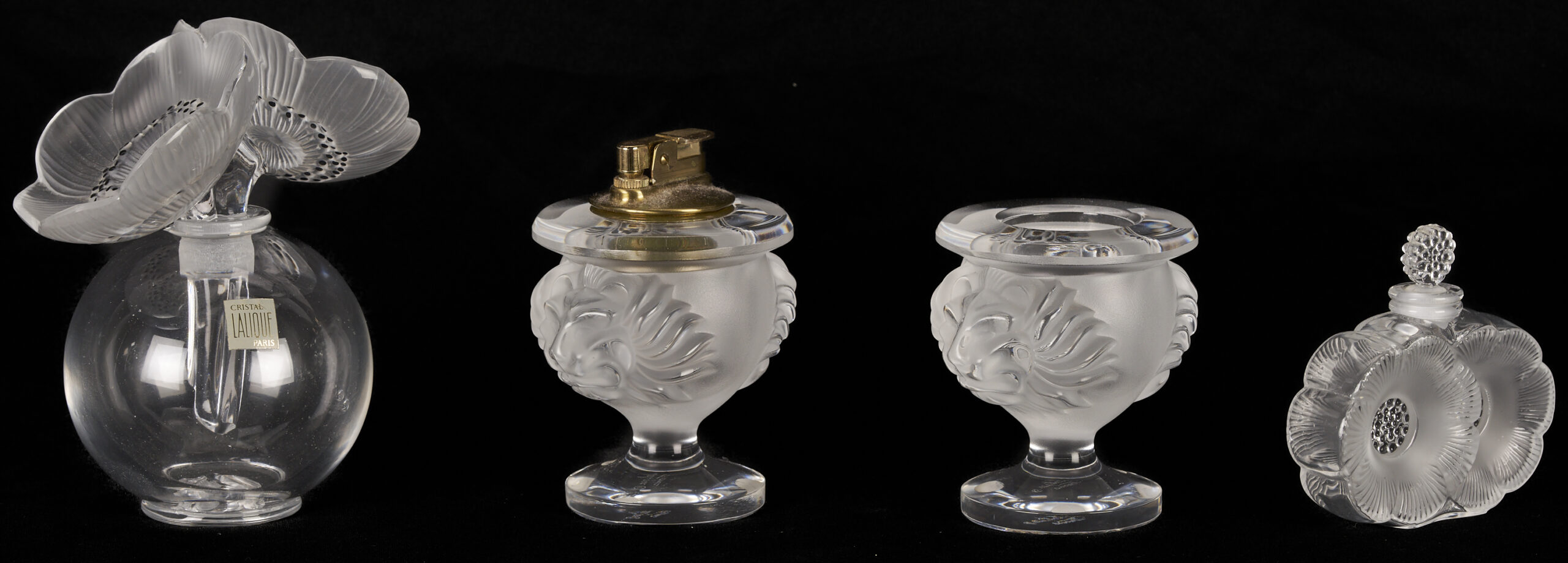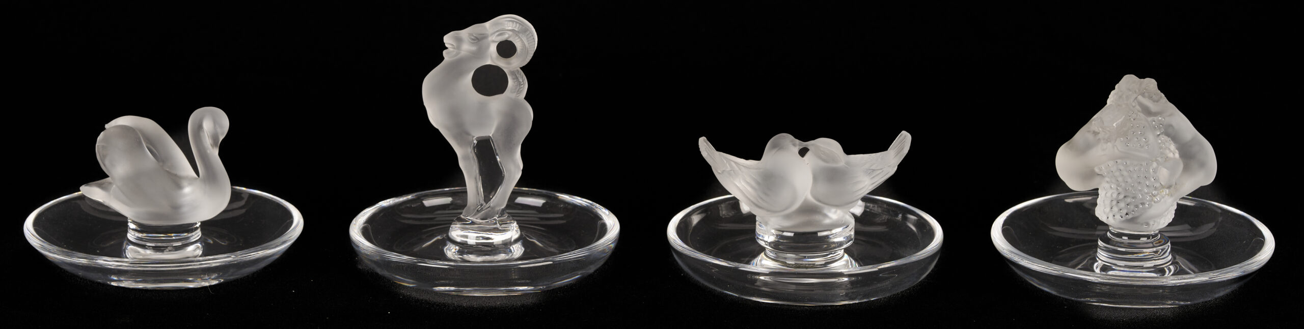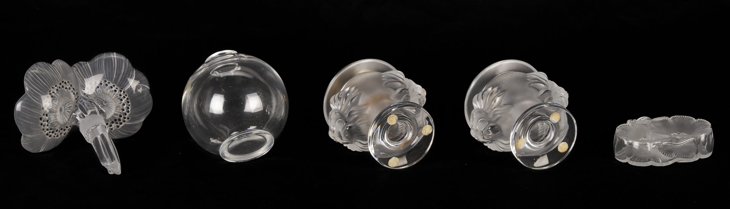 Group of twelve (12) Lalique France frosted and clear crystal items including an “Athena” Coupe bowl, a “Deux Fleurs” perfume bottle, a large “Double Anemone” perfume bottle, a single swan ring or pin tray, a ram ring or pin tray, a love bird ring or pin tray, a “Roxanne” ring or pin tray, a GAO small trinket bowl, a Saint Nicholas trinket dish, a “Tete de Lion” table lighter and cigarette holder set (2), and a “Lion” ashtray. All pieces with etched Lalique marks on bases. Ranging in size from 2 in. H x 3 1/2 in. dia. to 6 1/2 in. H x 5 1/2 in. W. 20th century.