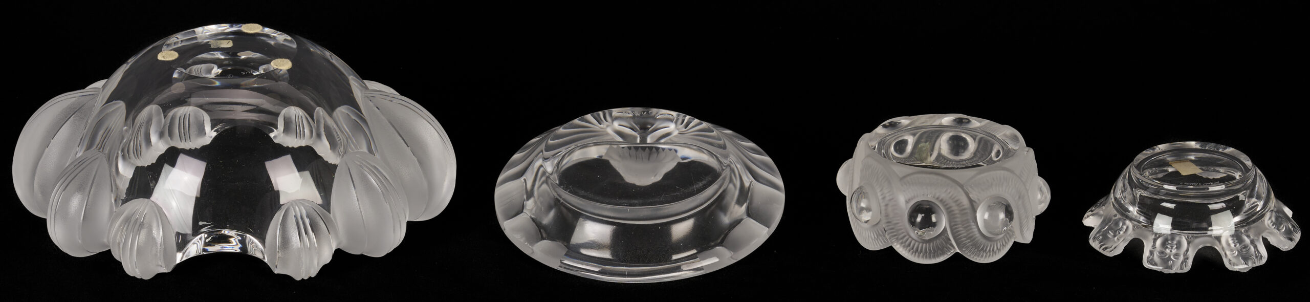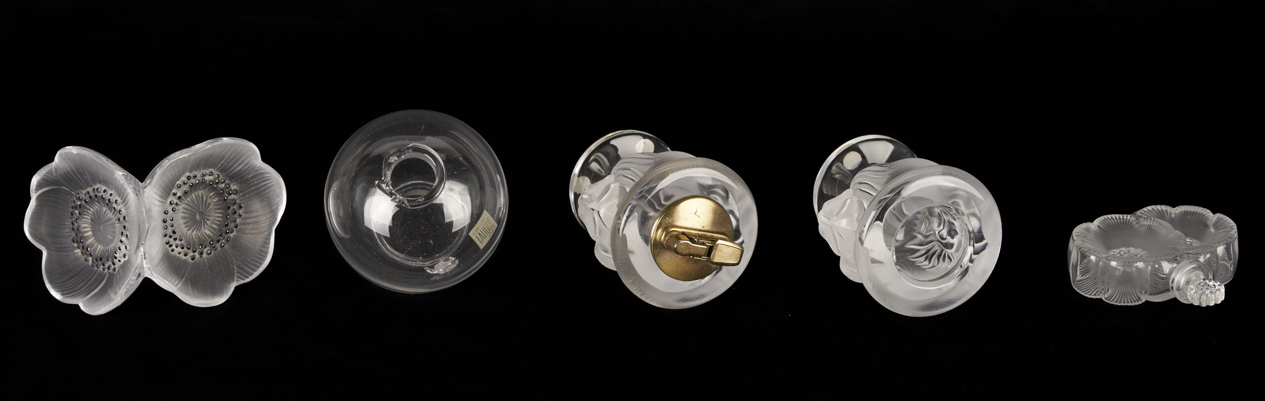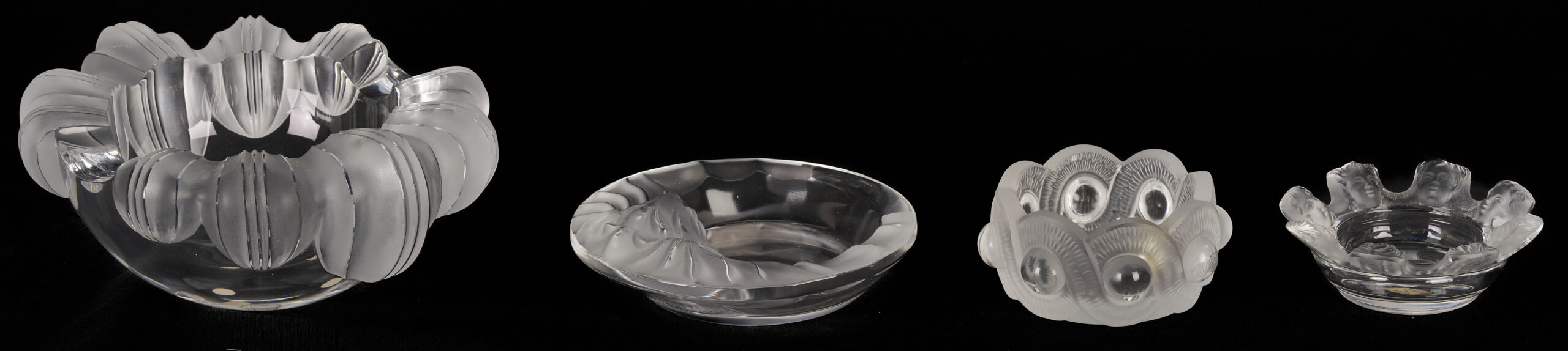 Group of twelve (12) Lalique France frosted and clear crystal items including an “Athena” Coupe bowl, a “Deux Fleurs” perfume bottle, a large “Double Anemone” perfume bottle, a single swan ring or pin tray, a ram ring or pin tray, a love bird ring or pin tray, a “Roxanne” ring or pin tray, a GAO small trinket bowl, a Saint Nicholas trinket dish, a “Tete de Lion” table lighter and cigarette holder set (2), and a “Lion” ashtray. All pieces with etched Lalique marks on bases. Ranging in size from 2 in. H x 3 1/2 in. dia. to 6 1/2 in. H x 5 1/2 in. W. 20th century.