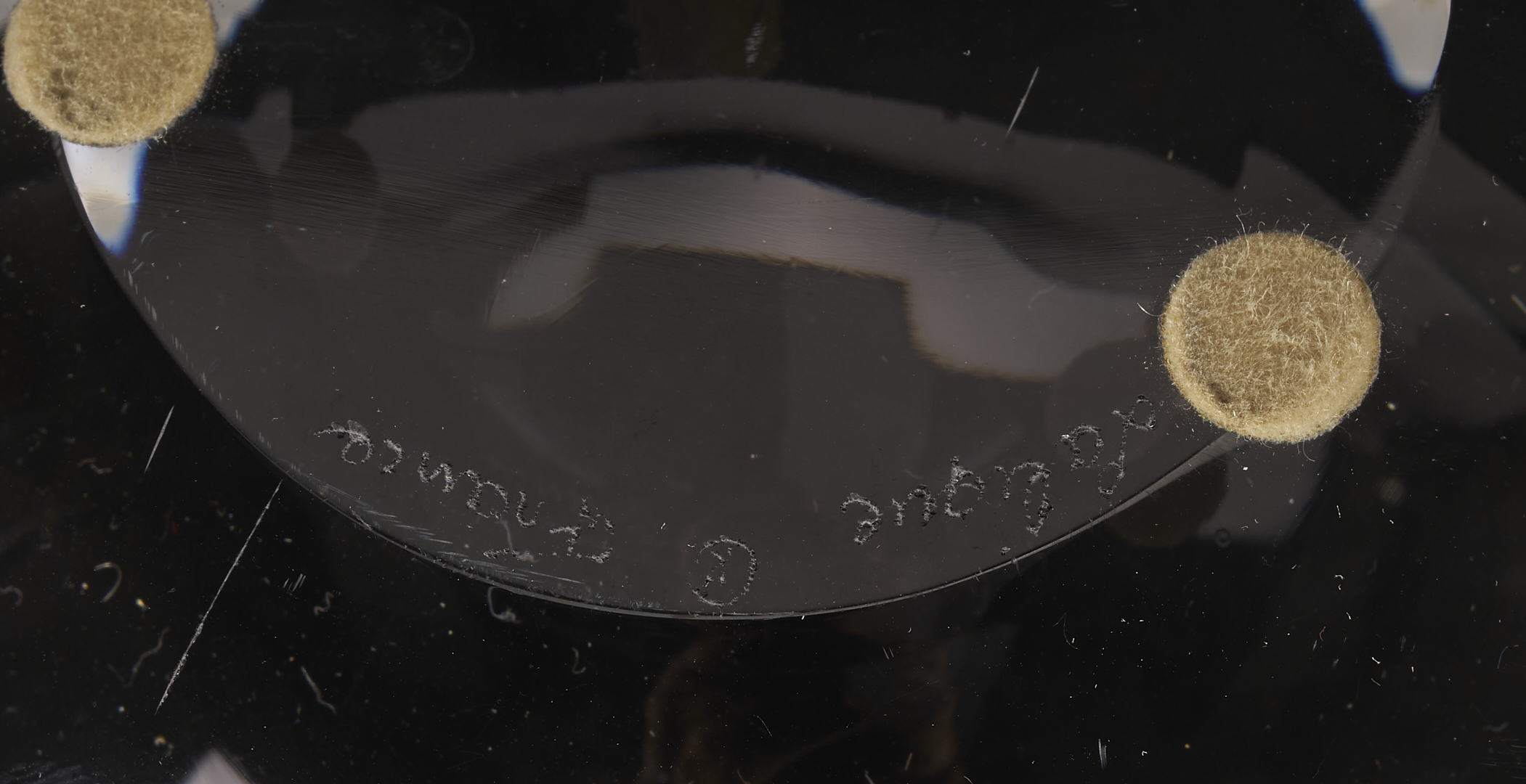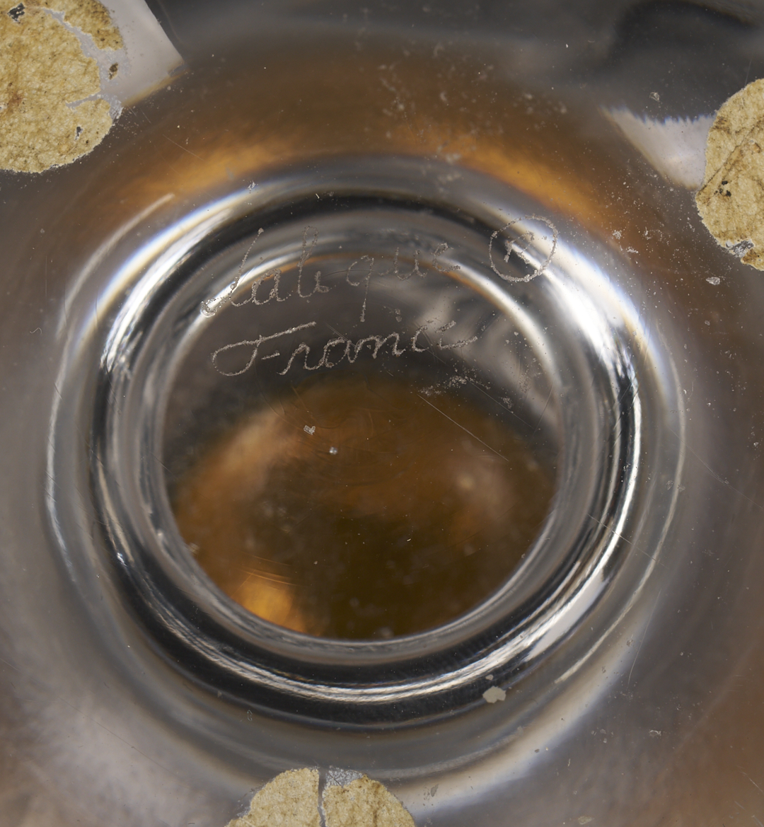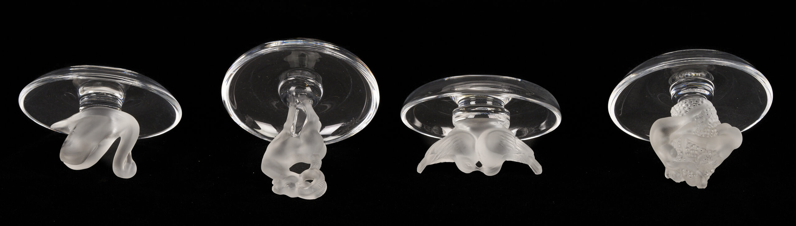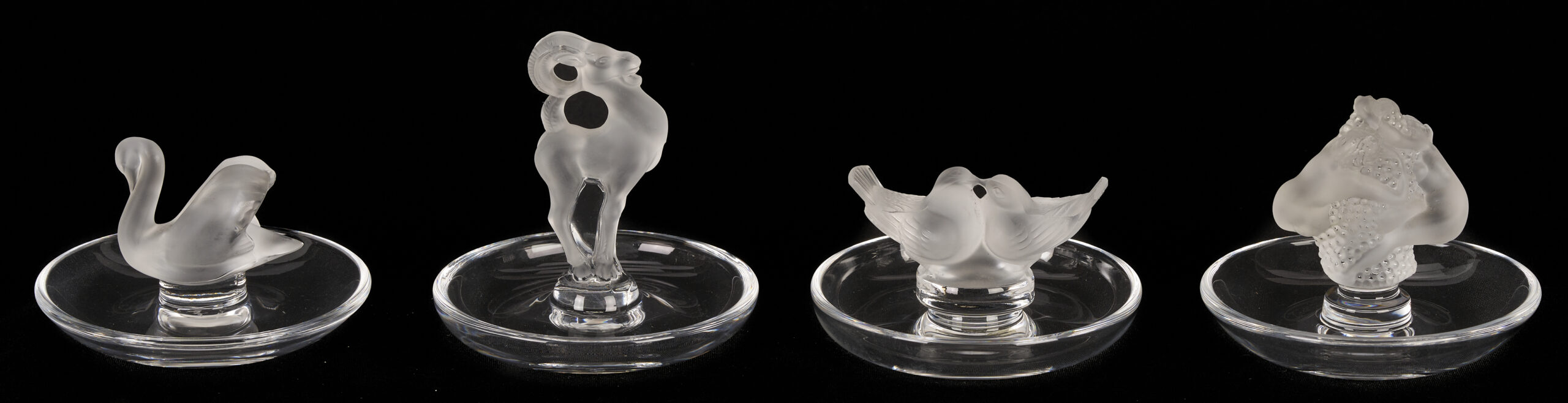 Group of twelve (12) Lalique France frosted and clear crystal items including an “Athena” Coupe bowl, a “Deux Fleurs” perfume bottle, a large “Double Anemone” perfume bottle, a single swan ring or pin tray, a ram ring or pin tray, a love bird ring or pin tray, a “Roxanne” ring or pin tray, a GAO small trinket bowl, a Saint Nicholas trinket dish, a “Tete de Lion” table lighter and cigarette holder set (2), and a “Lion” ashtray. All pieces with etched Lalique marks on bases. Ranging in size from 2 in. H x 3 1/2 in. dia. to 6 1/2 in. H x 5 1/2 in. W. 20th century.