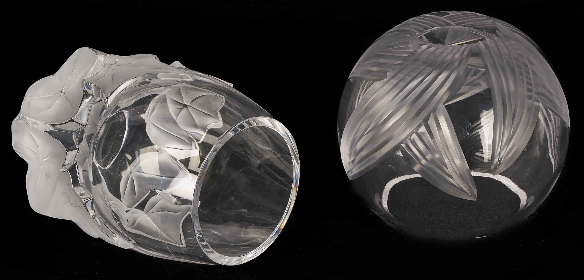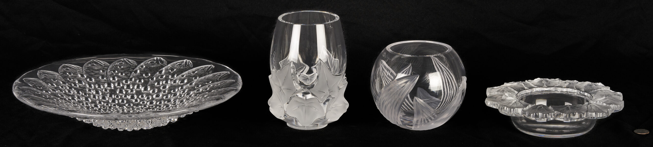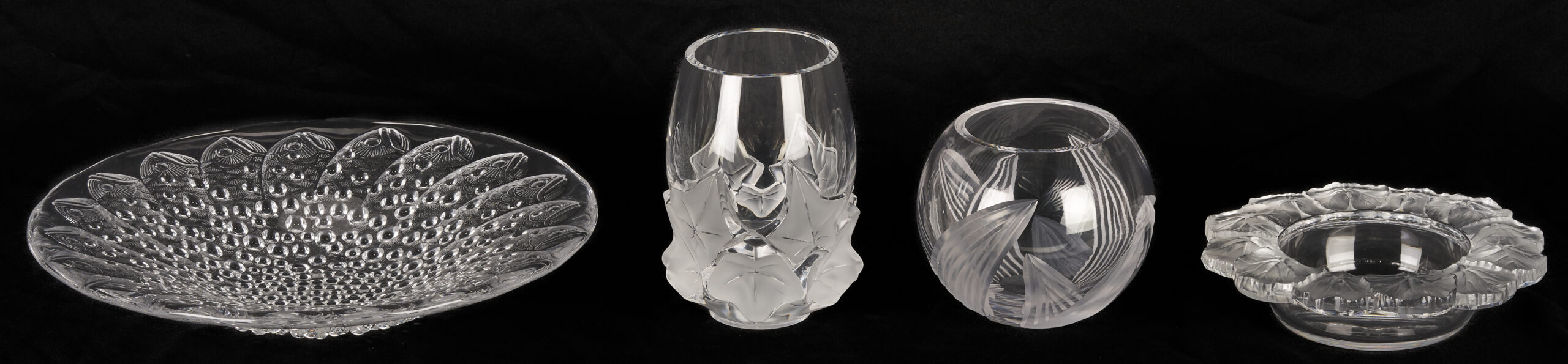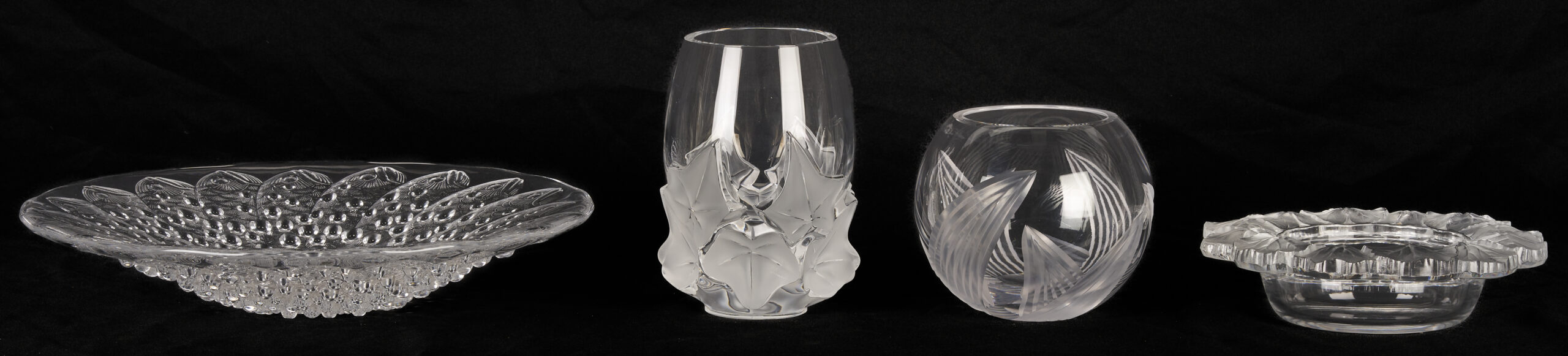 Grouping of four (4) clear crystal table items, including a French Lalique crystal Roscoff Koi Fish Bubbles coupe/ bowl, a French Lalique Honfleur Geranium crystal bowl or wine holder, a French Lalique “Hedera” Ivy Leaf frosted vase, and a vintage Astral frosted leaf bowl. All Lalique items with the engraved signature mark “Lalique France” on the underside. Ranging in size from 2 1/4 in. H x 8 1/2 in. dia. to 2 1/2 in. H x 14 in. dia. 20th century.