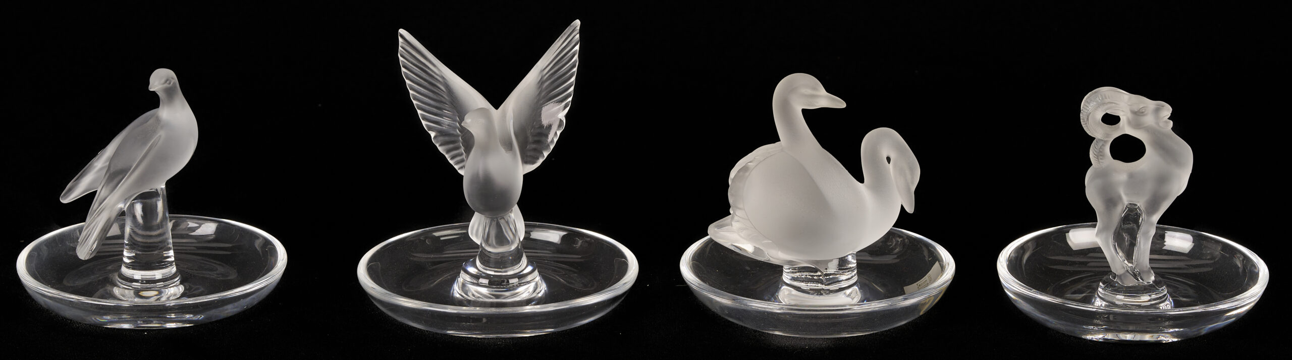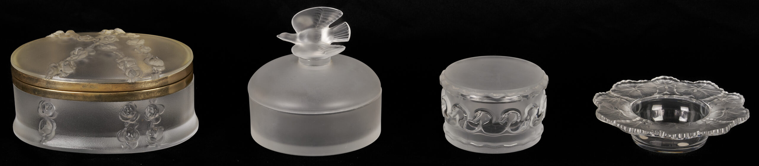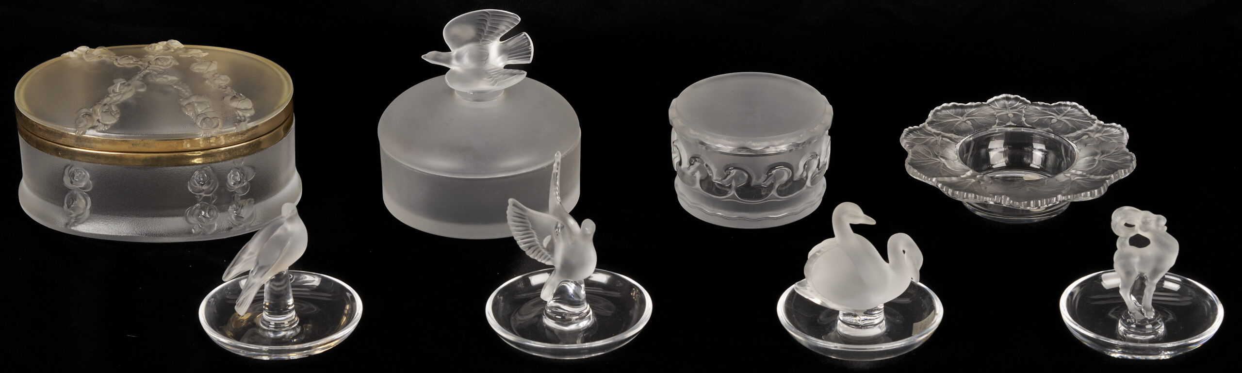 Grouping of eight (8) Lalique France clear and frosted crystal items, including a Coppelia dresser box, a Nina Ricci du L’air Temps powder box, a Cannards (Swan) round lidded box, a Honfleur small bowl with geranium leaf rim, four (4) ring or pin trays including a ram, double swan, bird, and bird with outstretched wings. All pieces with etched Lalique marks on bases. Ranging in size from 3 3/8 in. H x 3 3/4 in. dia. to 3 1/2 in. H x 7 in. W x 5 1/2 in. D. 20th century.