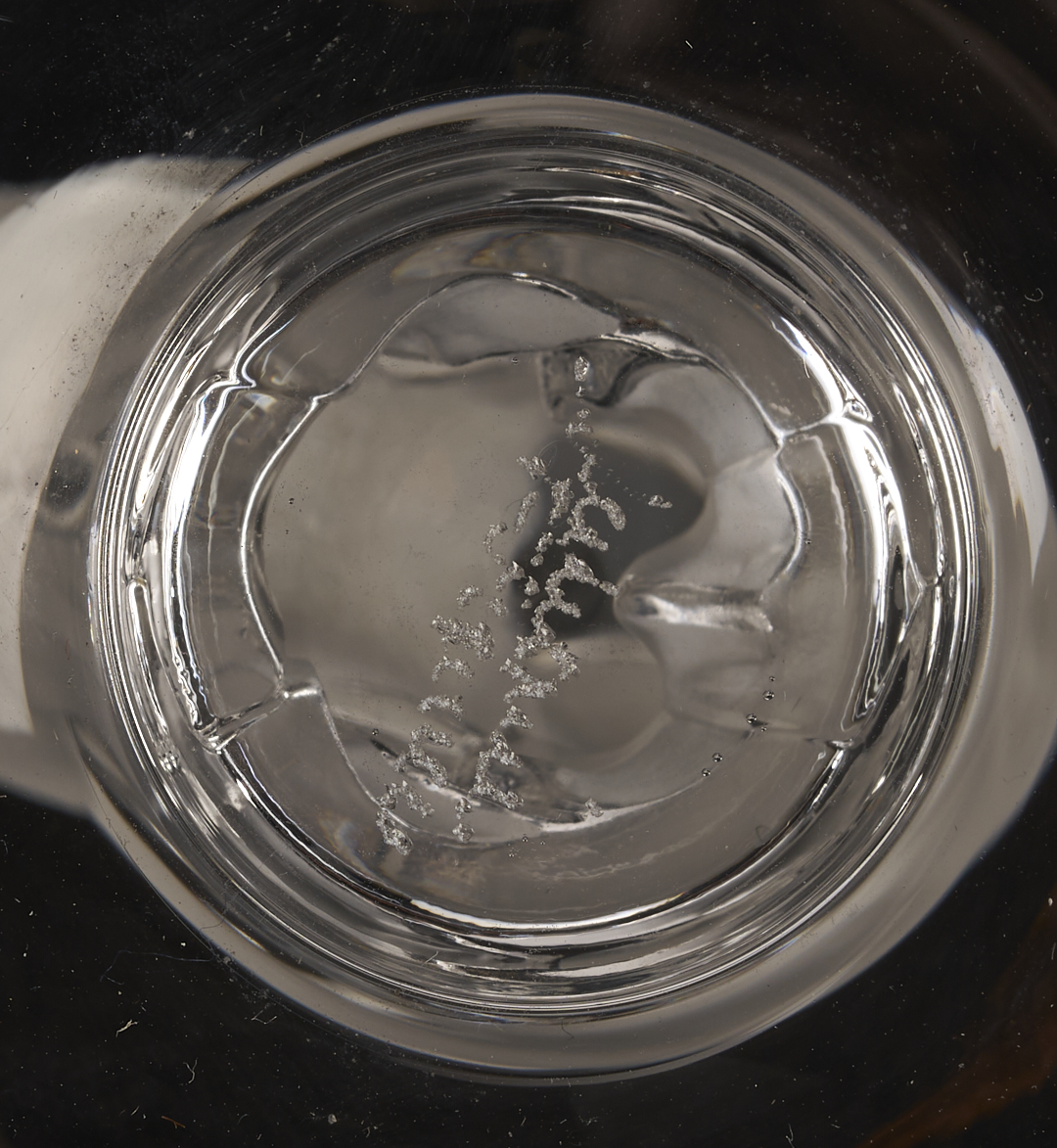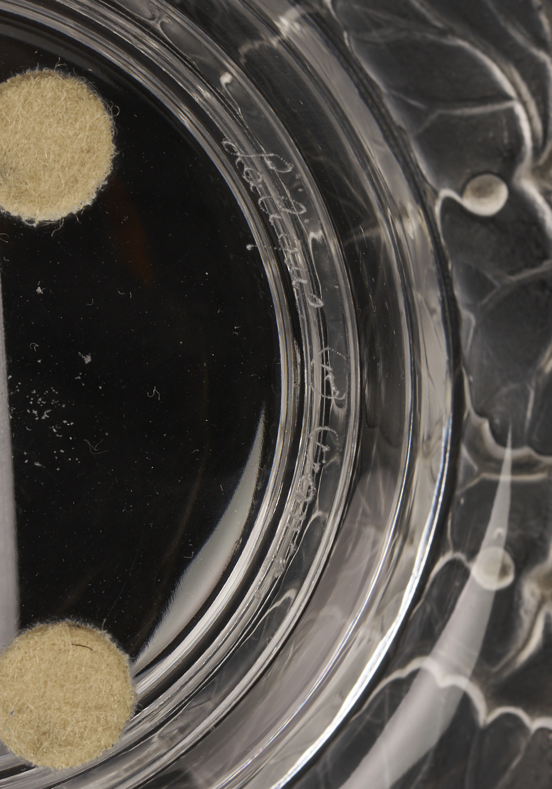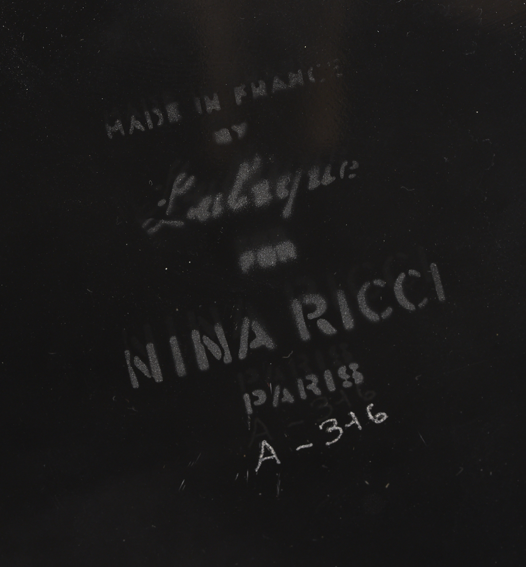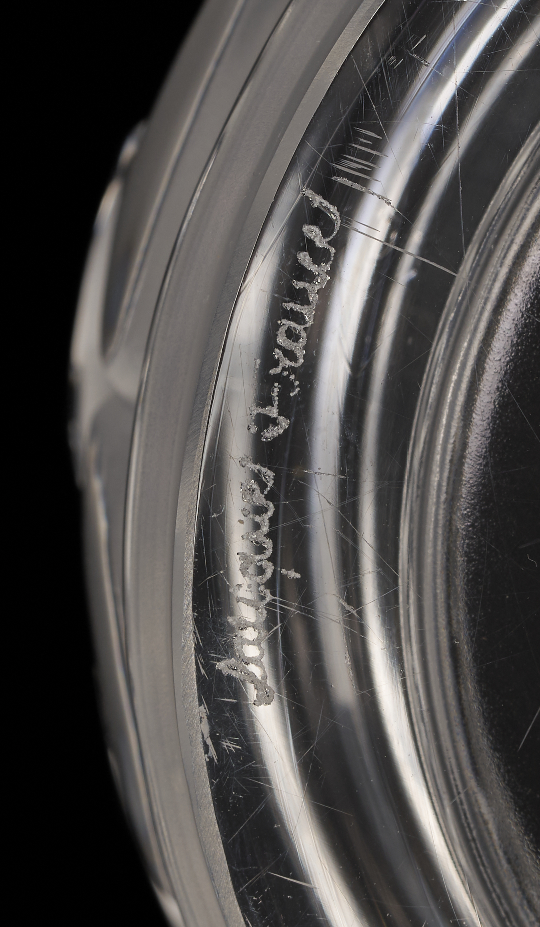 Grouping of eight (8) Lalique France clear and frosted crystal items, including a Coppelia dresser box, a Nina Ricci du L’air Temps powder box, a Cannards (Swan) round lidded box, a Honfleur small bowl with geranium leaf rim, four (4) ring or pin trays including a ram, double swan, bird, and bird with outstretched wings. All pieces with etched Lalique marks on bases. Ranging in size from 3 3/8 in. H x 3 3/4 in. dia. to 3 1/2 in. H x 7 in. W x 5 1/2 in. D. 20th century.