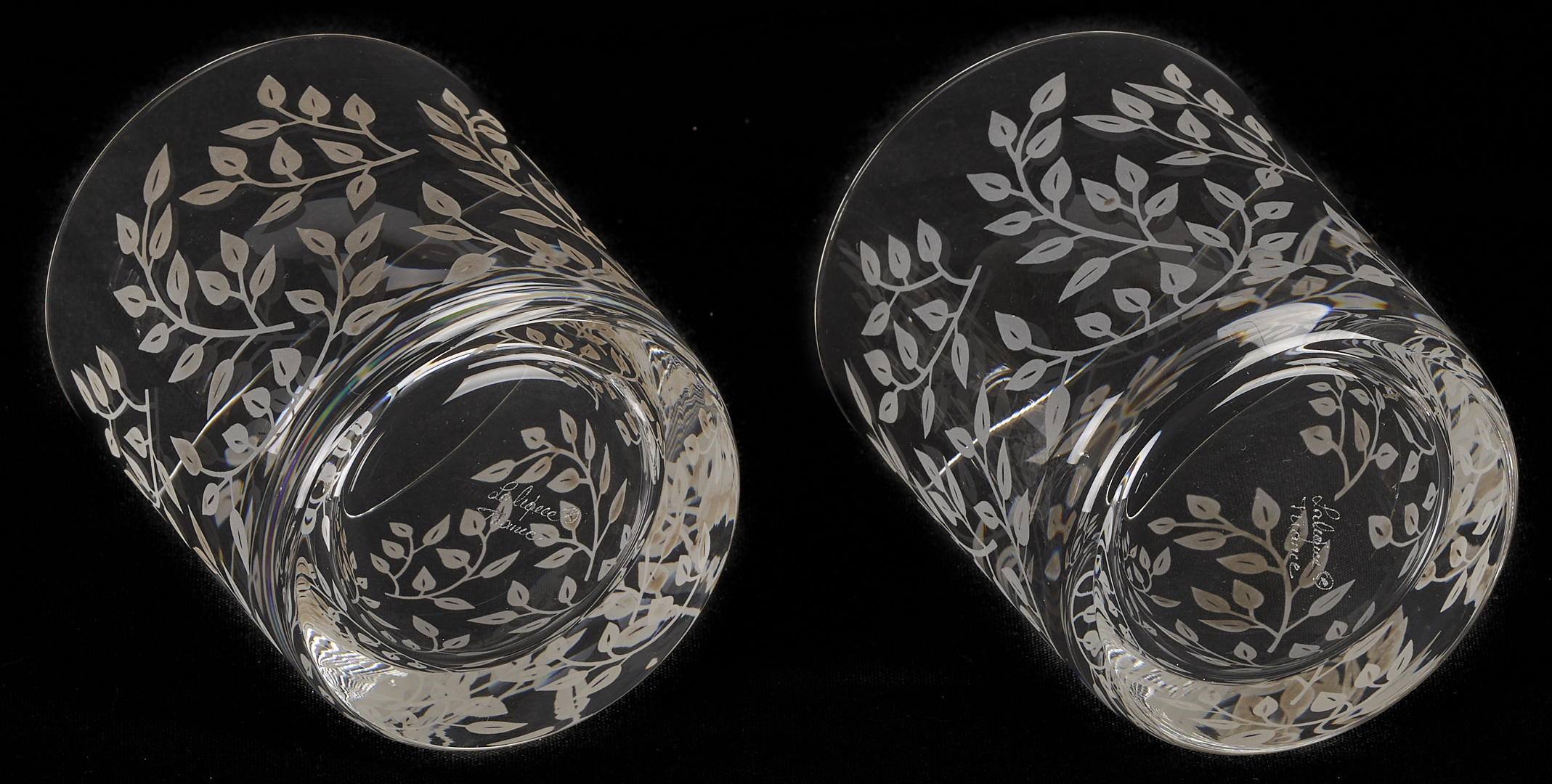 Set of eleven (11) Lalique crystal tumblers or Old Fashioned glasses in Liane Doree pattern, with frosted tree branches and leaves. Each signed “Lalique, France” to the base. 3 in. D x 3 5/8 in. H.