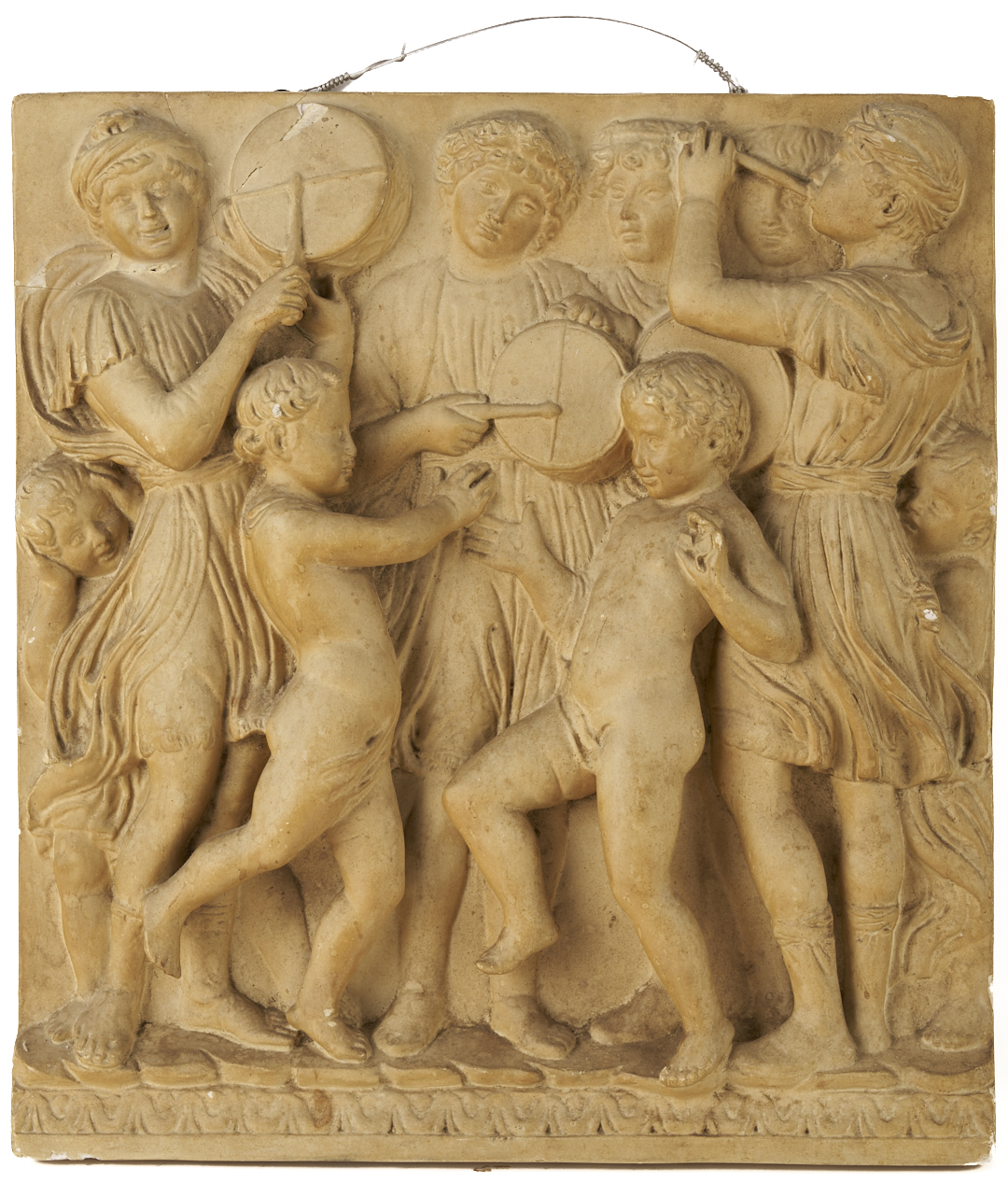 Pair of Classical plaster bas-relief plaque reproductions depicting the Choir of Luca della Robbia (1400 – 1482) originally in the Cathedral of Santa Maria del Fiore, Florence, Italy. Unsigned but attributed to Pietro P. Caproni & Brother (Boston, circa 1890s – 1960s). Both depict various figures and putti dancing and playing instruments. 20 in. H x 18 in. W x 3 1/4 in. D each. Early 20th century.