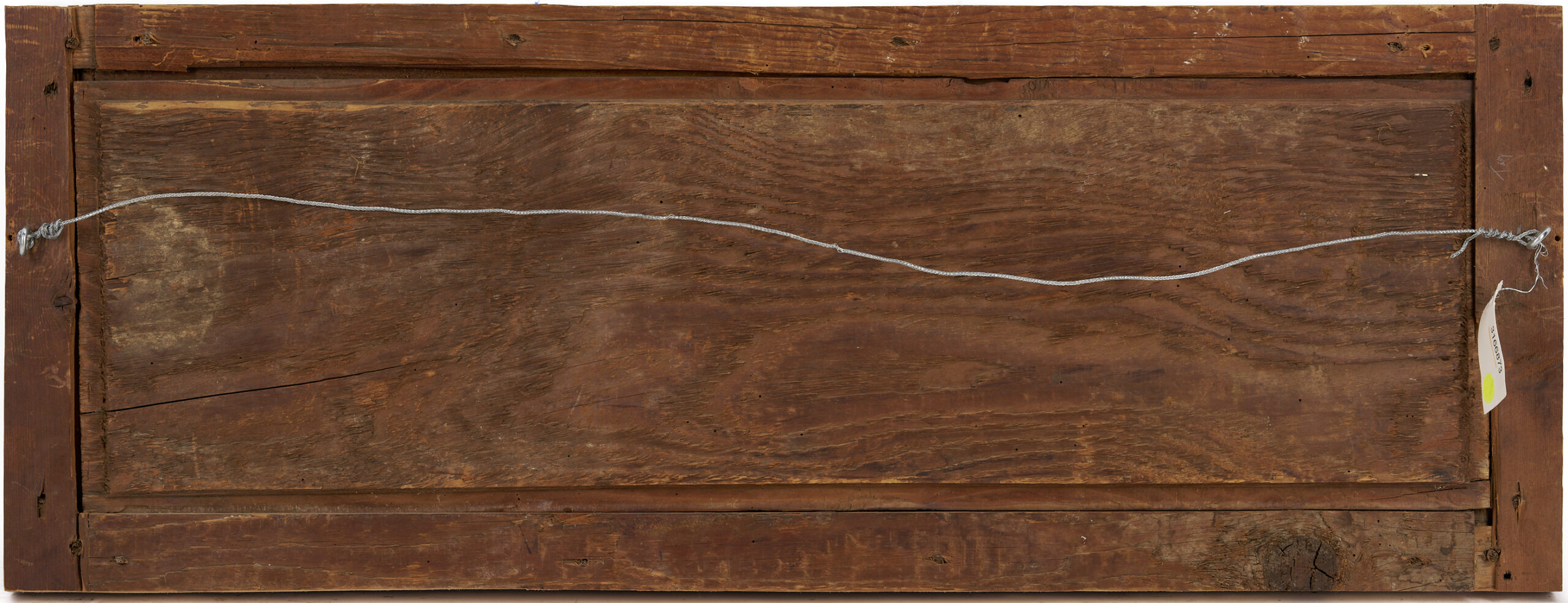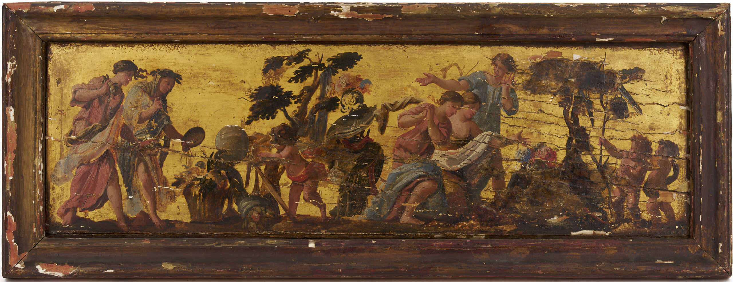 Continental school fresco painting on plaster laid to panel, possibly an allegory of painting. An artist at left holds a palette and paintbrushes and is accompanied by a woman as they walk toward a central putto. Three figures admire an object — possibly a painting shown partially from behind — that rests on the ground, with two other putto at right. All set against a gilt background. Housed in a wooden frame with remnants of gilt. Sight: 10 1/2 in. H x 35 in. W. Framed: 15 in. H x 39 1/2 in. W. Likely French or Italian, cIrca 1800 or earlier.
