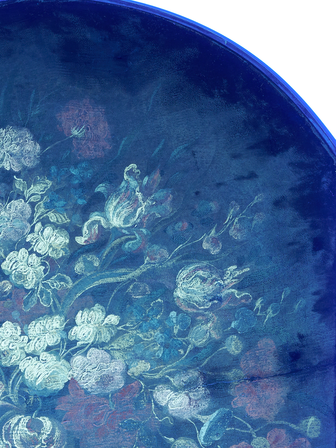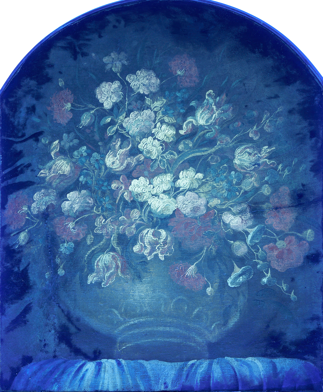 Dutch School oil on canvas painting (laid to board), depicting an abundant bouquet of assorted flowers in an urn, resting on a blue draped surface, set against a black ground. Housed in a simple arched wood frame. Unsigned. 35 1/4 in. H x 29 in. W. 35 3/4 in. H x 29 1/2 in. W. 19th century or earlier.