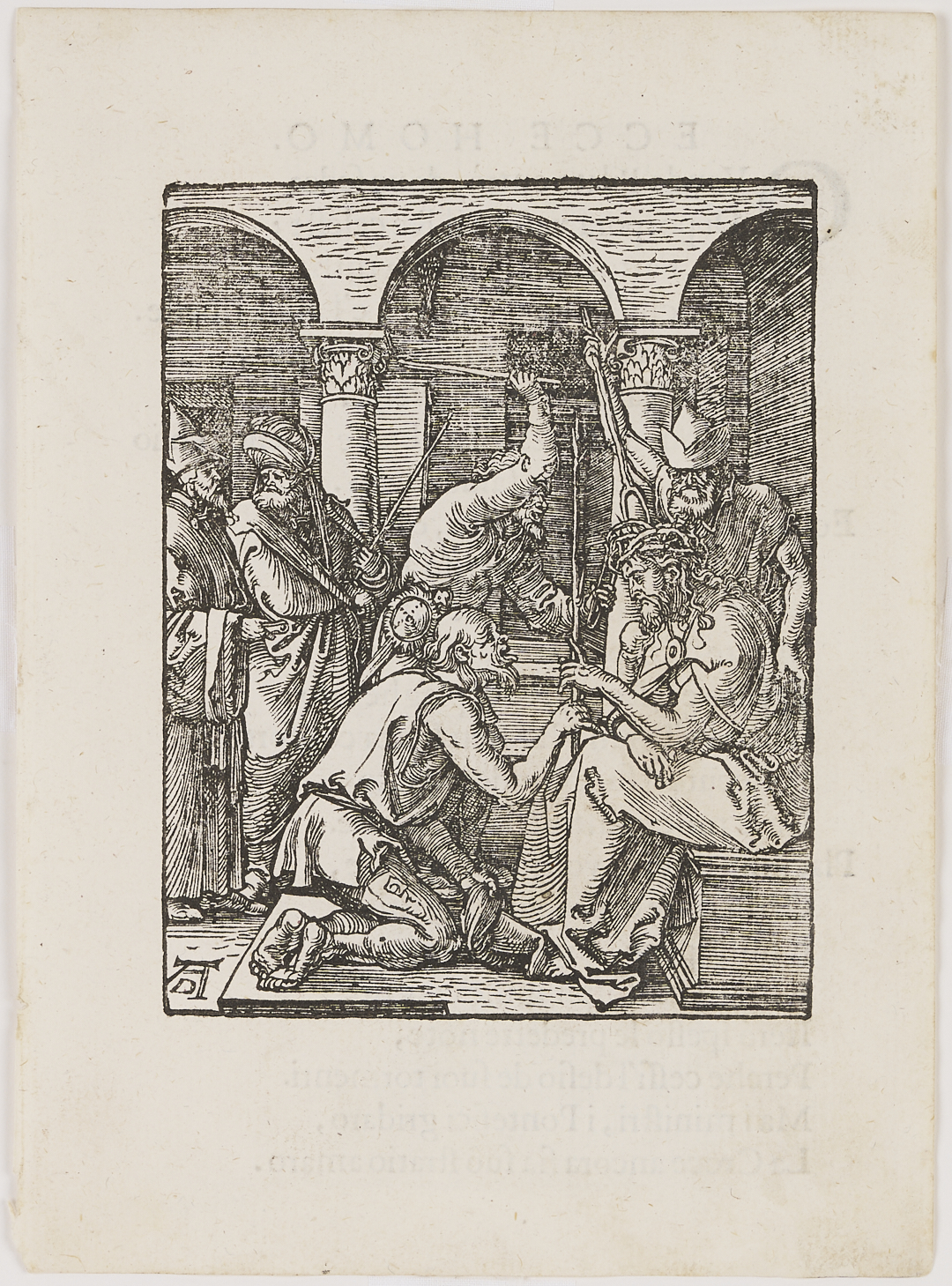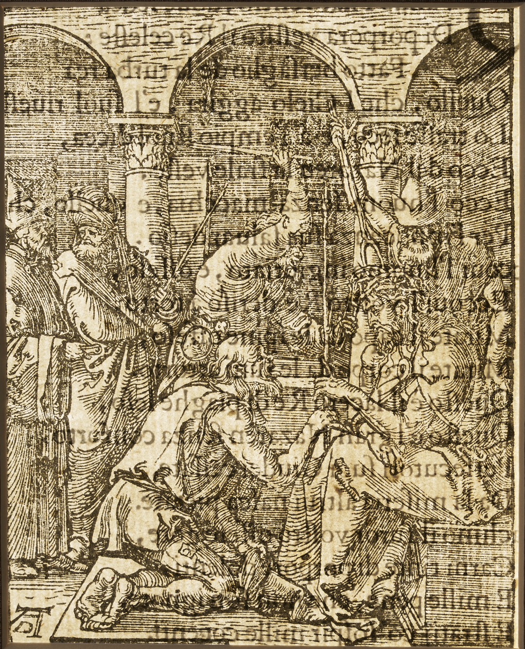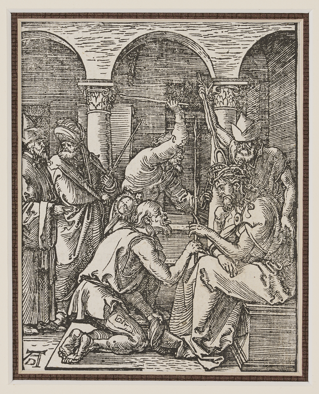 Albrecht Durer (German, 1471-1528) woodcut on laid paper, “Christ Crowned with Thorns” from The Small Passion, c. 1508-10. From the 1612 Italian text edition published by Daniel Bissuccio, Venice. Mongrammed in the plate, lower left. Ref.: Bartsch 34, Meder 143. Housed in a window mat with recto and verso openings and brown and gold reveal. Sight: 4 13/16 in. H x 3 13/16 in. W. Mat: 16 15/16 in. H x 15 7/8 in. W.