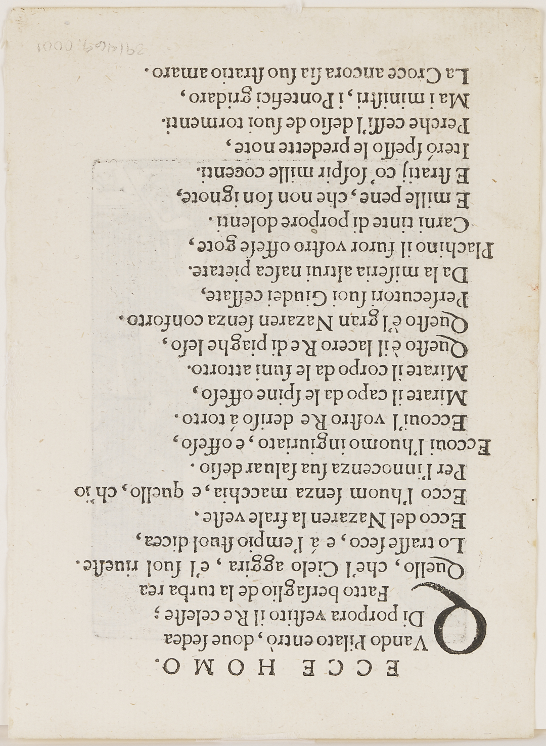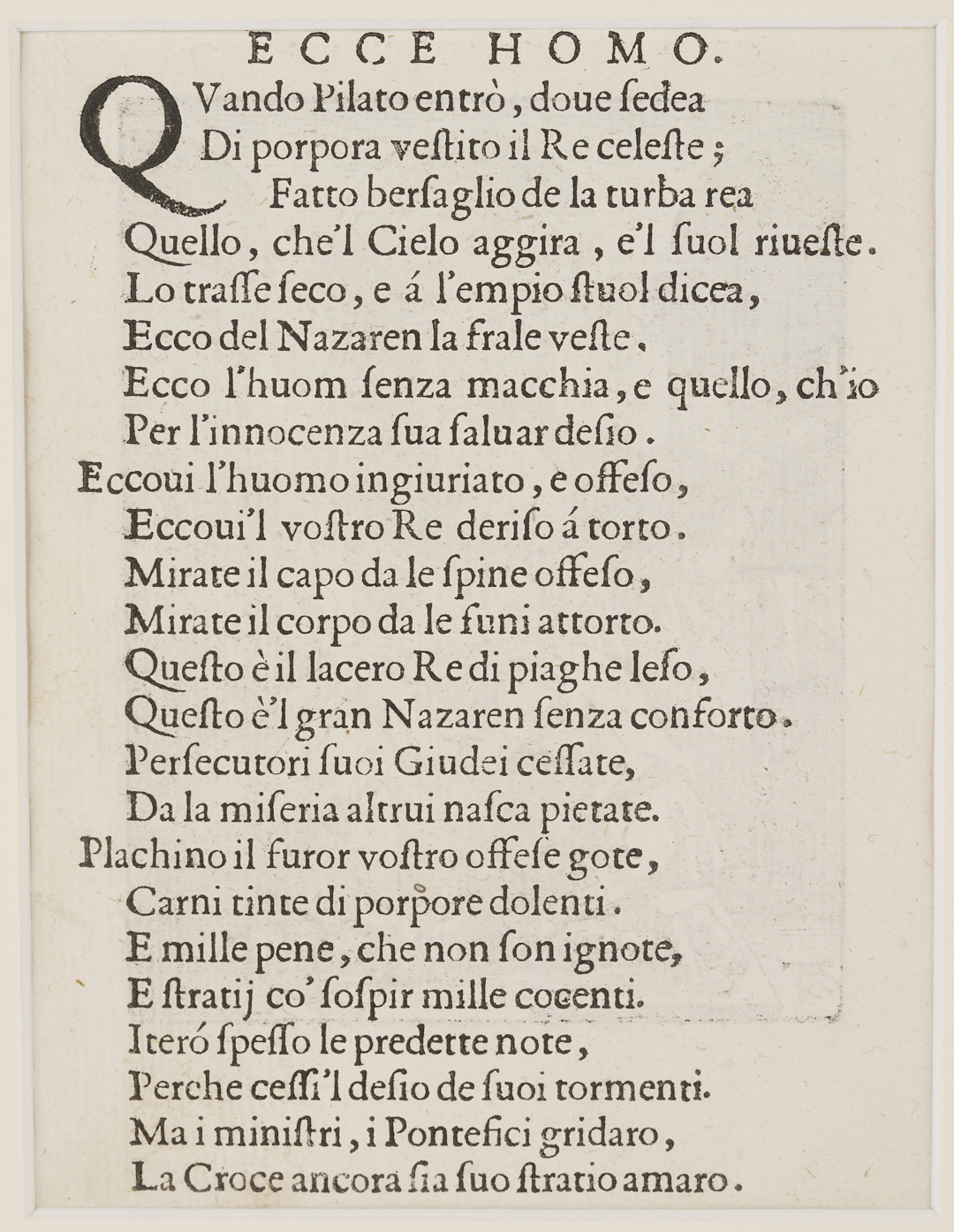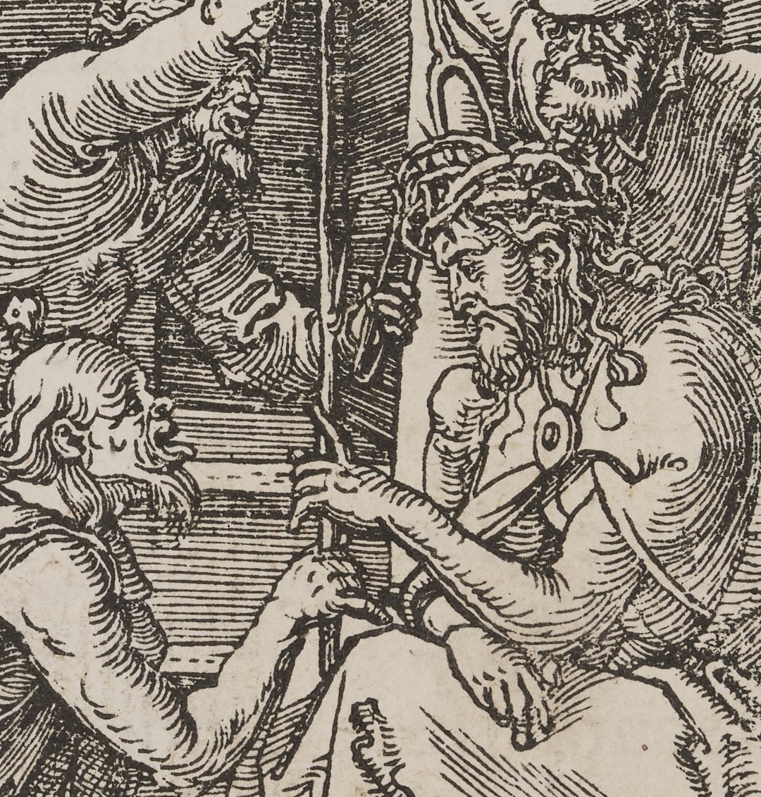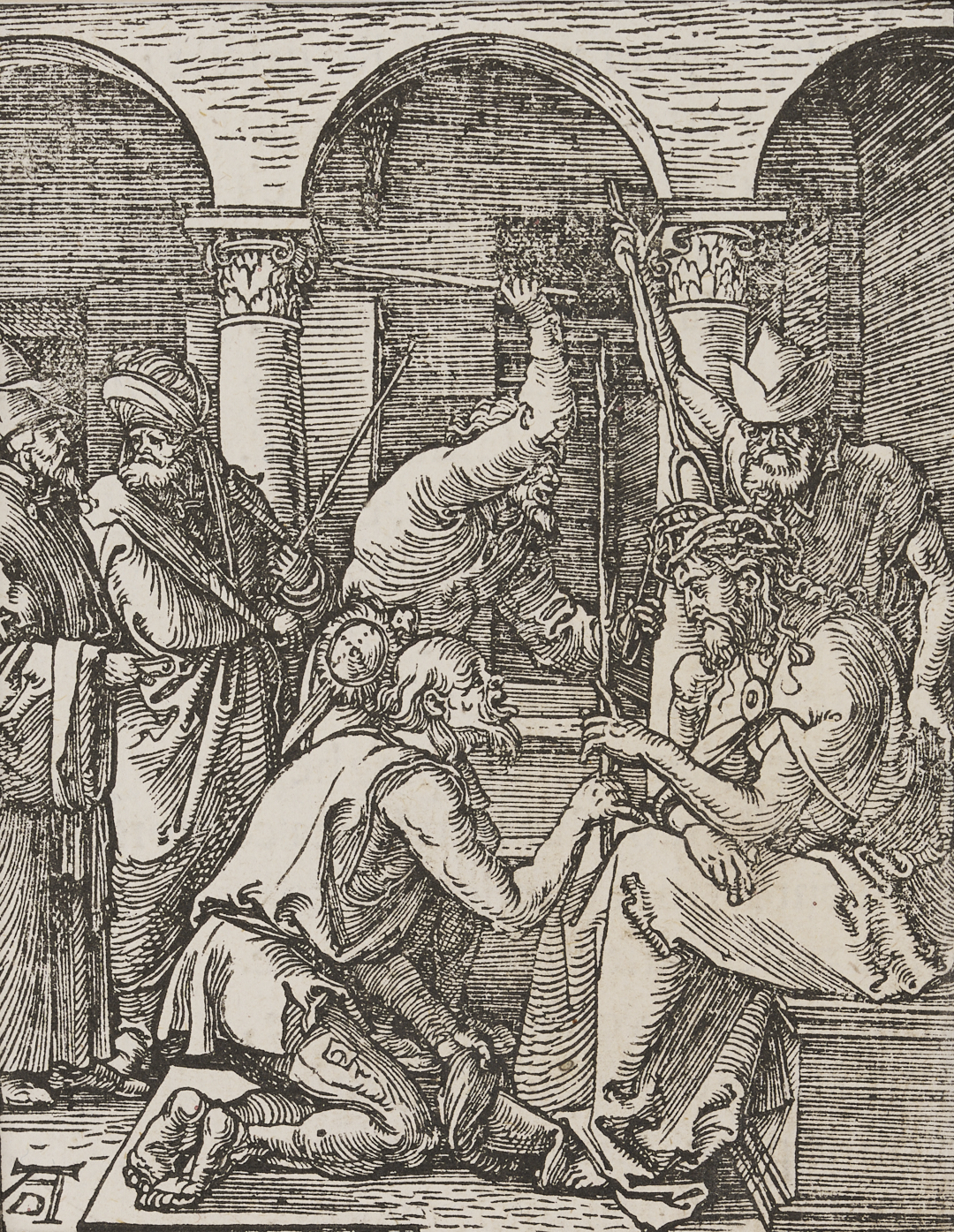 Albrecht Durer (German, 1471-1528) woodcut on laid paper, “Christ Crowned with Thorns” from The Small Passion, c. 1508-10. From the 1612 Italian text edition published by Daniel Bissuccio, Venice. Mongrammed in the plate, lower left. Ref.: Bartsch 34, Meder 143. Housed in a window mat with recto and verso openings and brown and gold reveal. Sight: 4 13/16 in. H x 3 13/16 in. W. Mat: 16 15/16 in. H x 15 7/8 in. W.
