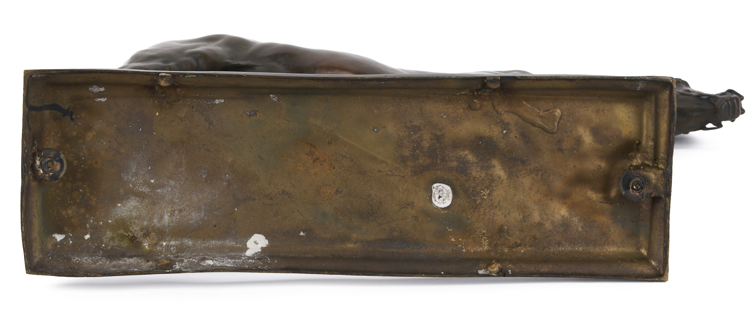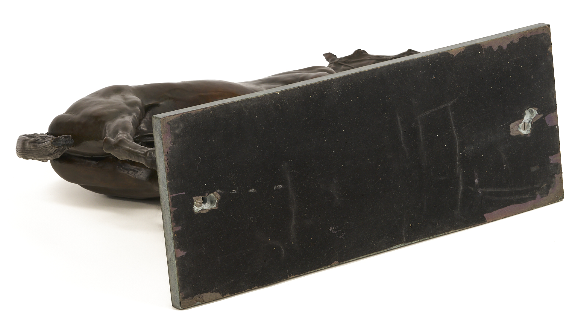 After Isidore Jules Bonheur (French, 1827-1901) bronze sculpture depicting a walking horse with a braided mane and clipped tail on a stepped, naturalistic base, signed “I. Bonheur.” Mounted onto a rectangular green marble socle. Sculpture measures 22 in. H x 6 in. W x 28 1/2 in. L. With base: 22 3/4 in H x 9 3/4 in. W x 25 3/4 in. Weight of bronze: approx. 72.4 lbs. Weight with base: approx. 91.5 lbs. 20th century.