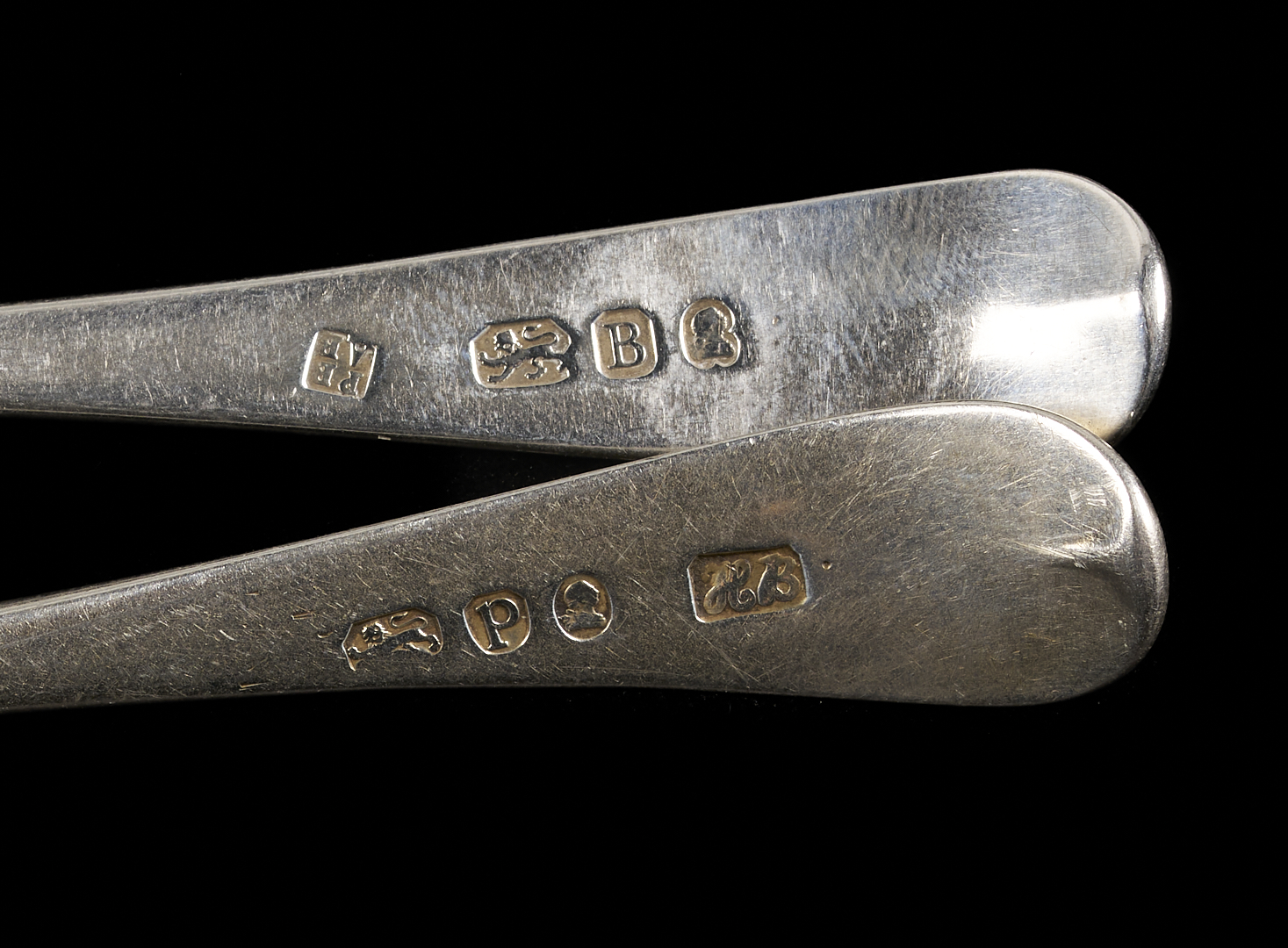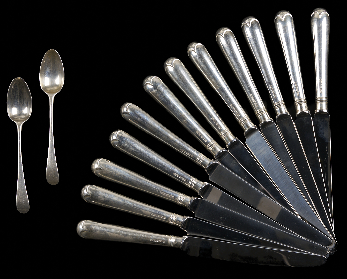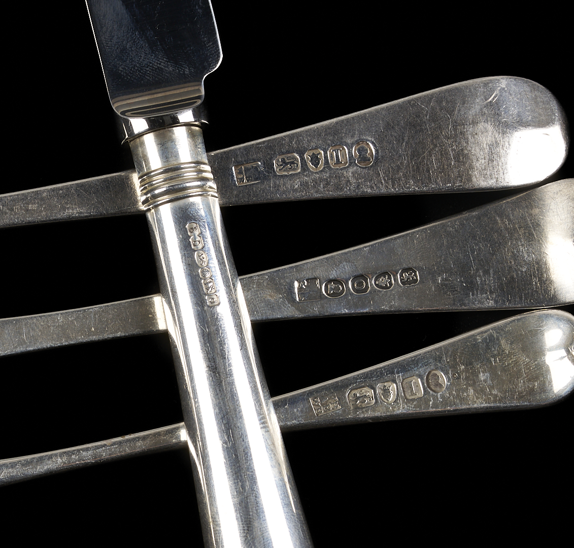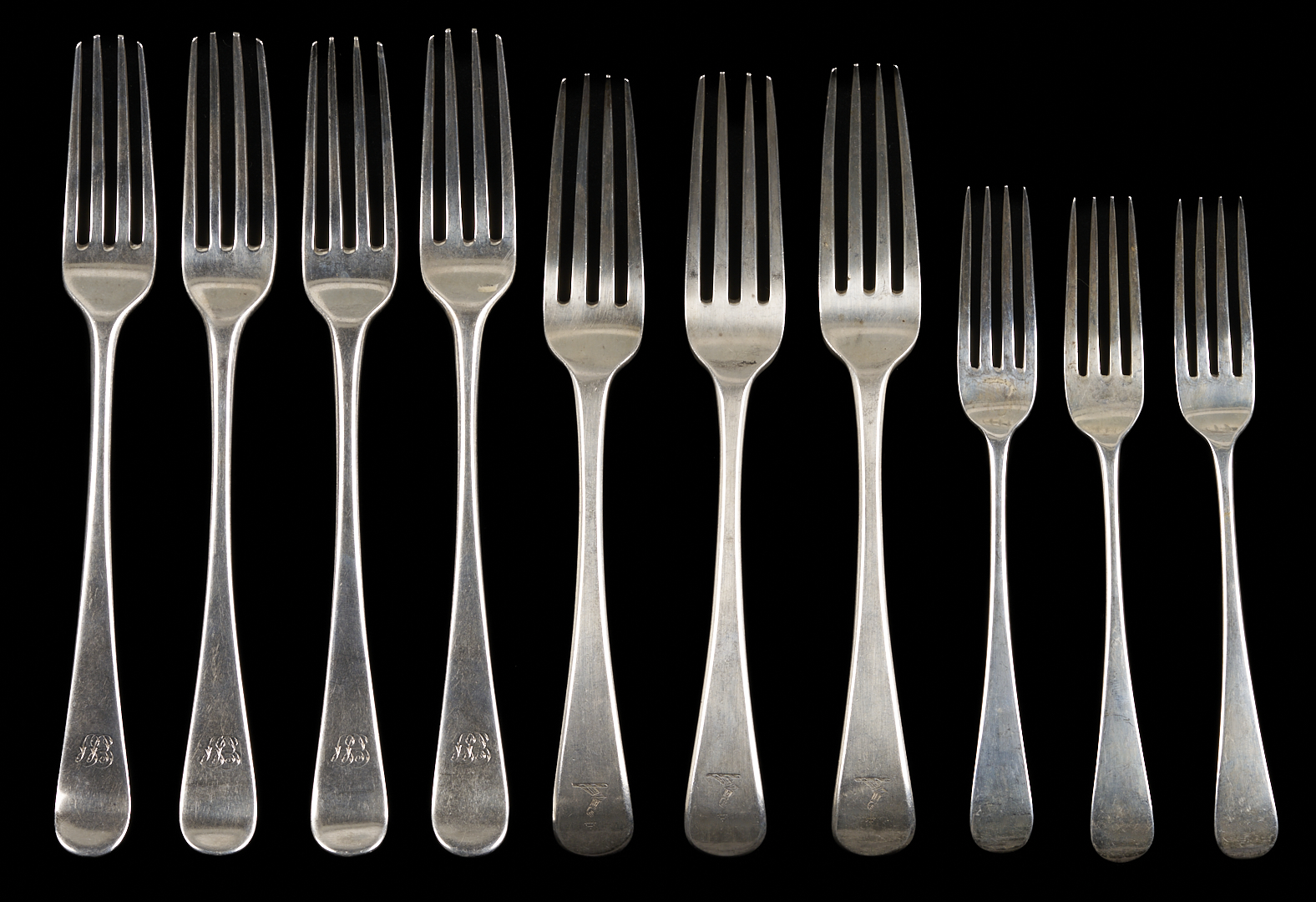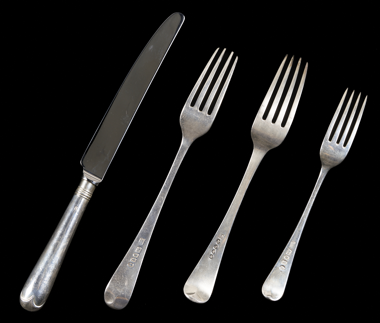 Thirty (30) English sterling silver flatware pieces, including: 4 dinner forks with hallmarks for Peter & William Bateman (London) and a date letter for 1809; 4 dinner forks with hallmarks for Peter, Ann, & William Bateman and a date letter for 1804; 3 dessert or luncheon forks with hallmarks for Peter, Ann, & William Bateman and a date letter for 1804; 2 teaspoons with hallmarks for Hester Bateman and a date letter for 1790; 6 teaspoons with hallmarks for Peter & Ann Bateman and a date letter for 1797; and 12 dinner knives with hallmarks for Sterling Sheffield, 20th century. 22.09 total weighable troy ounces.