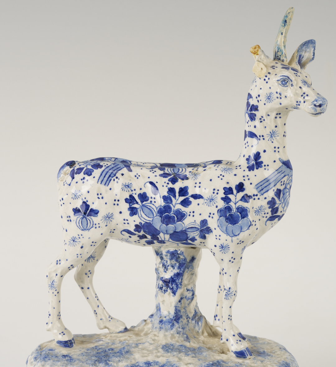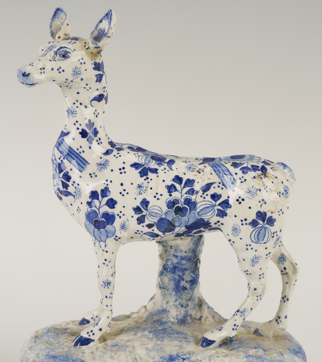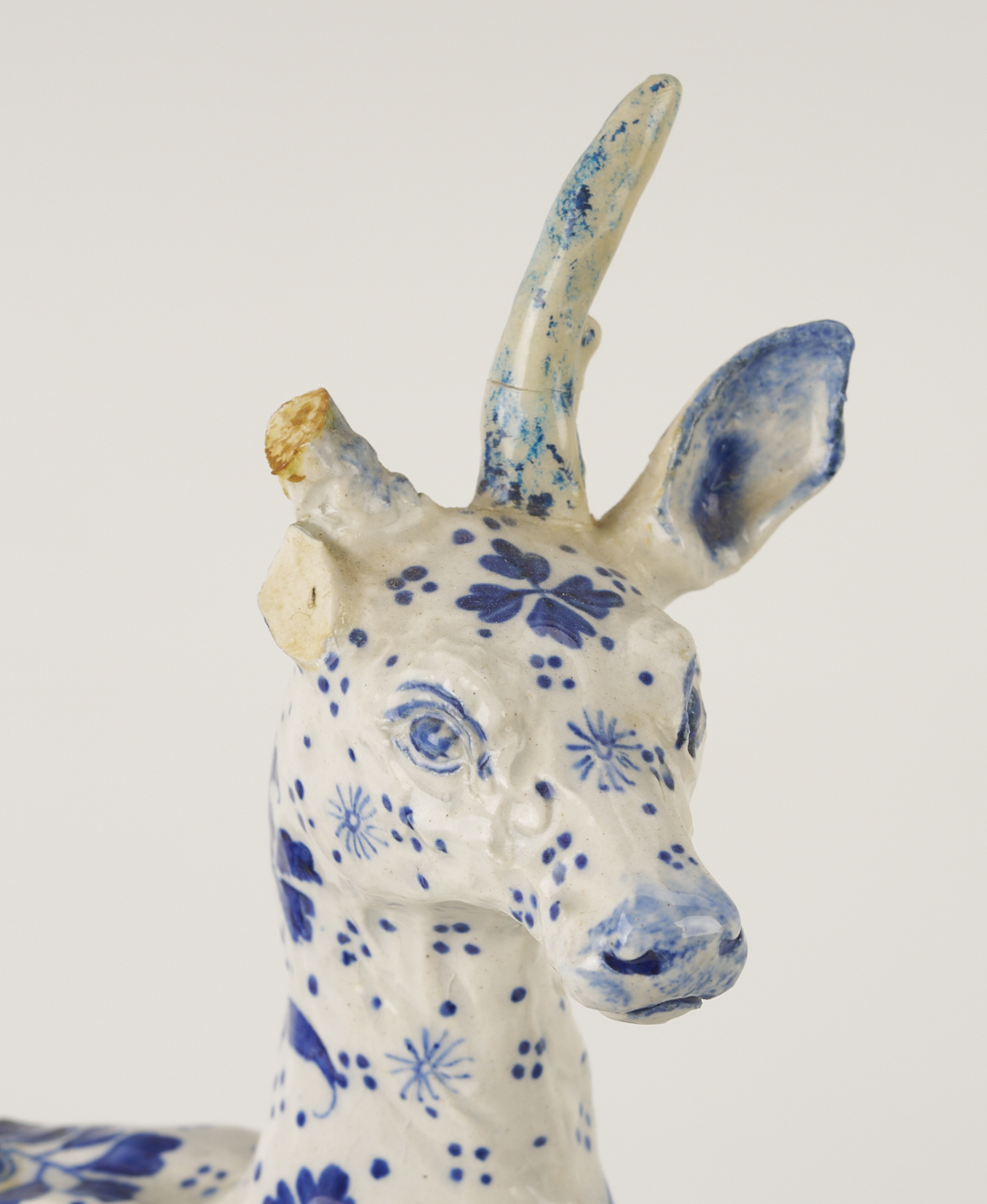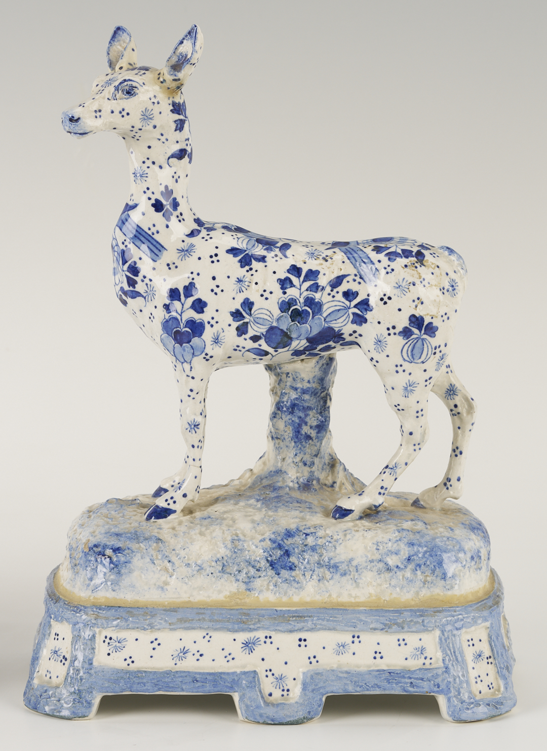 Pair of Continental Delft or Delft style blue and white faience figures of deer, a male and female, depicted standing on footed rectangular bases with receptacles for flowers or candles. Impressed 595 on the underside of each. 11 in. H x 7 in. L x 4 1/2 in. W. 19th century.