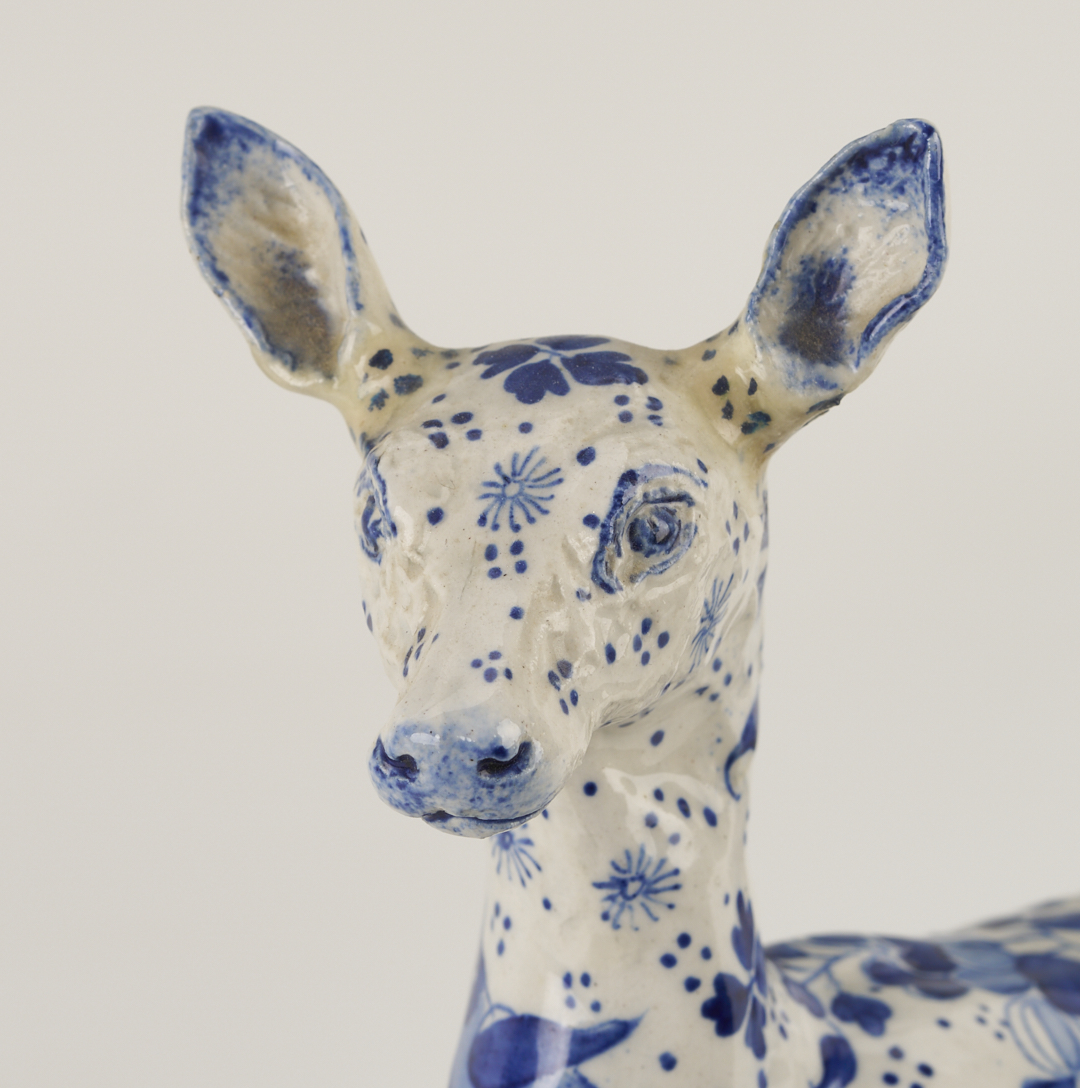 CONDITION: Male deer with a missing antler and ear, and repair to the remaining antler. Female deer with old repair to one ear.
