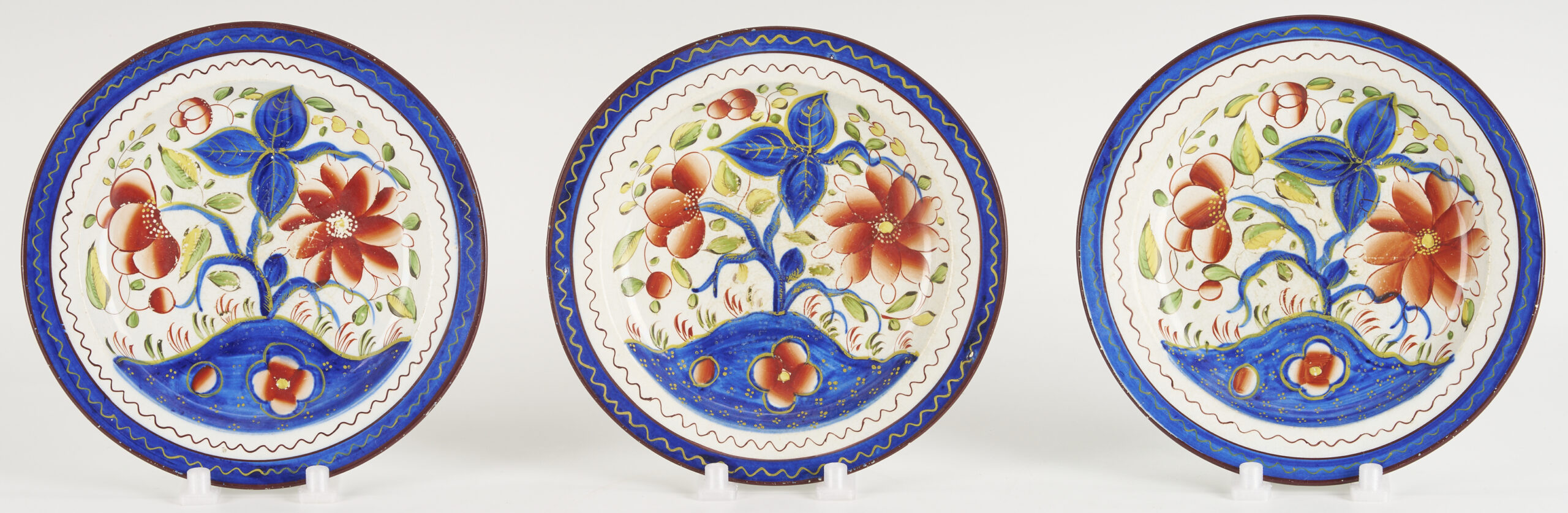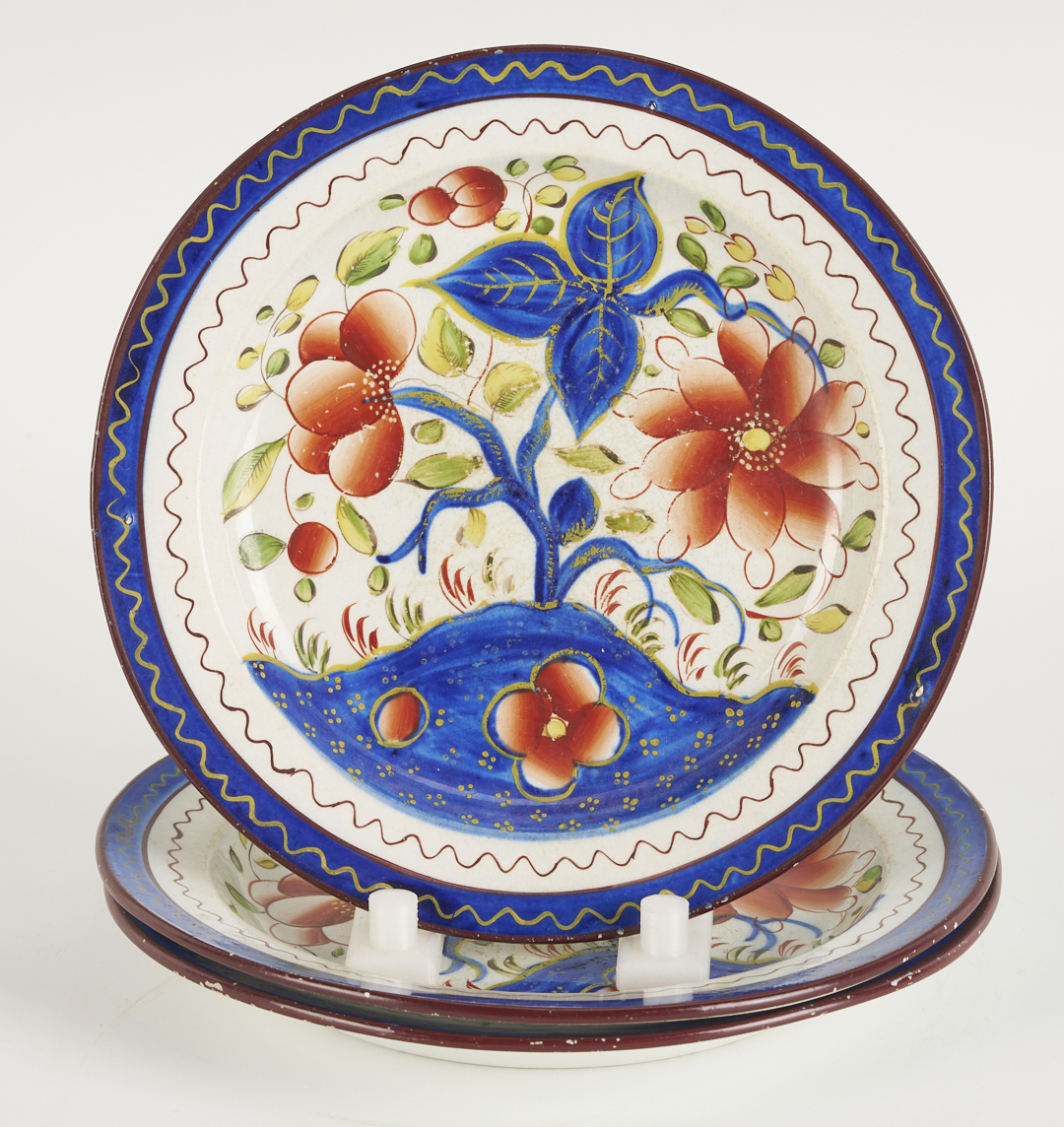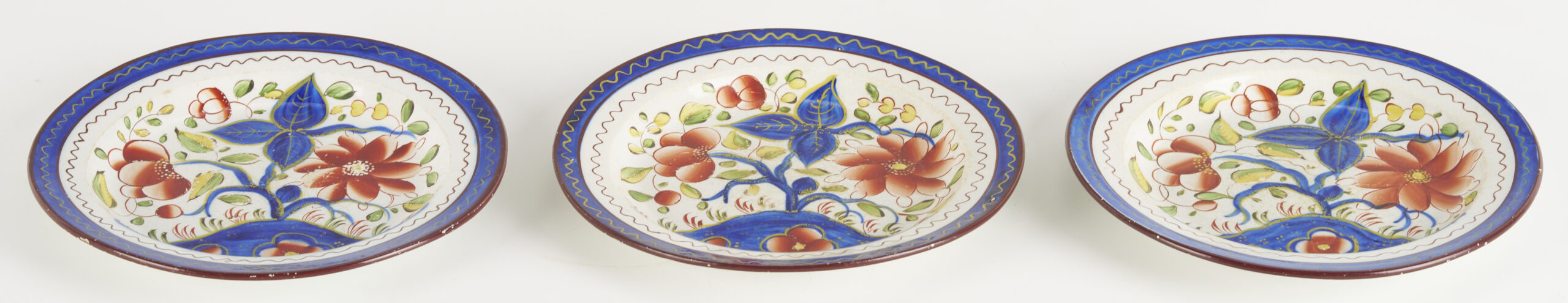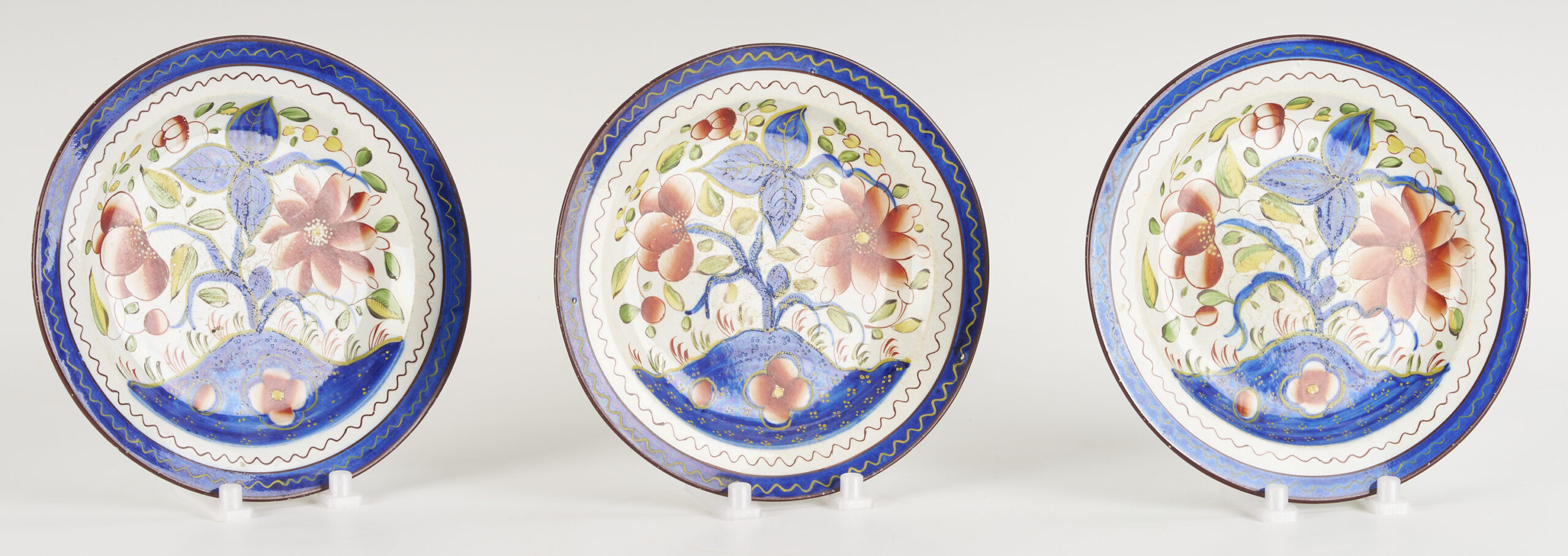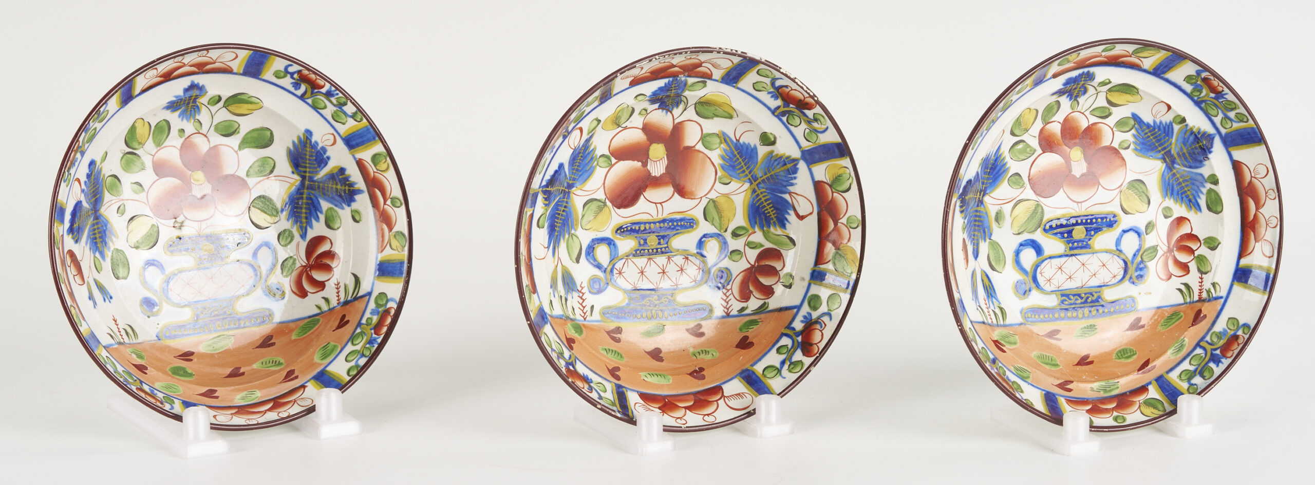 Nine (9) Gaudy Dutch pearlware items including 3 Sunflower Pattern plates and 3 Urn pattern cups with 3 matching saucers. Plates: 7 1/2 in. diameter. Saucers: 5 1/2 in. diameter. Cups: 2 1/2 in. H. English or Welsh, 1st quarter 19th century.