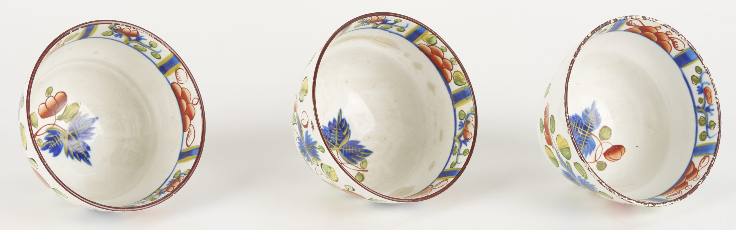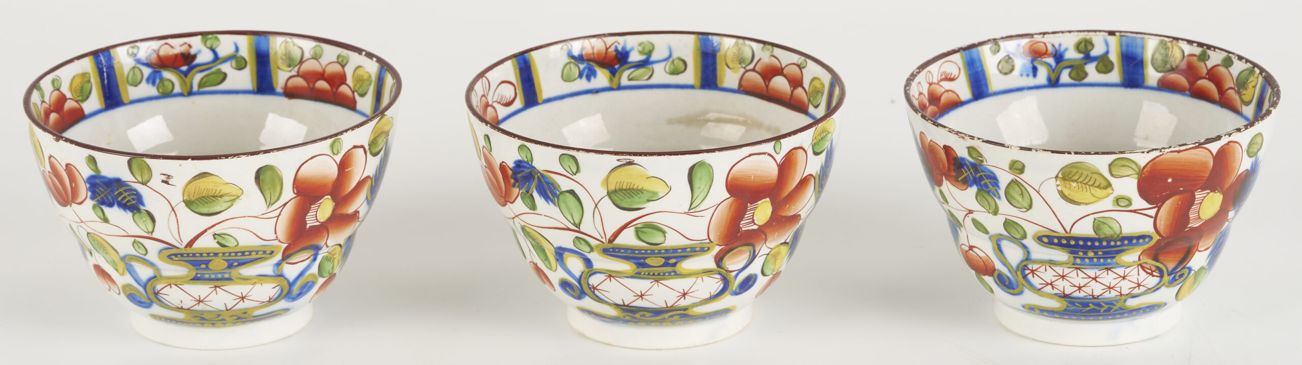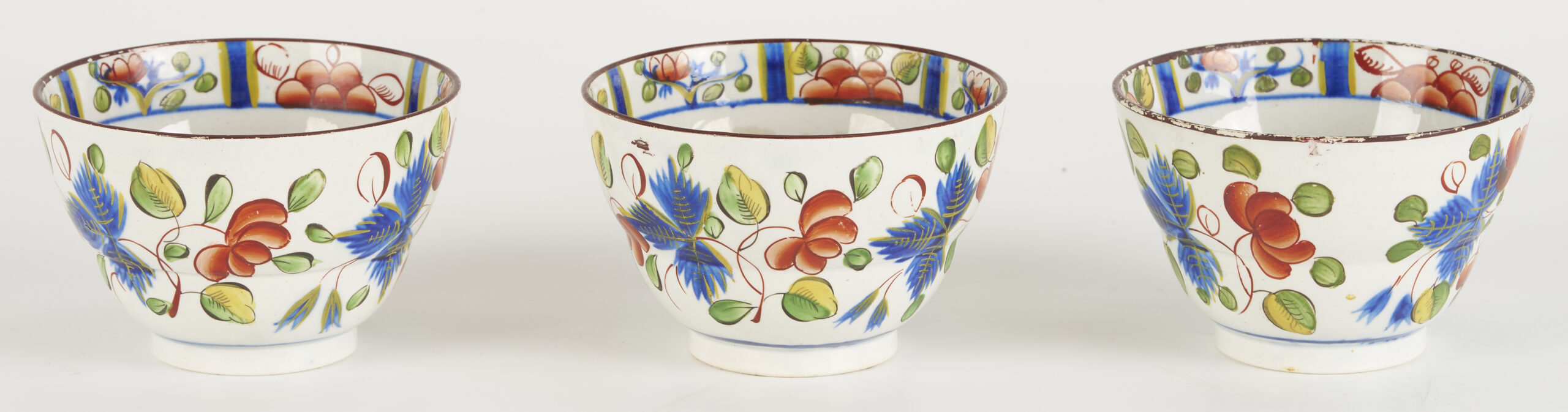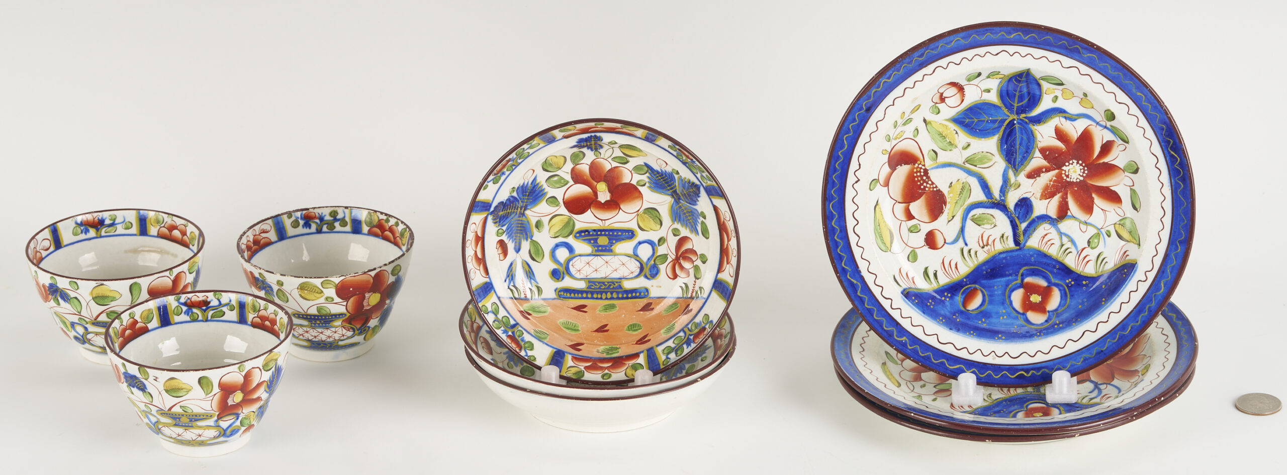 Nine (9) Gaudy Dutch pearlware items including 3 Sunflower Pattern plates and 3 Urn pattern cups with 3 matching saucers. Plates: 7 1/2 in. diameter. Saucers: 5 1/2 in. diameter. Cups: 2 1/2 in. H. English or Welsh, 1st quarter 19th century.