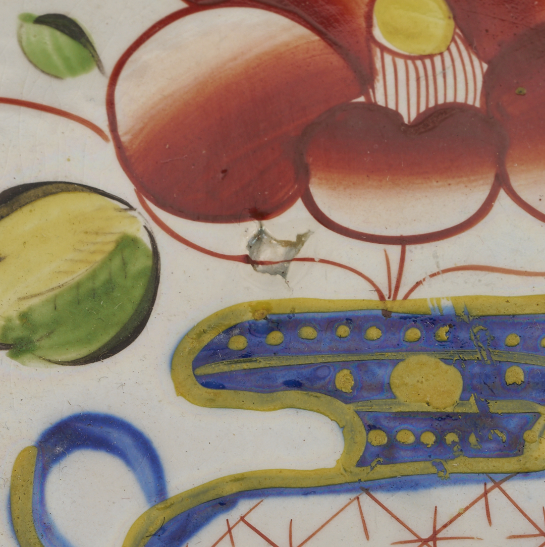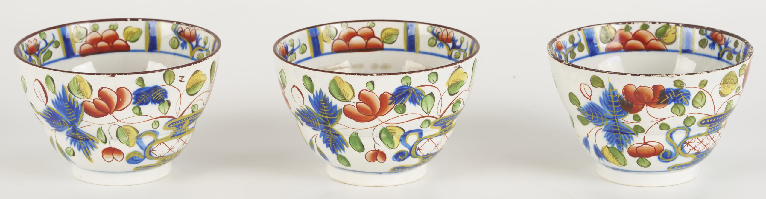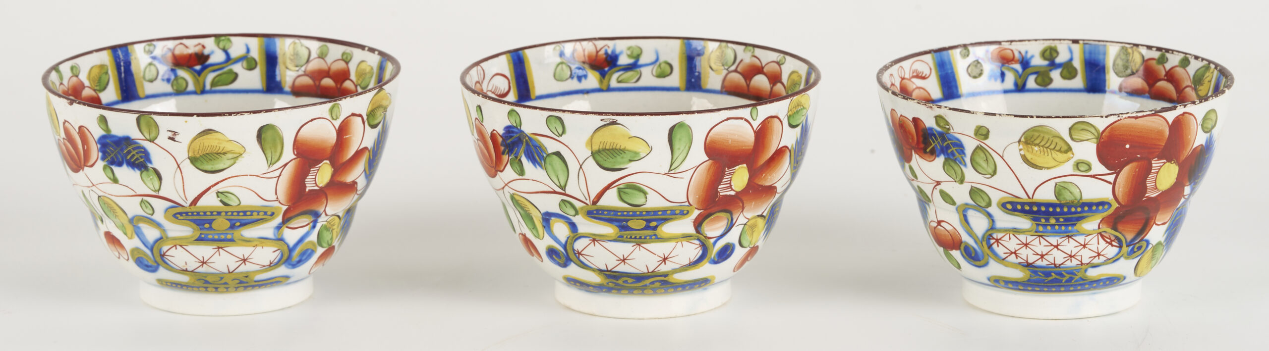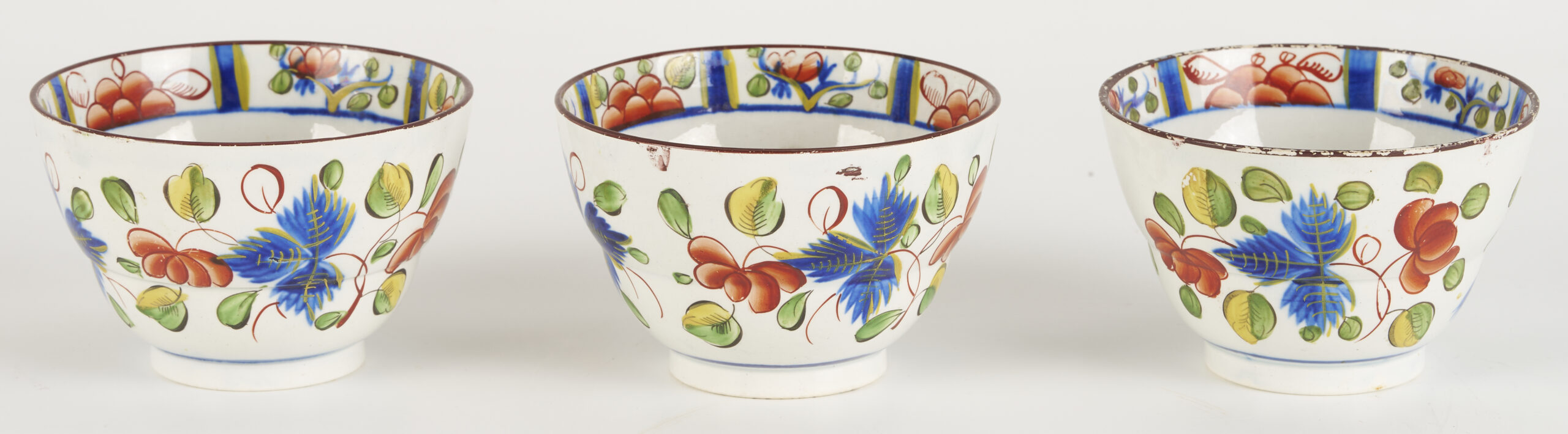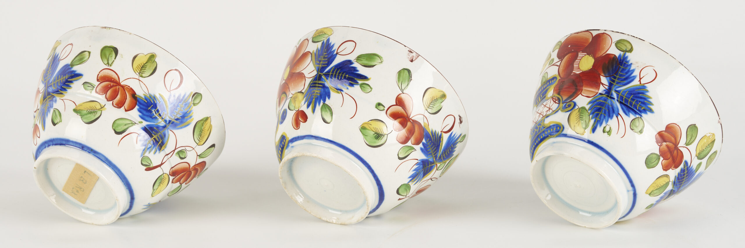 Nine (9) Gaudy Dutch pearlware items including 3 Sunflower Pattern plates and 3 Urn pattern cups with 3 matching saucers. Plates: 7 1/2 in. diameter. Saucers: 5 1/2 in. diameter. Cups: 2 1/2 in. H. English or Welsh, 1st quarter 19th century.