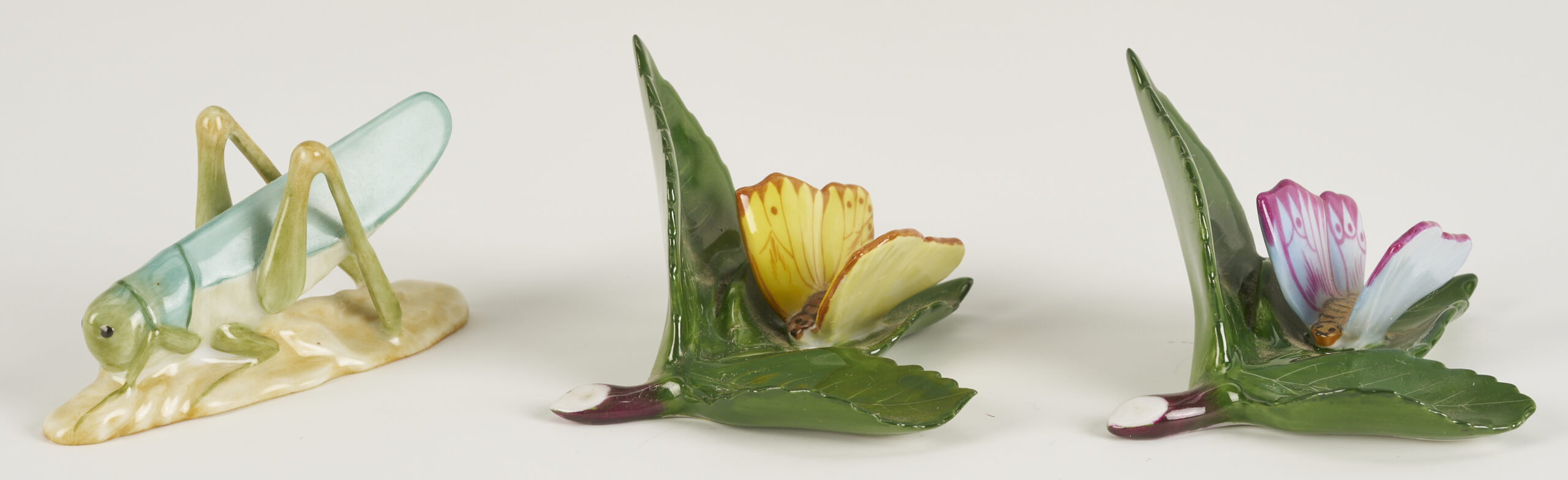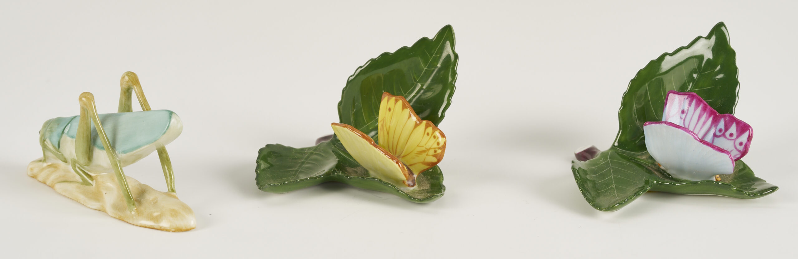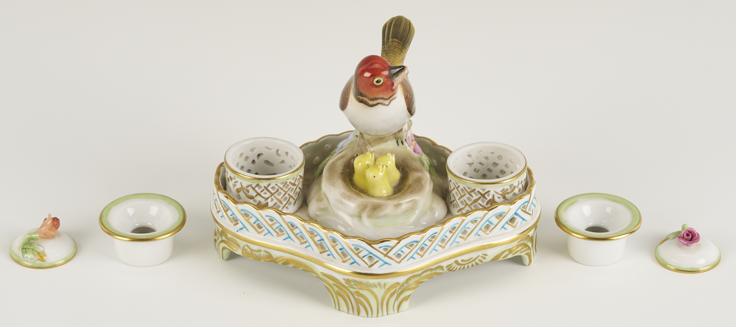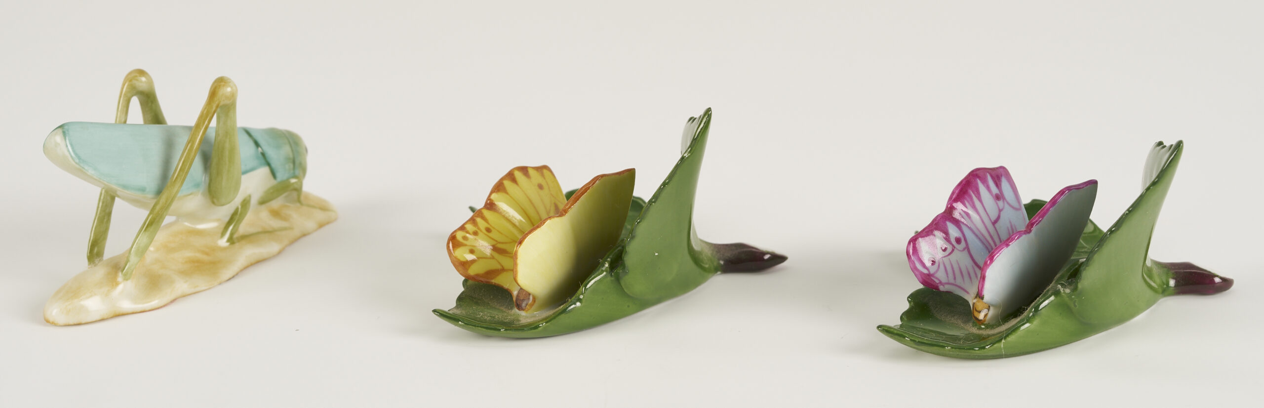 1st-5th items: Grouping of four (4) Herend porcelain and one (1) Rosenthal porcelain Insect figures including a large Herend yellow butterfly figure resting on trumpet flowers, model #1395, a Herend yellow butterly resting on a leaf card holder, model #6426, a Herend pink and blue butterfly resting on a leaf card holder, model #6426, a Herend cricket, model # 5258, and a Rosenthal butterfly, model #1835. All pieces have a maker’s mark or stamp and model number on the base. Ranging in size from 1 5/8 in. H x 3 5/8 in. W to 6 1/4 in. H x 5 3/8 in. W. 20th century. 6th item: Herend porcelain double inkstand with figural bird to the center, model #7800. Blue Herend stamp marks and model numbers are on the underside. 4 1/2 in. H x 5 3/4 in. W. 20th century.