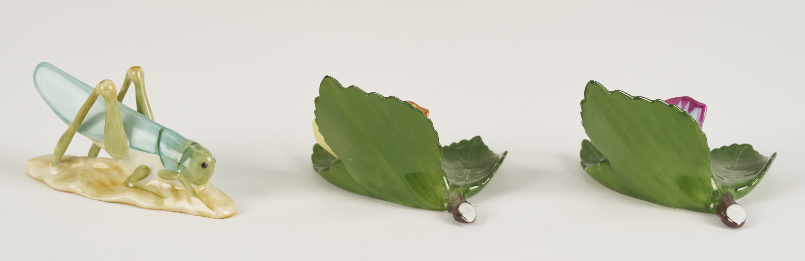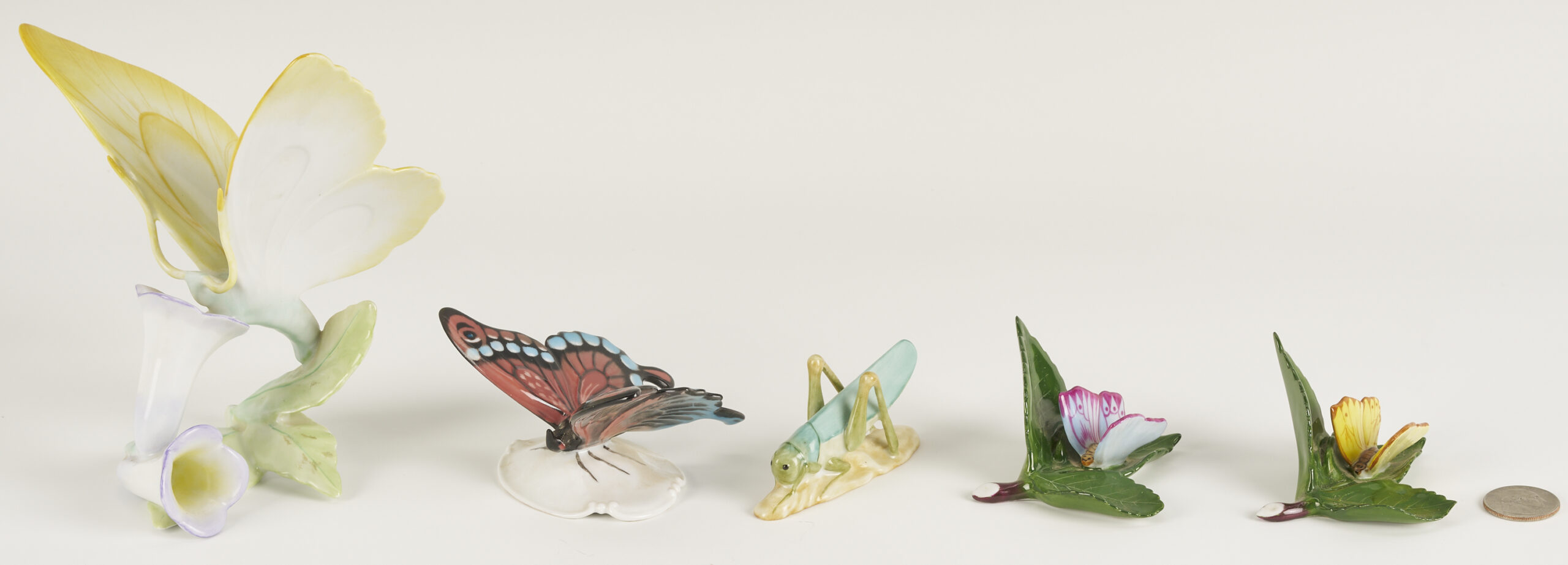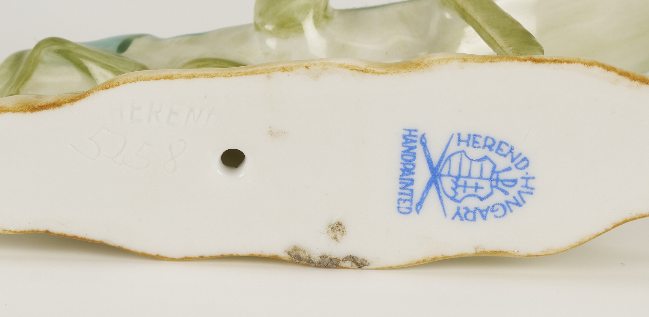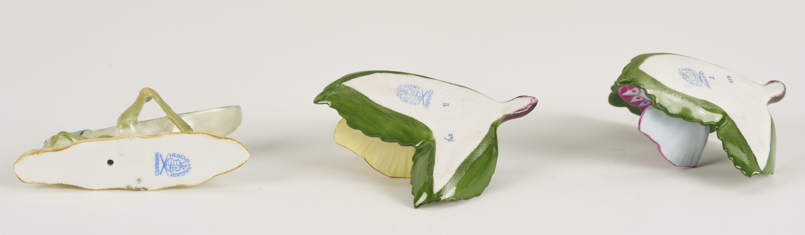 1st-5th items: Grouping of four (4) Herend porcelain and one (1) Rosenthal porcelain Insect figures including a large Herend yellow butterfly figure resting on trumpet flowers, model #1395, a Herend yellow butterly resting on a leaf card holder, model #6426, a Herend pink and blue butterfly resting on a leaf card holder, model #6426, a Herend cricket, model # 5258, and a Rosenthal butterfly, model #1835. All pieces have a maker’s mark or stamp and model number on the base. Ranging in size from 1 5/8 in. H x 3 5/8 in. W to 6 1/4 in. H x 5 3/8 in. W. 20th century. 6th item: Herend porcelain double inkstand with figural bird to the center, model #7800. Blue Herend stamp marks and model numbers are on the underside. 4 1/2 in. H x 5 3/4 in. W. 20th century.