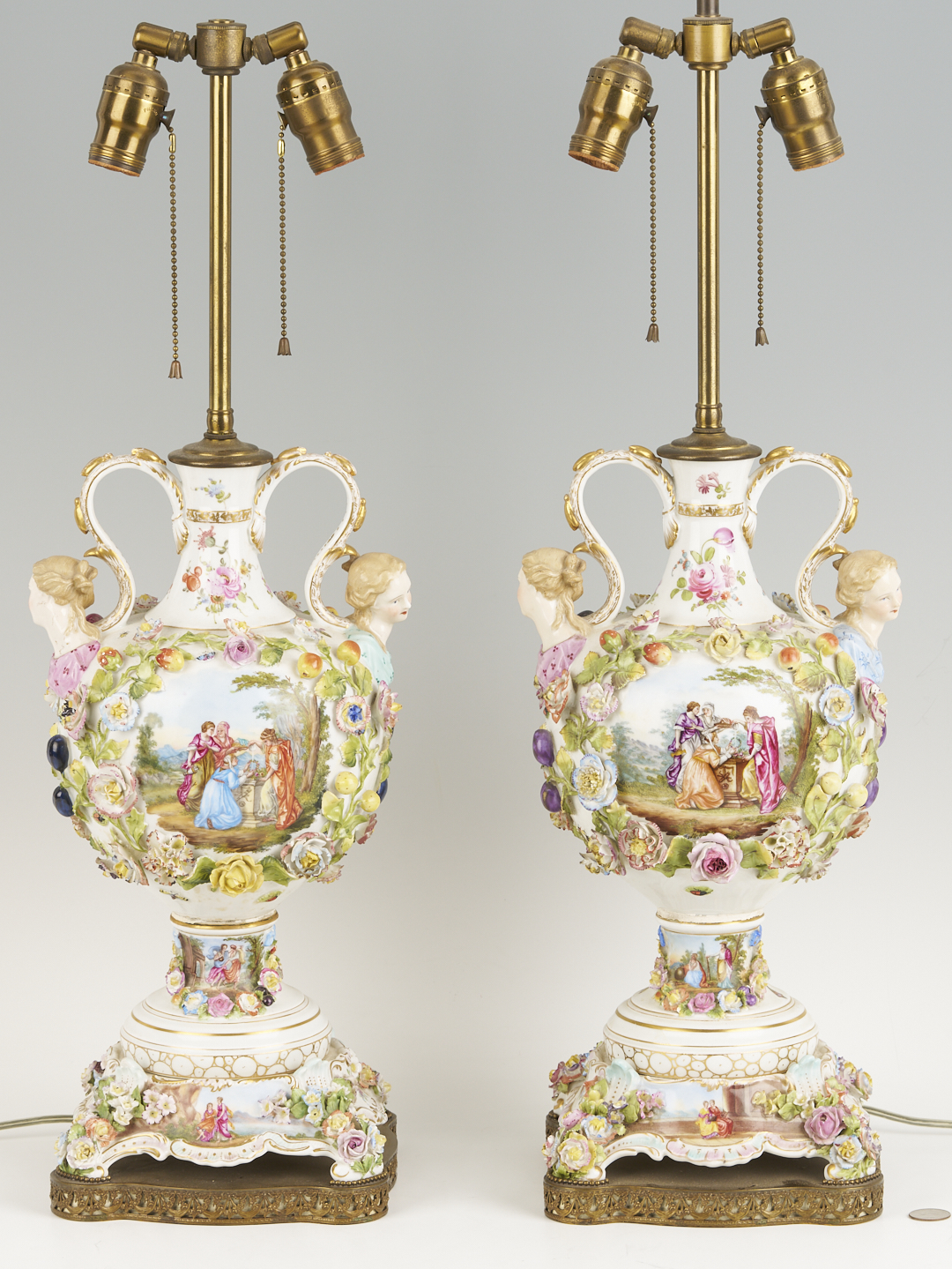 Pair of Dresden-style porcelain urns, in the manner of Carl Thieme, now mounted as lamps. Each with polychrome and gilt decoration, with figural vignettes to each side and the base encrusted with figural flowers, leaves, and fruit, female bust handles, and raised on a pedestal base with four feet. Bronze mounts to the top and base. Urns measure 17 in. H x 9 in. W. Total 27 3/4 in. H. Late 19th/Early 20th century.