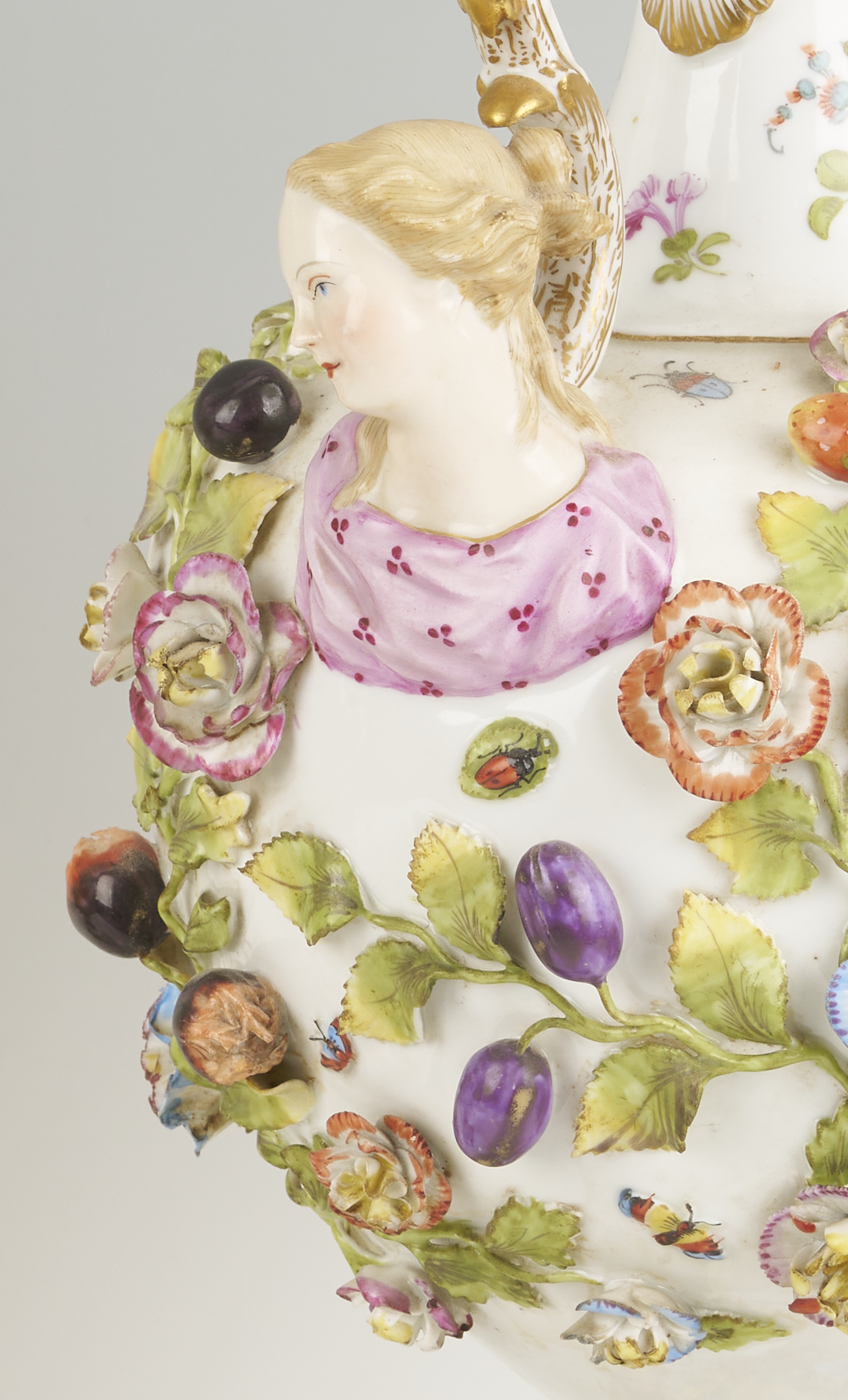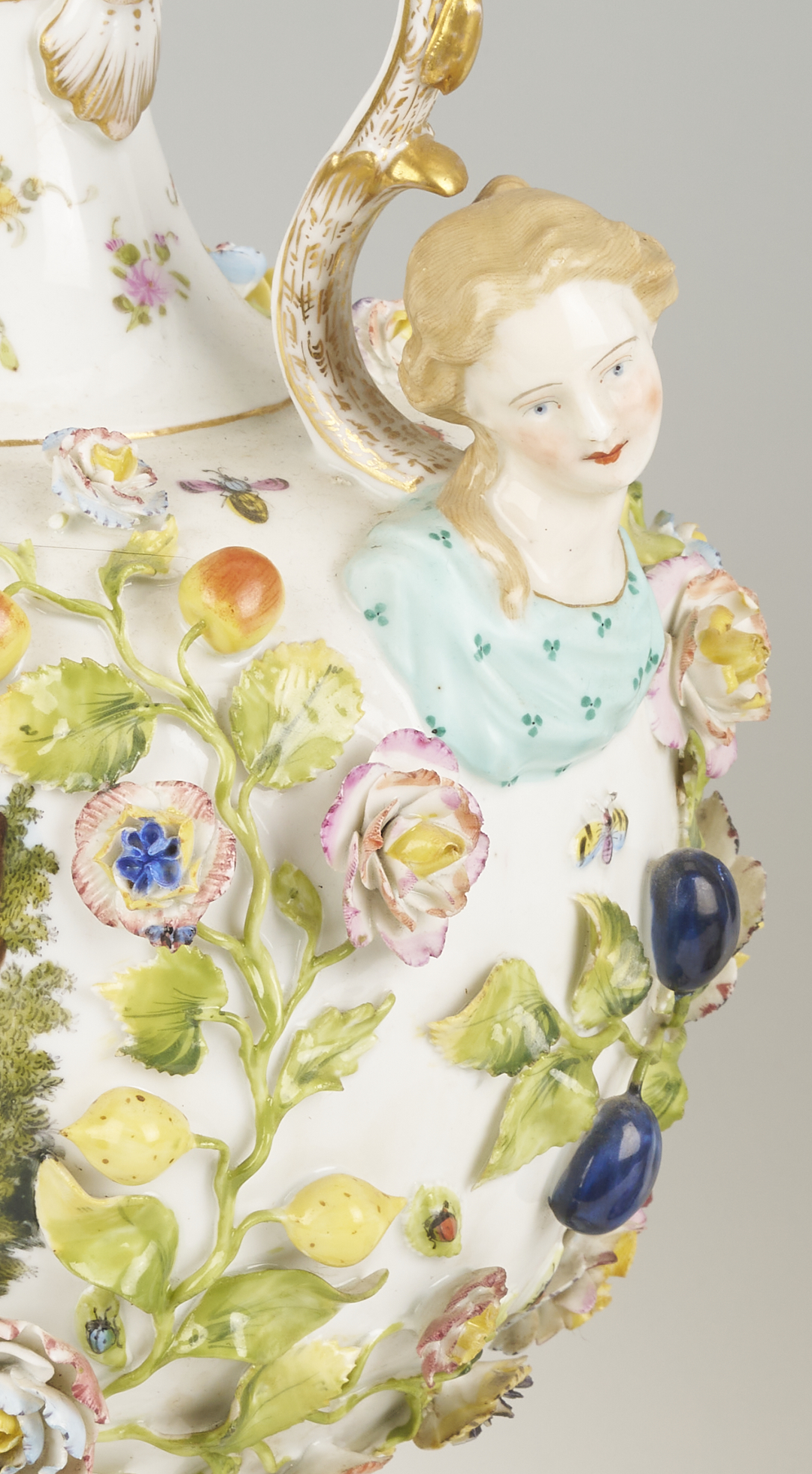CONDITION: Losses to the joint between the urn and the base of one lamp; the other lamp reinforced with adhesive to the joint between the urn and the base. Some minor scattered losses to raised floral, leaf, and fruit decoration.