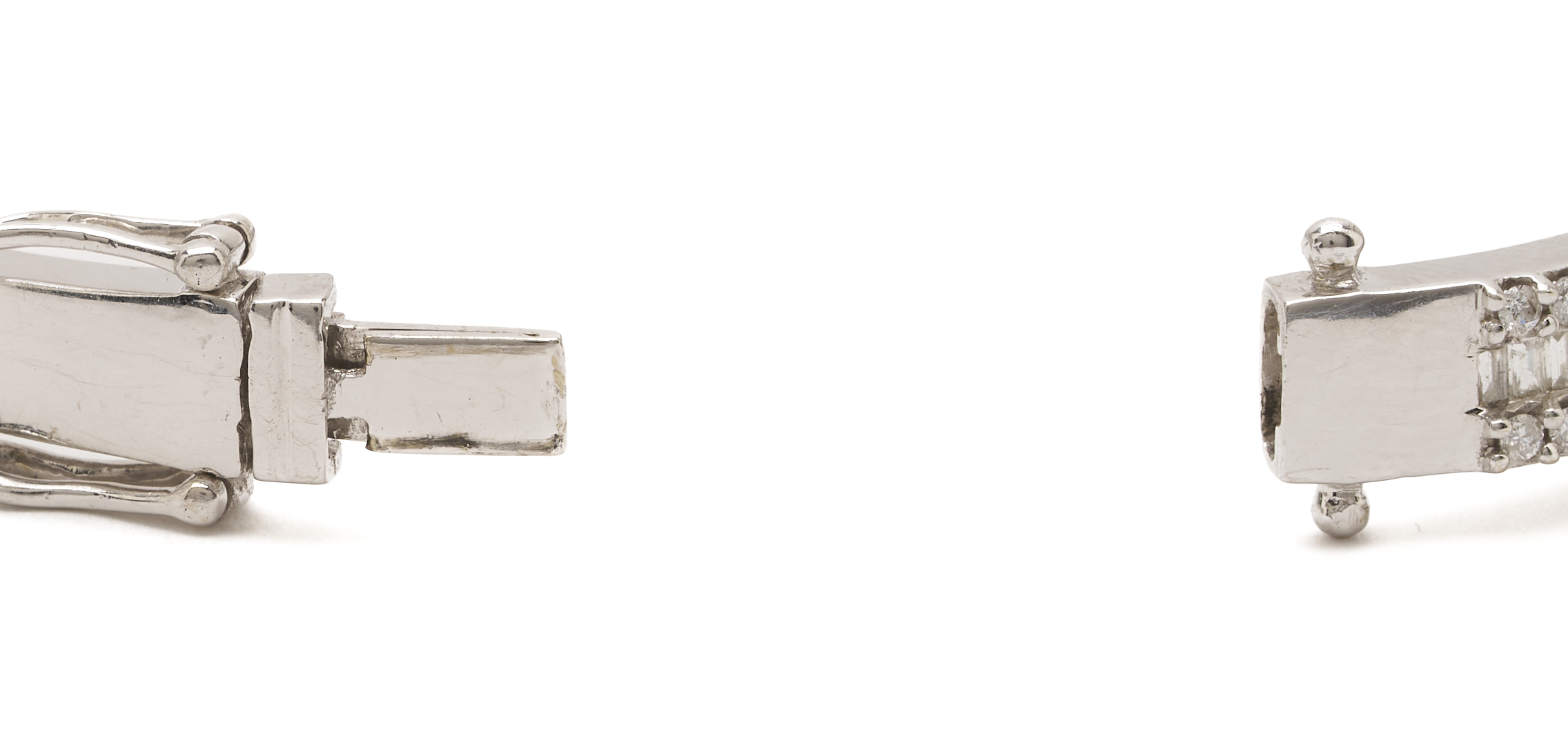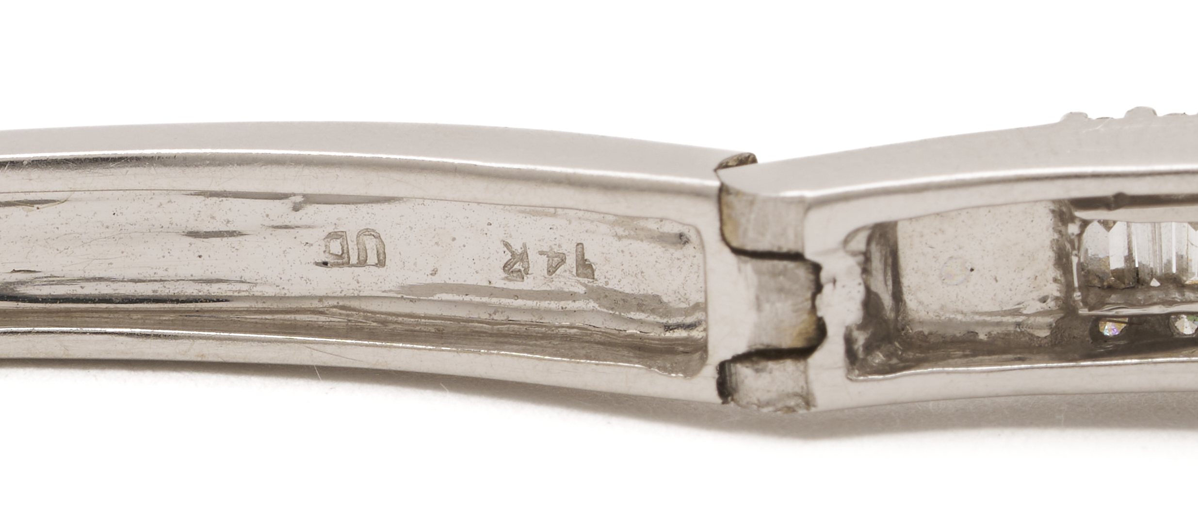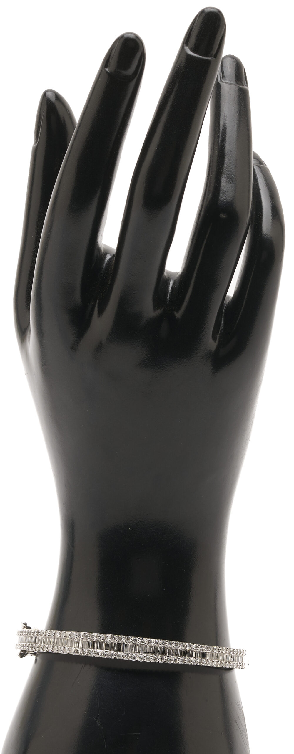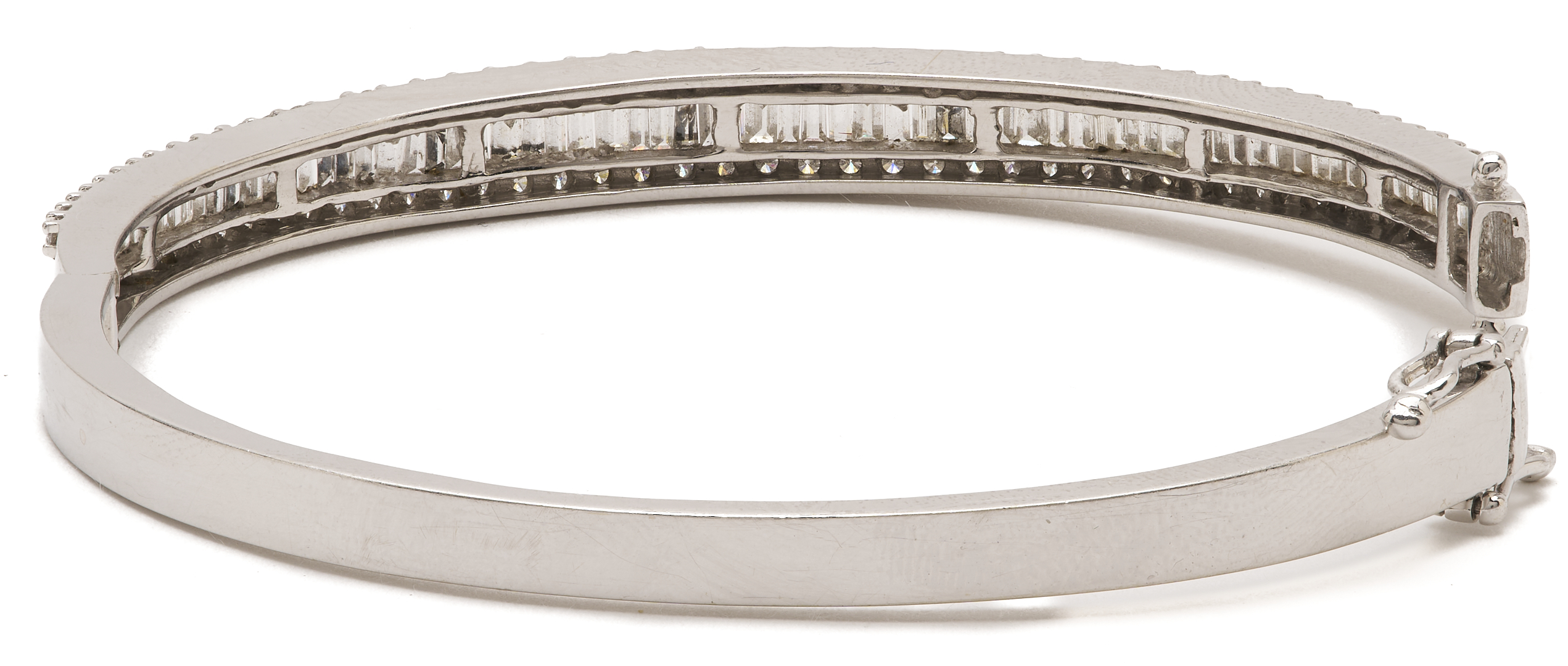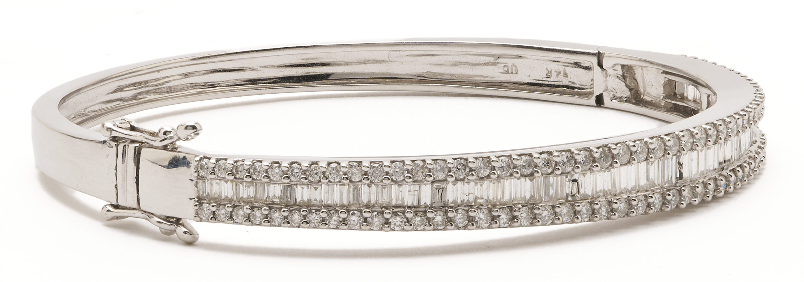 Ladies’ 14K white gold bangle bracelet featuring one hundred seventy-five (175) round brilliant and baguette cut diamonds approximately 3.00 carats Clarity-SI1, Color-G. The bracelet is marked “14K UD” and XRF tests 14K gold. The bracelet is 7 in. circumference and has a gross weight of 19.49 grams.