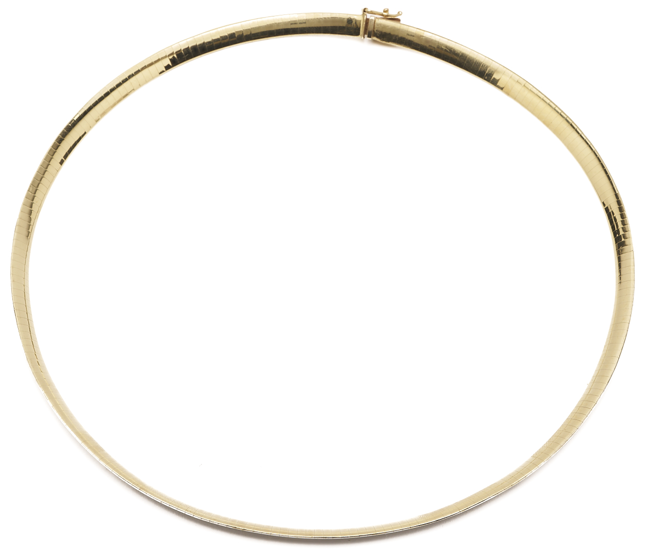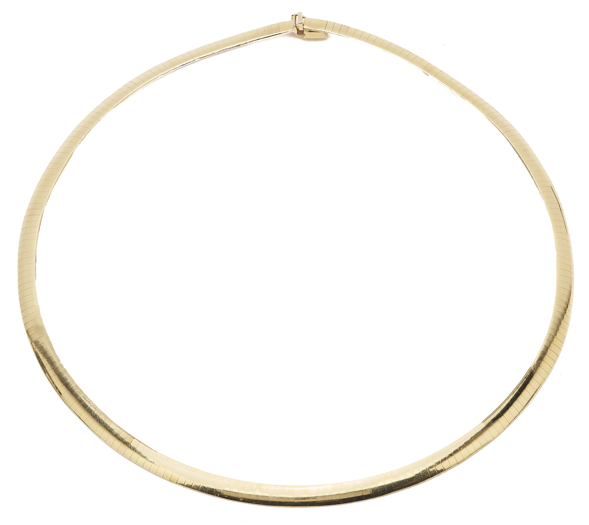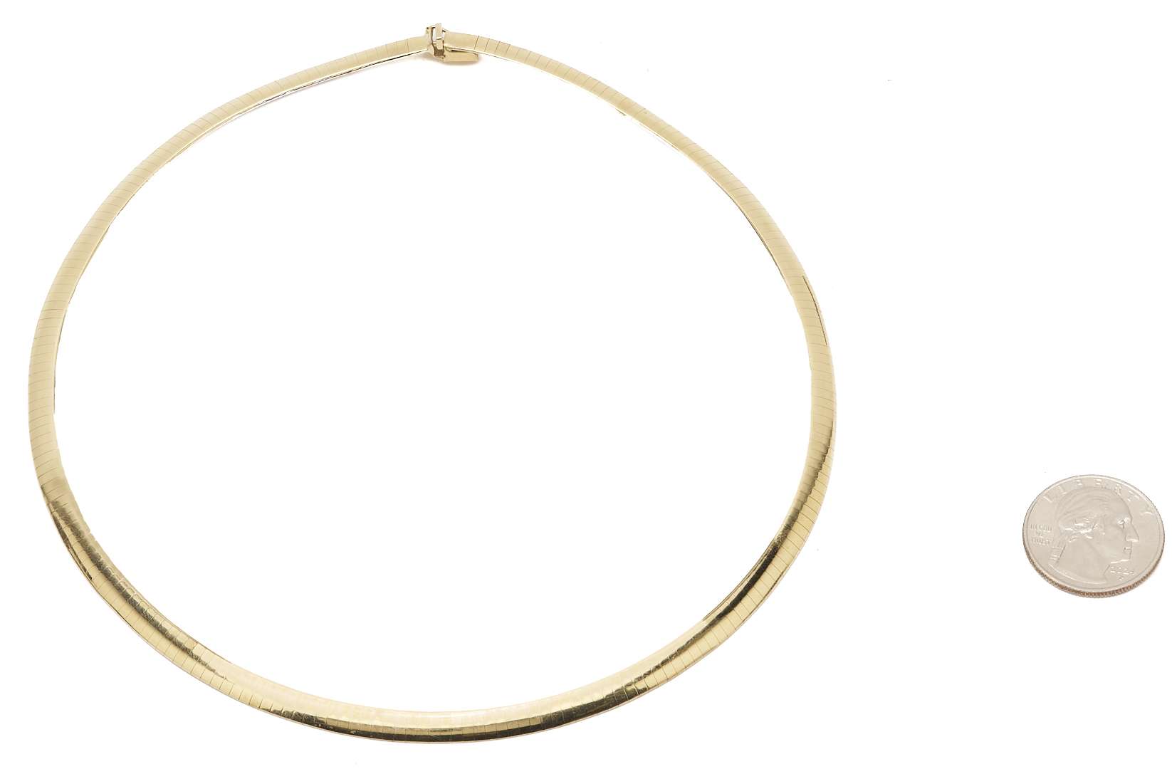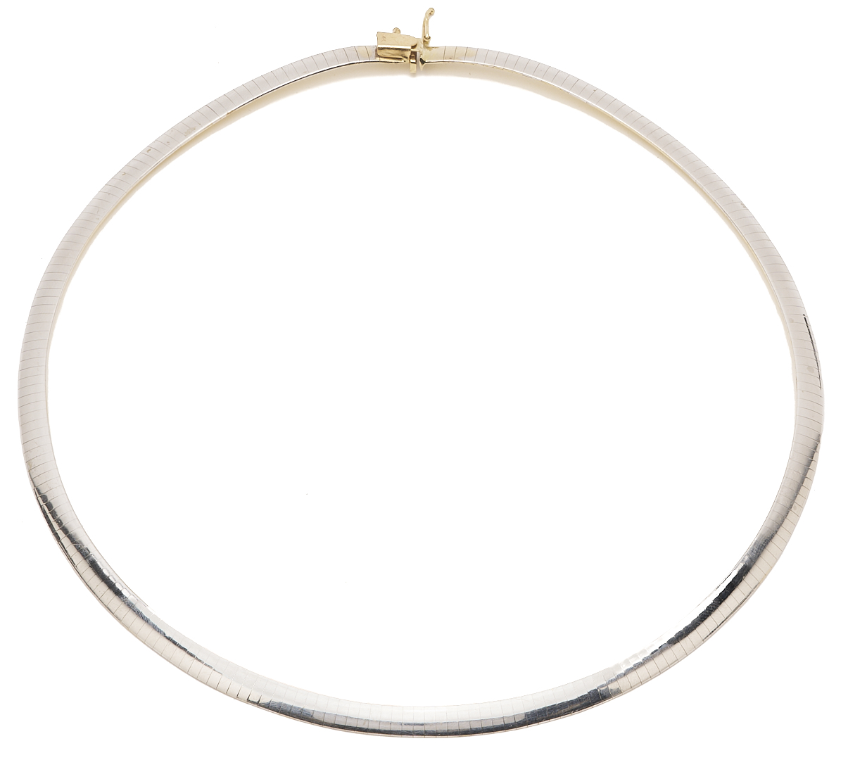 Ladies’ 14K yellow and white gold reversible omega style necklace. The necklace is marked “14K” and XRF tests 14K gold. The necklace is 18 in. L. and has a weight of 28.03 grams.