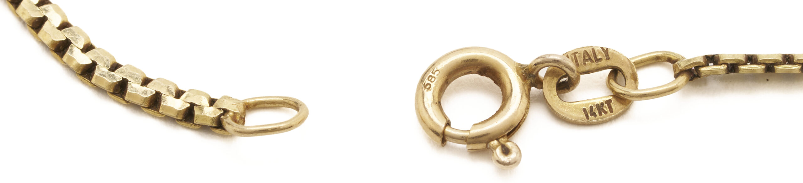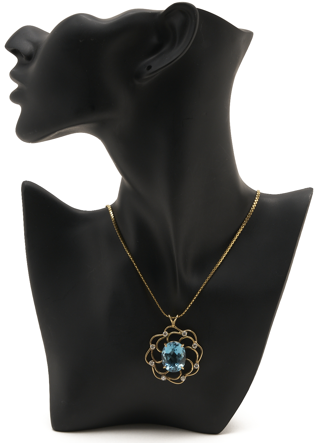 Ladies’ 14K yellow gold box chain necklace with 14K yellow gold pendant featuring one (1) natural oval cut aquamarine approximately 17.30 carats accented by eight (8) round brilliant cut diamonds approximately 0.96 carats together, Clarity-SI2, Color-I. The necklace is marked “14K 585 Italy” and both the necklace and pendant XRF test 14K gold. The necklace is 19 in. L. and the pendant is 1 3/4 in. x 1 3/8 in. Gross weight of the necklace and pedant is 18.12 grams.