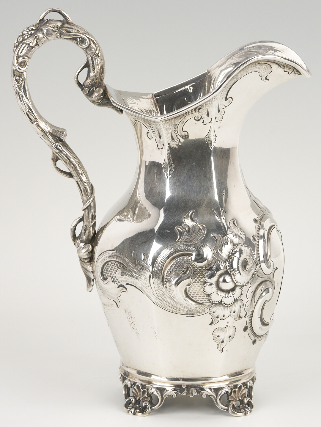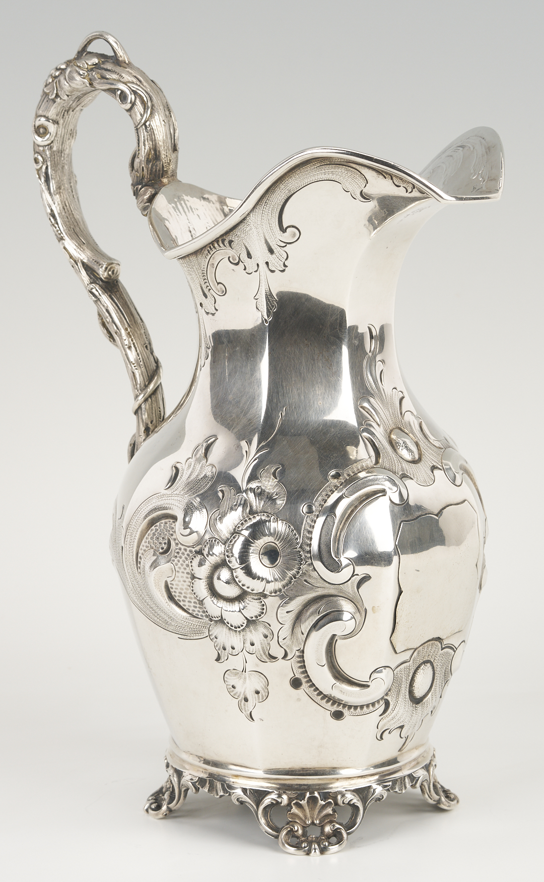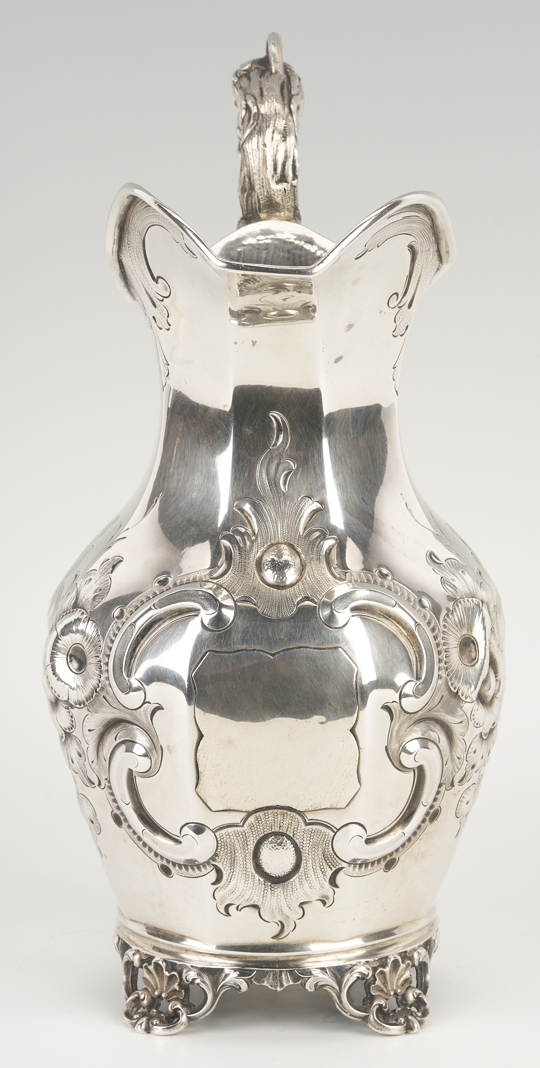 Mid-19th c. Missouri coin silver water pitcher, octagonal pear-shaped form with repousse floral, scroll and cartouche decoration to sides, naturalistic branch handle, and four openwork shell and scroll feet. Incuse mark to underside for Edward Mead, working Ithaca, NY, ca. 1831-1835 and St. Louis, MO, 1835-1881. 12 1/4 in. H. 39.43 oz troy. Circa 1855.