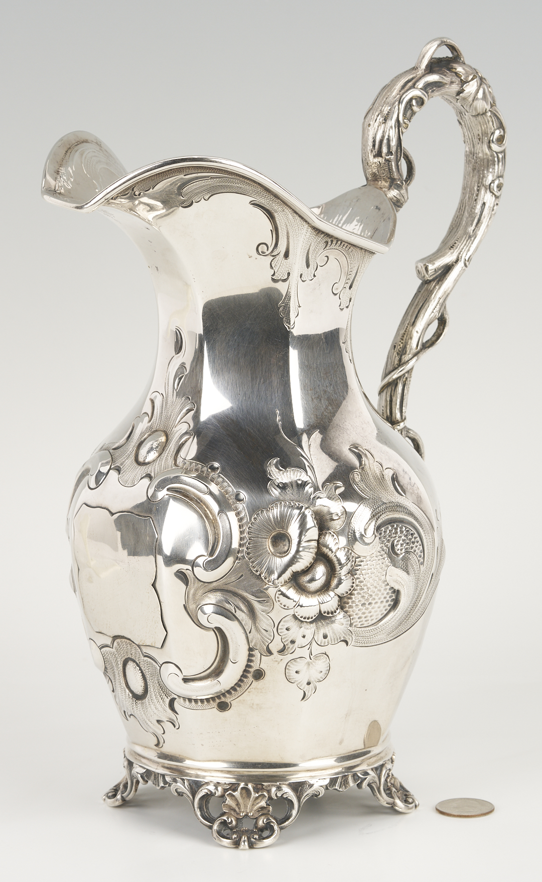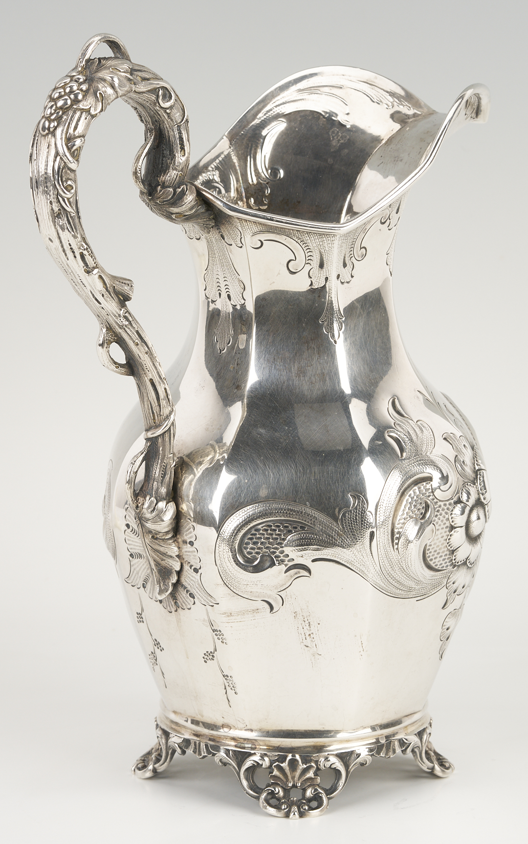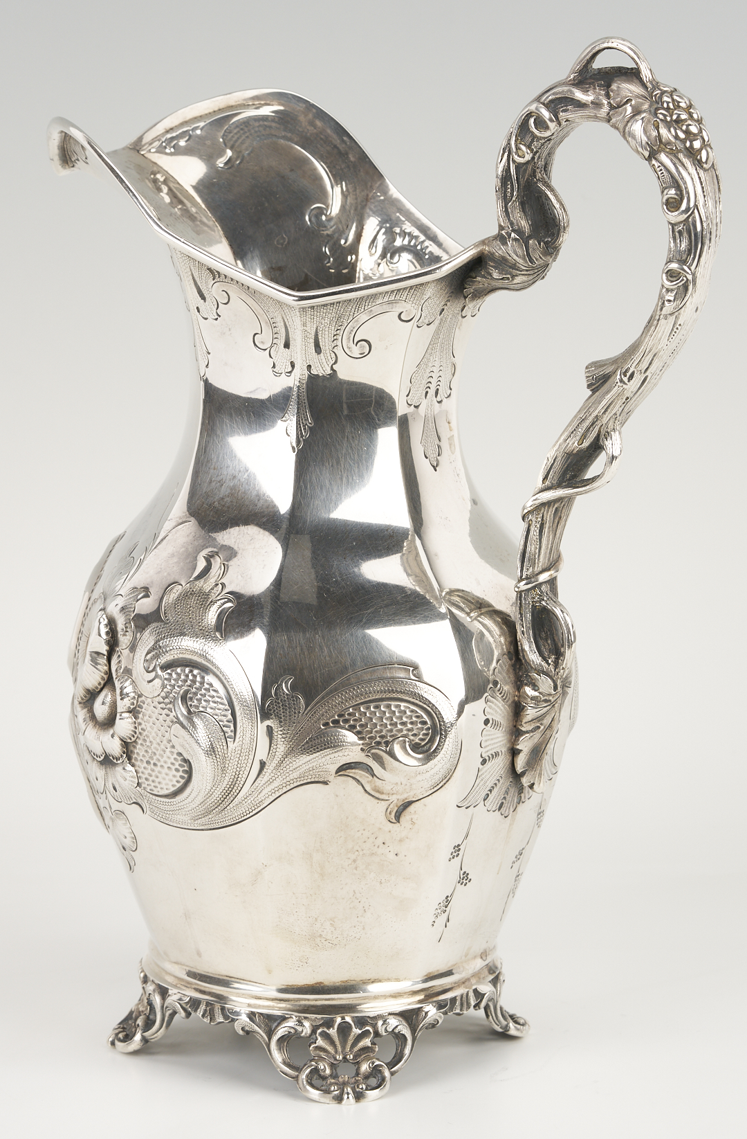 Mid-19th c. Missouri coin silver water pitcher, octagonal pear-shaped form with repousse floral, scroll and cartouche decoration to sides, naturalistic branch handle, and four openwork shell and scroll feet. Incuse mark to underside for Edward Mead, working Ithaca, NY, ca. 1831-1835 and St. Louis, MO, 1835-1881. 12 1/4 in. H. 39.43 oz troy. Circa 1855.