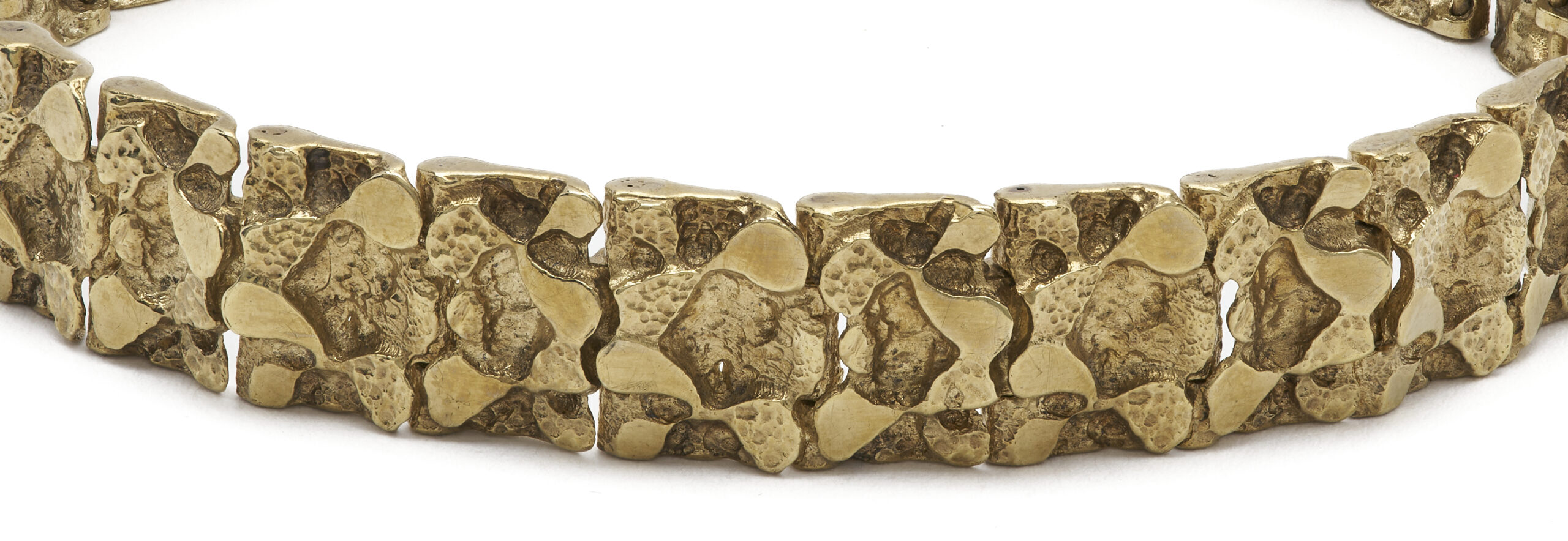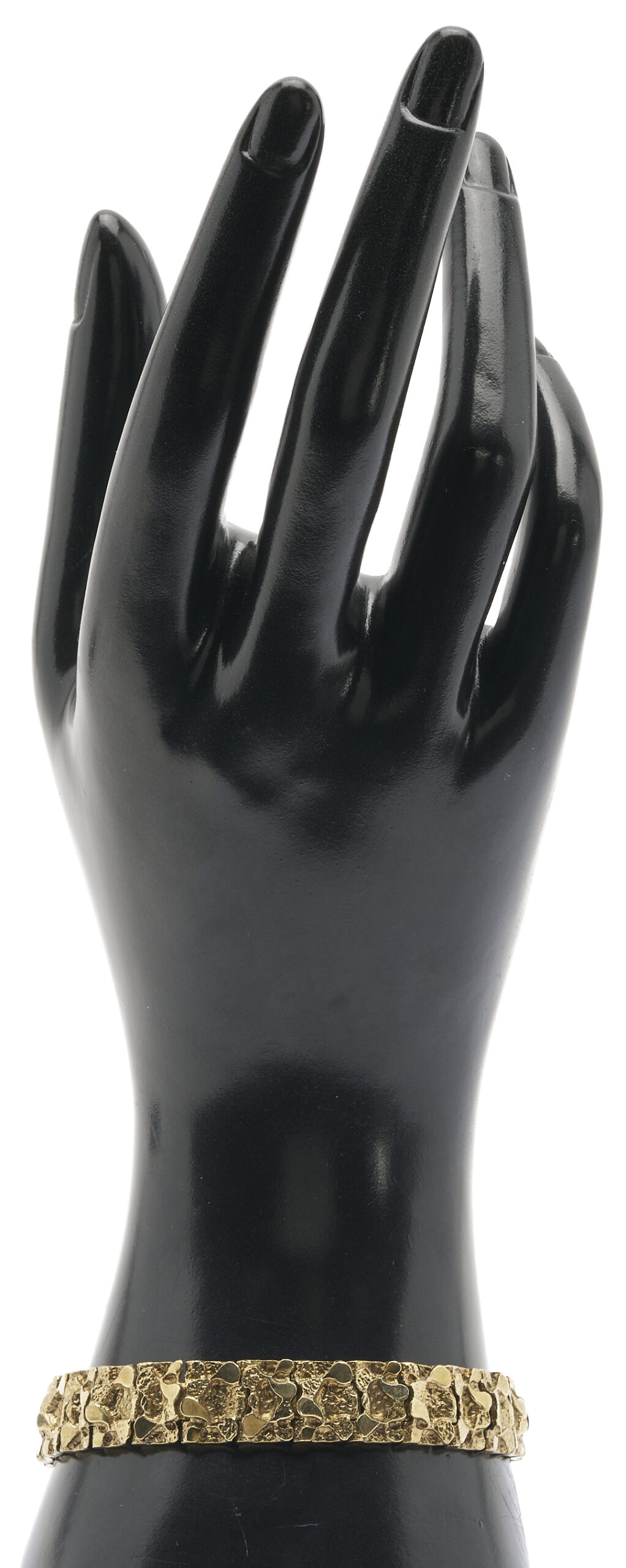 10K yellow gold nugget link bracelet. The bracelet is marked “10K” and XRF tests 10K gold. The bracelet is 8 in. L. and has a weight of 25.47 grams.
