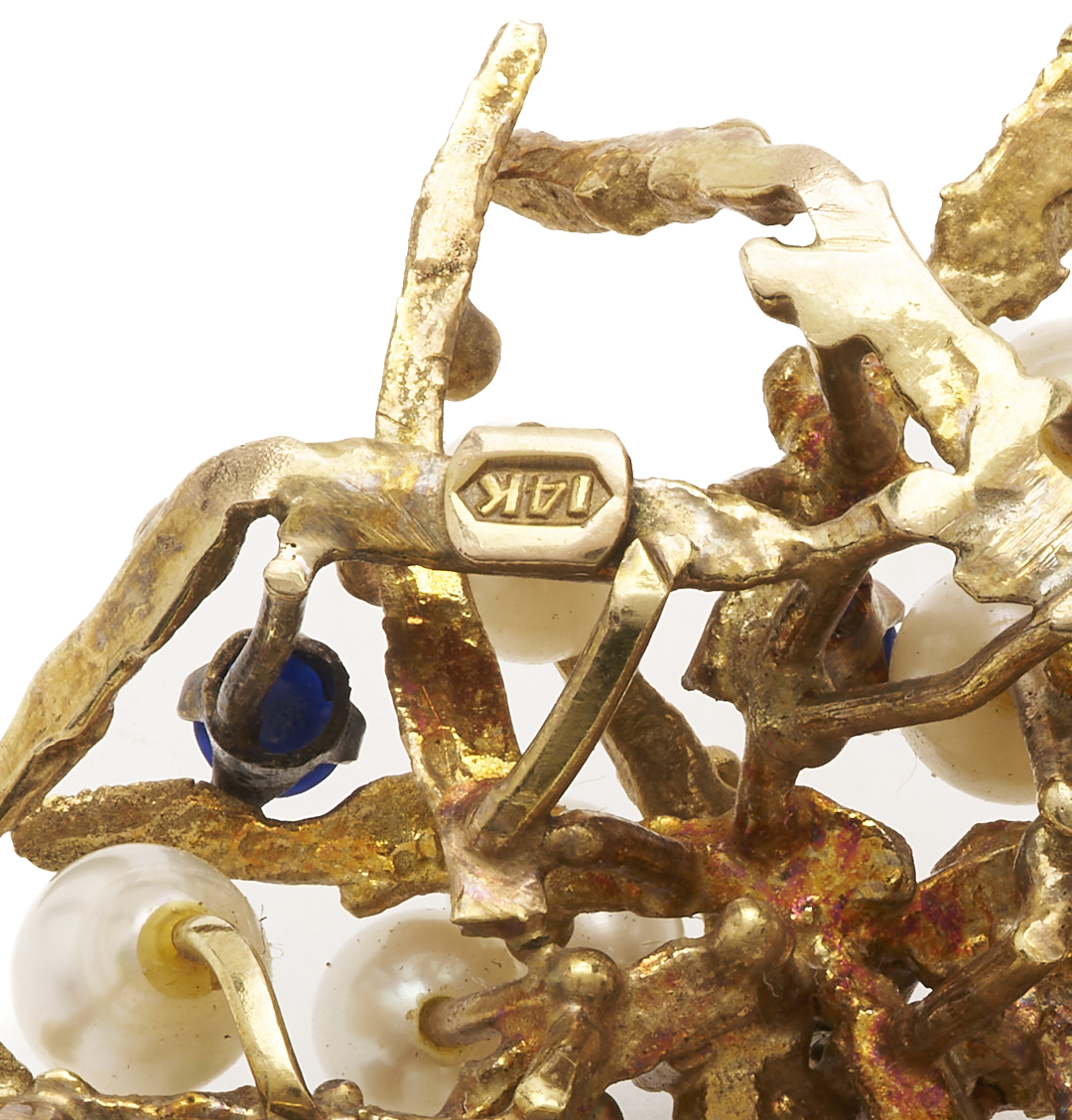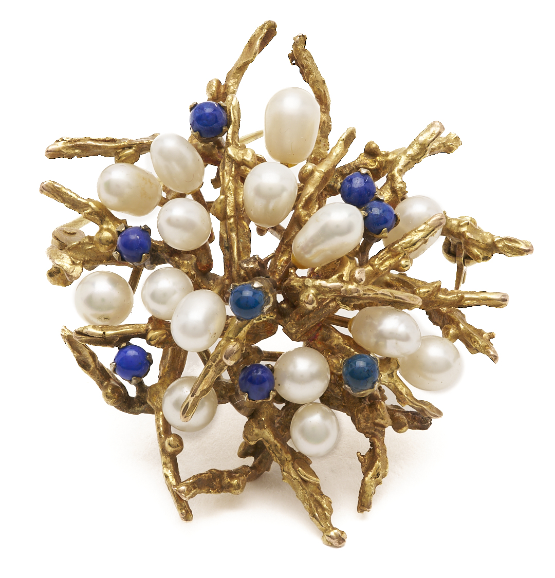 Ladies’ 14K yellow gold brooch featuring fifteen (15) cultured pearls and eight (8) lapis lazuli. The brooch is marked “14K” ad XRF tests 14K gold. The brooch is 1 3/4 in. x 1 1/2 in. and has a gross weight of 17.38 grams.