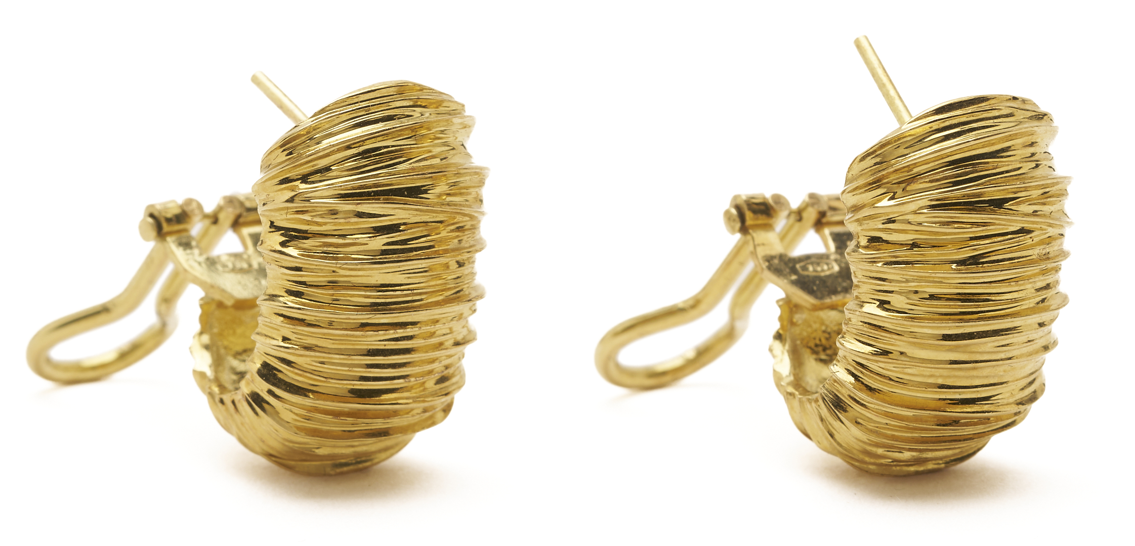 Ladies’ 18K yellow gold pieced clip back earrings. The earrings are marked “750” and XRF test 18K gold. The earrings are 7/8 in. x 1/2 in. and have a gross weight of 13.34 grams.