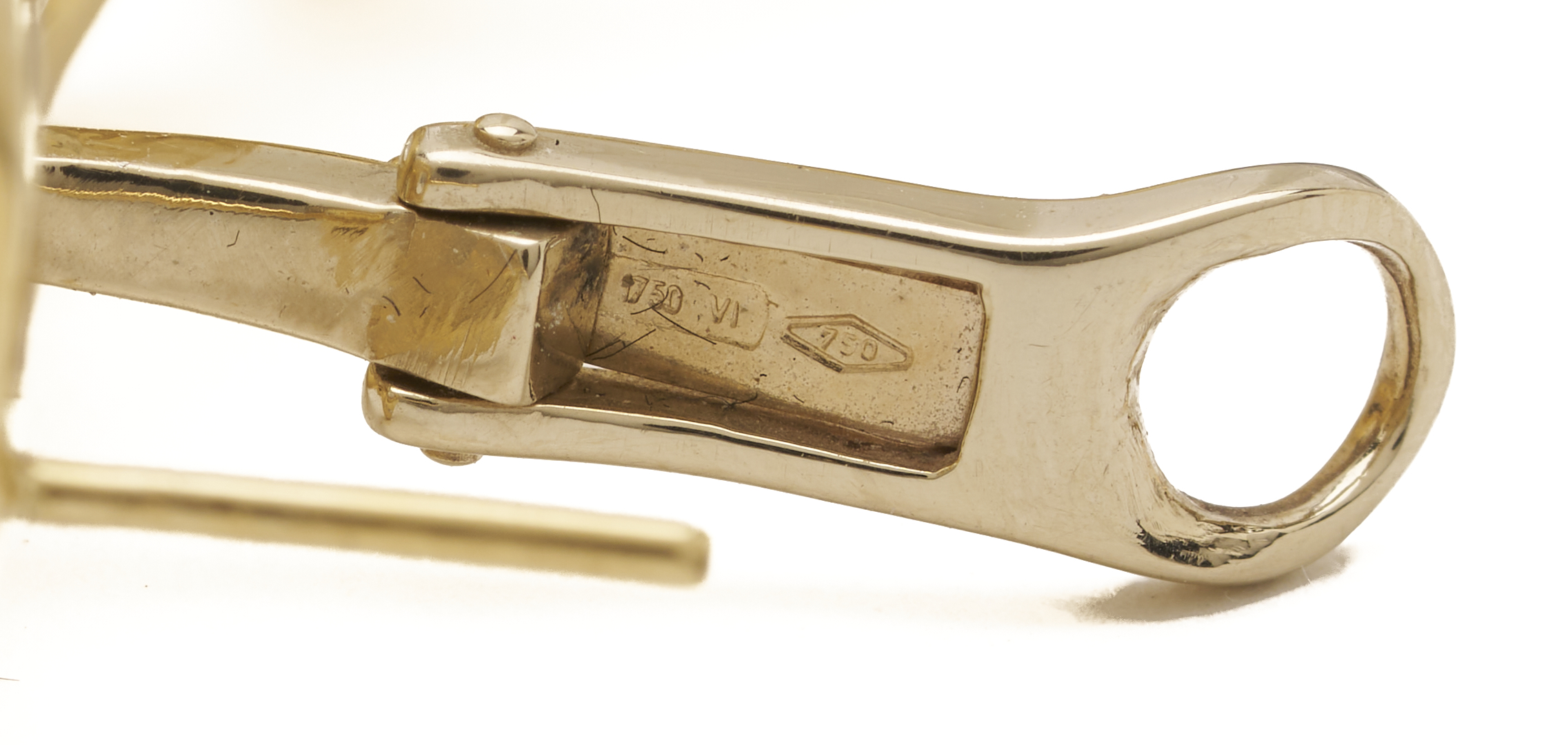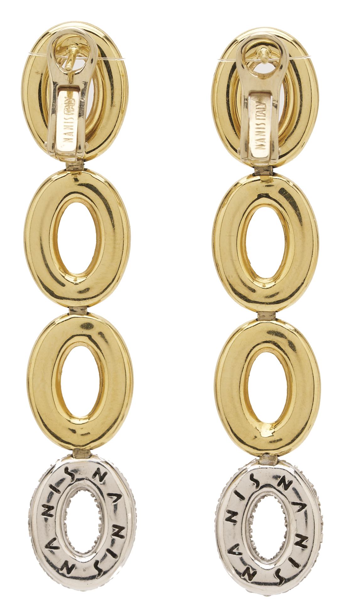 Ladies’ 18K yellow and white gold pierced clip back drop earrings featuring pave set melee diamonds in the bottom ring of both earrings. The earrings are marked “750 VI 750” and XRF test 18K gold. The earrings are 2 1/4 in. L. and have a gross weight of 13.31 grams.