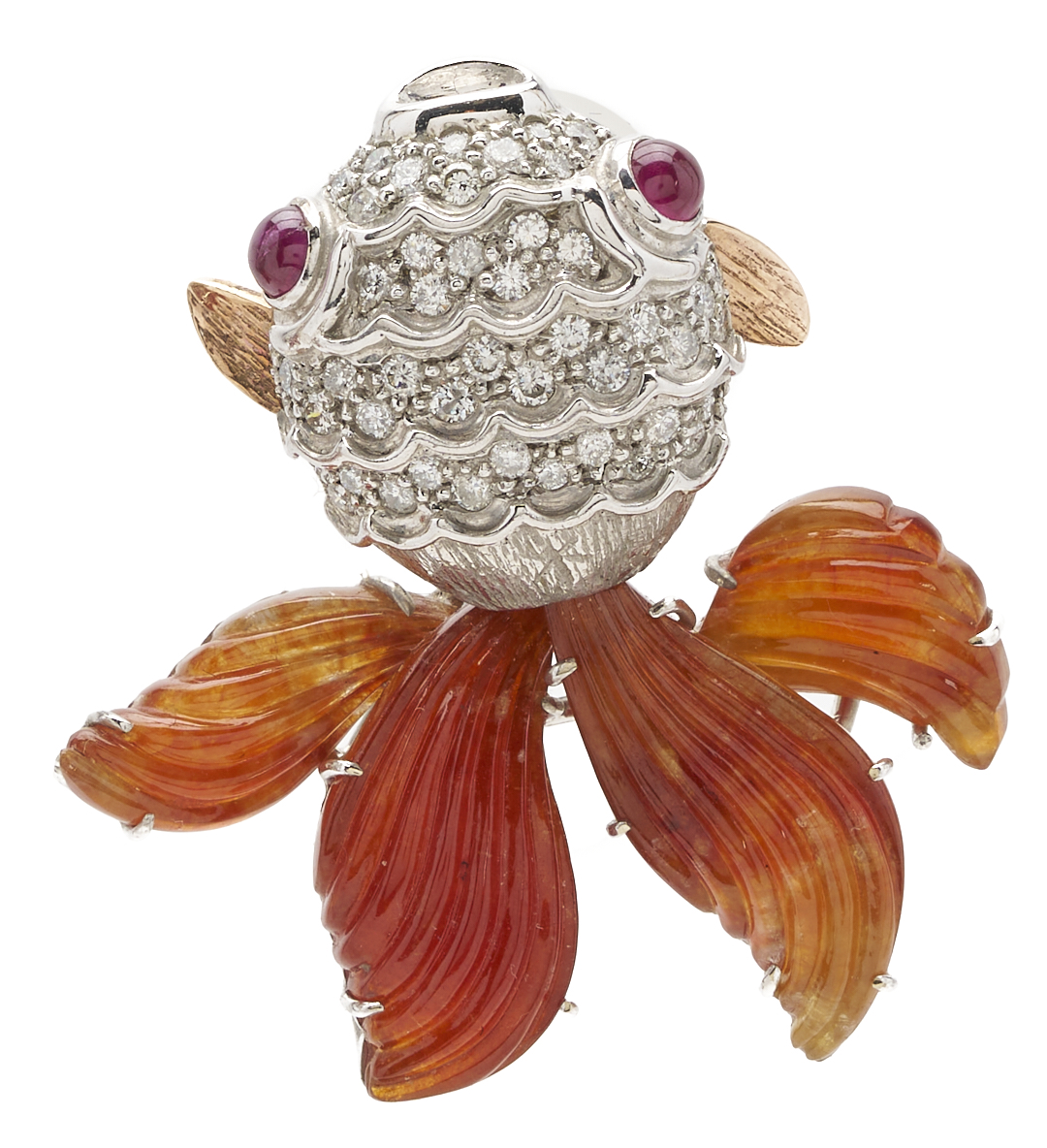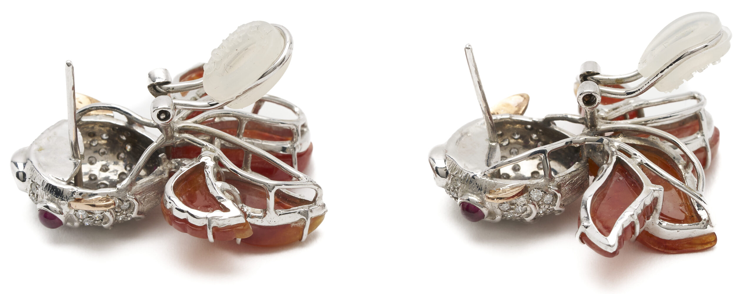 Ladies’ 10K white gold pierced clip back goldfish earrings featuring four (4) cabochon synthetic rubies as eyes, one hundred six (106) single cut melee diamonds as scales, and eight (8) free hand cut orange dyed jadeite jade as fins. The earrings XRF test 10K gold and are 1 1/4 in. x 1 1/4 in. Gross weight of the earrings is 21.54 grams.