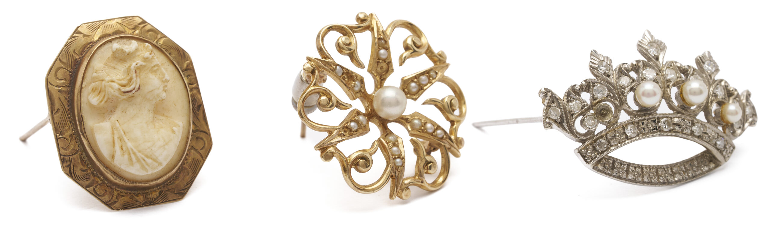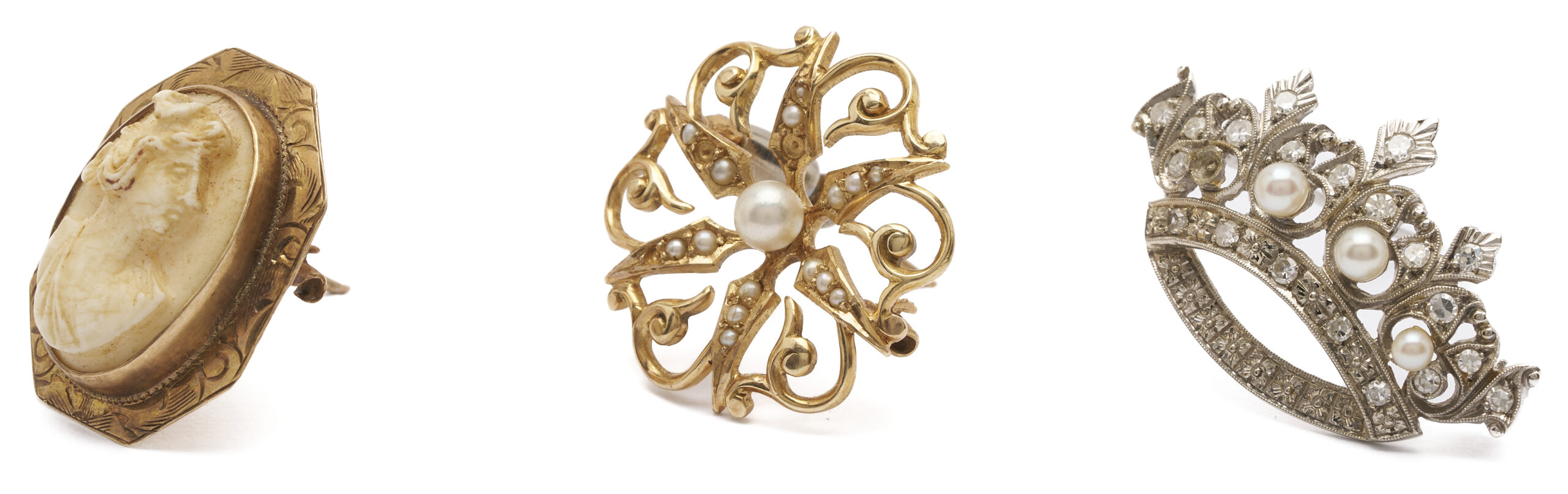 1st item: Ladies’ 14K white gold crown brooch featuring three (3) cultured pearls accented by nineteen (19) single cut melee diamonds. The brooch XRF tests 14K gold and is 1 1/8 in. x 3/4 in. Gross weight of the brooch is 3.55 grams. 2nd item: Ladies’ 14K yellow gold brooch featuring one (1) cultured pearl accented by fifteen (15) seed pearls. The brooch is marked “14K” and XRF tests 14K gold. The brooch is 7/8 in. x 7/8 in. and has a gross weight of 4.51 grams. 3rd item: Ladies’ 10K yellow gold cameo brooch featuring a carved calcedony cameo. The brooch is marked “10K and XRF tests 10K gold. The brooch is 1 in. x 3/4 in. and has a gross weight of 3.28 grams. Gross weight of the lot is 11.34 grams.