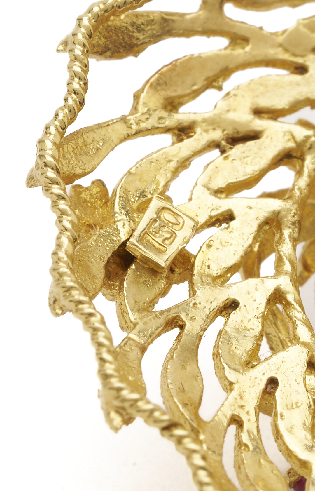 Ladies’ 18K yellow gold floral brooch featuring twenty-three (23) natural rubies. The brooch is marked “750” and XRF tests 18K gold. The brooch is 1 3/8 in. x 1 3/8 in. and has a gross weight of 12.85 grams.