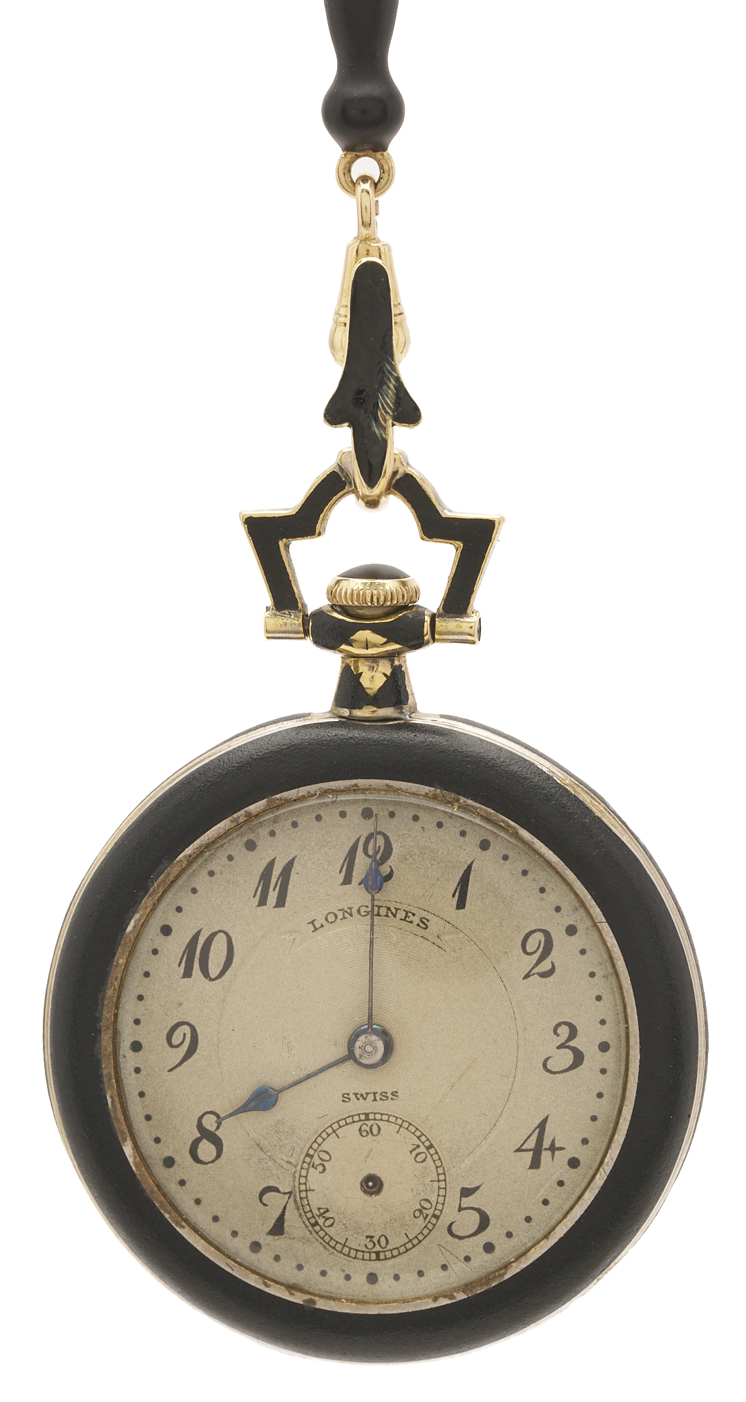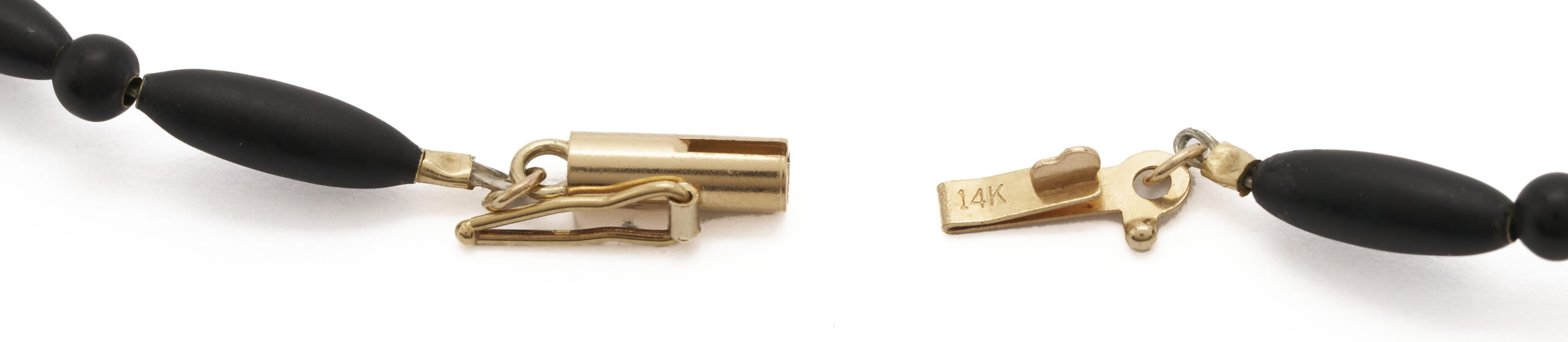1st item: Ladies’ 18K gold with black enamel 15 jewel Longines pocket watch with jet segment necklace with 14K yellow gold clasp. The clasps on the necklace are marked “14K” and XRF test 14K gold. The pocket watch case is marked “18K” and XRF tests 18K gold. Gross weight of the watch is 20.03 grams. 2nd item: Ladies’ 14K yellow gold cameo. The cameo is marked “14K” and XRF tests 14K gold. The cameo is 1 1/8 in. x 1 in. Gross weight of the cameo is 8.71 grams. 3rd item: Ladies’ 10K yellow gold cameo. The cameo is marked “10K” and XRF tests 10K gold. The cameo is 1 1/4 in. x 1 1/8 in. and has a gross weight of 8.89 grams. 4th item: Ladies’ black onyx bar pin featuring a strip of 14K yellow gold accented by seven (7) seed pearls. The gold strip XRF tests 14K gold. The pin is 2 1/8 in. L. Gross weight of the gold pieces in the lot is 37.63 grams.