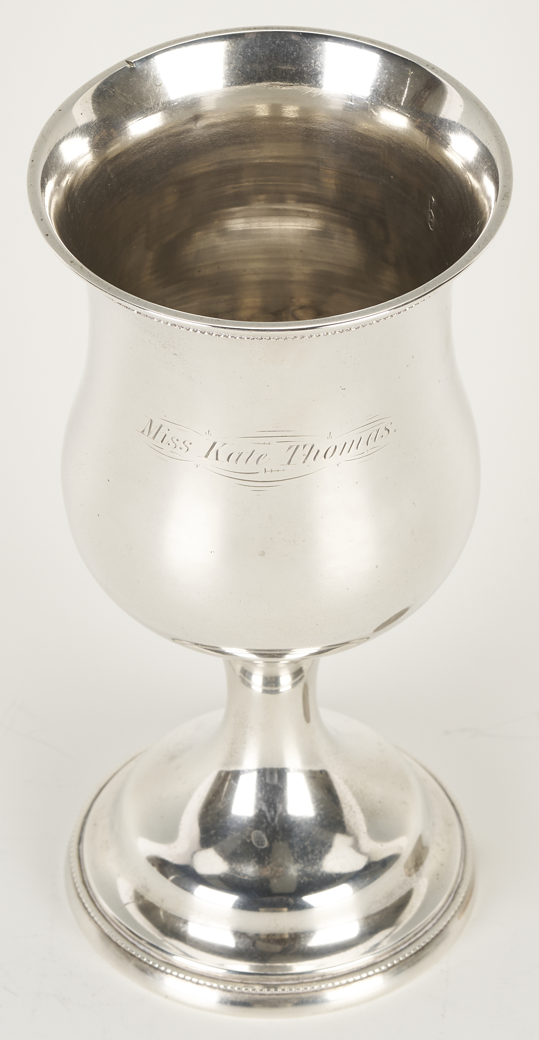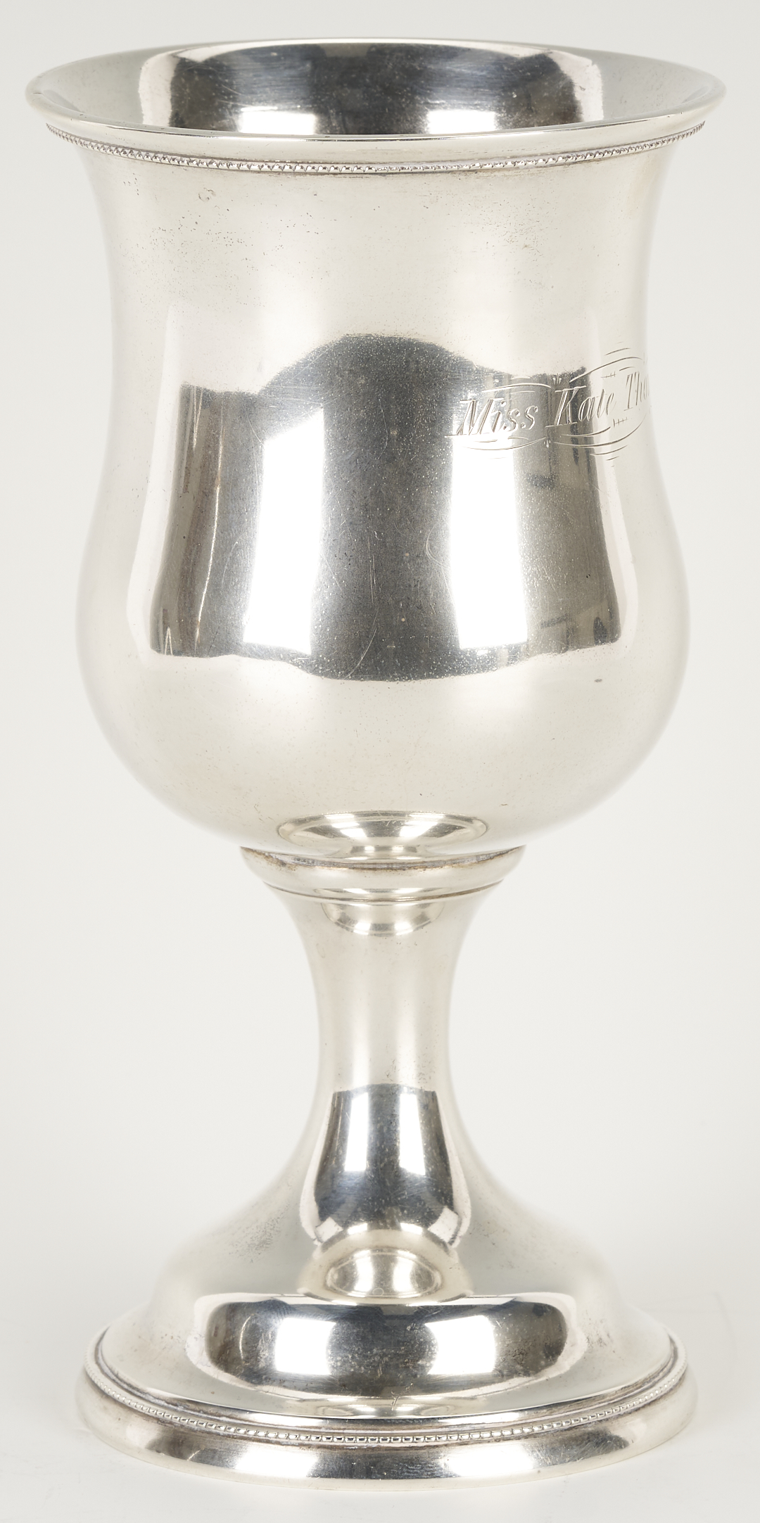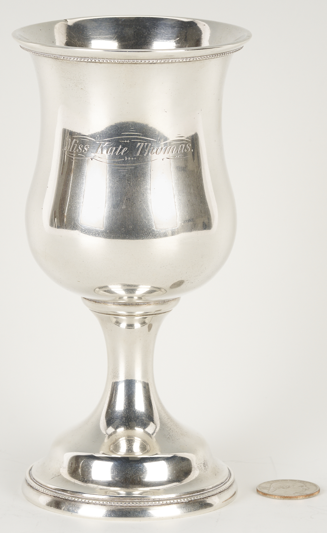 Kentucky coin silver goblet having a bulbous body and flared beaded rim, atop a domed beaded foot. Stamped J. KITTS to underside for John Kitts, Louisville, Kentucky (working 1843-1878; this mark used circa 1836-1874). Monogrammed “Miss Kate Thomas” to one side. 7 in. H. 8.16 troy ounces. Note: according to oral history, this cup was awarded as a premium at a Kentucky horse race in the 19th century.