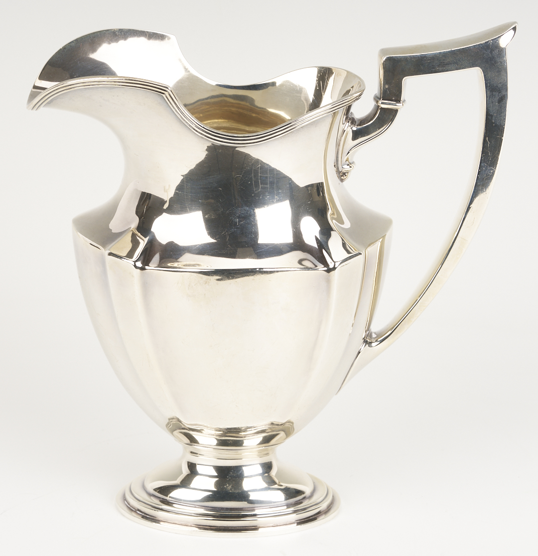 Gorham sterling silver water pitcher in the Plymouth pattern, marked for 3 5/8 pints capacity. 10 in. H., 26.71 oz troy. American, Mid 20th century.