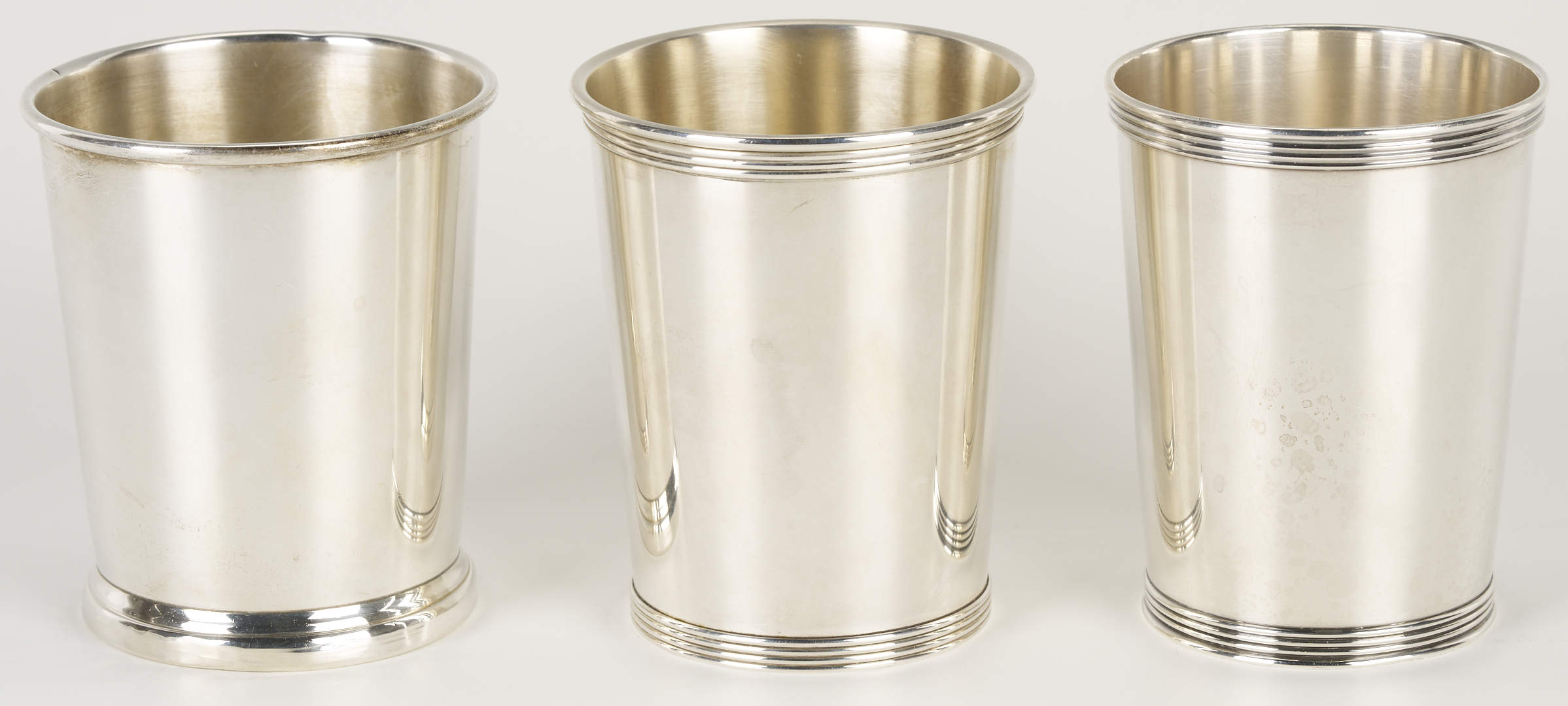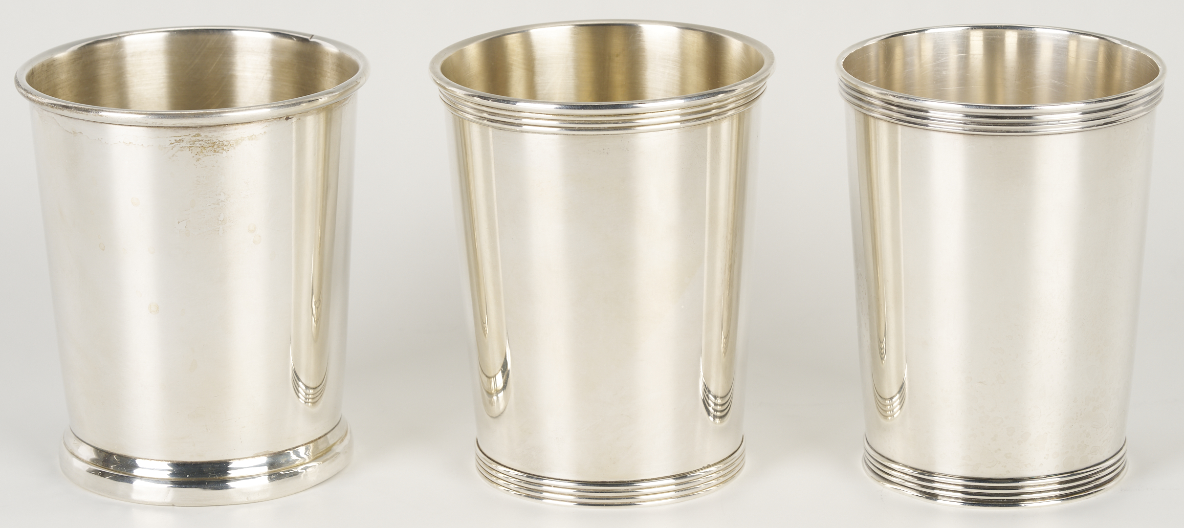 Six (6) sterling silver mint julep cups. Includes four (4) matching Baker Manchester cups with reeded rims and foot rings, and one (1) similar Gorham cup, plus one (1) Web sterling cup with flared upper rim and molded foot ring. No monograms or monogram removals. Combined weight: 22.75 oz troy. All American, mid 20th century.