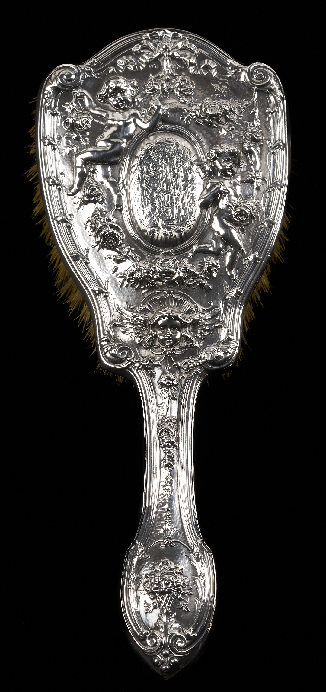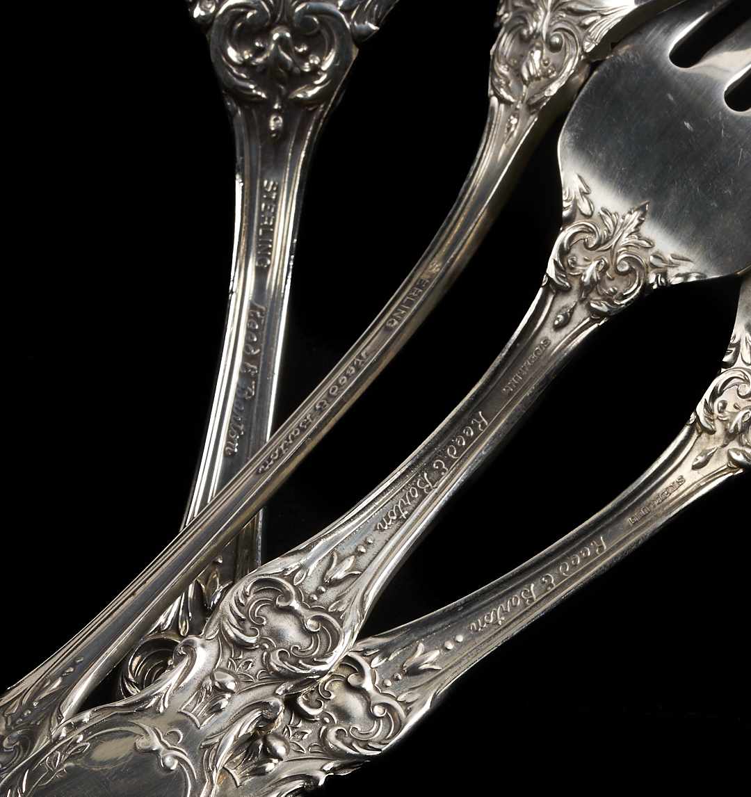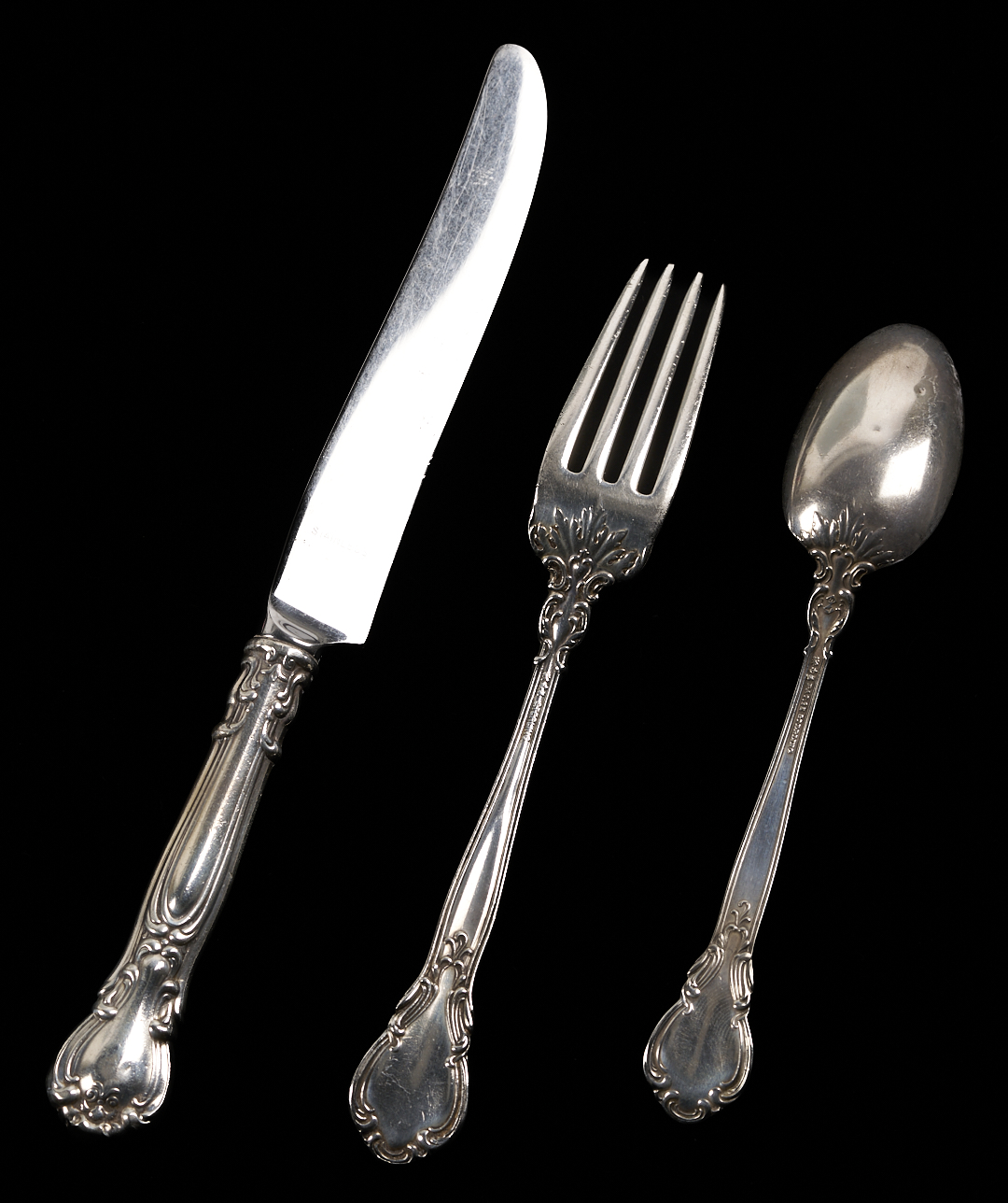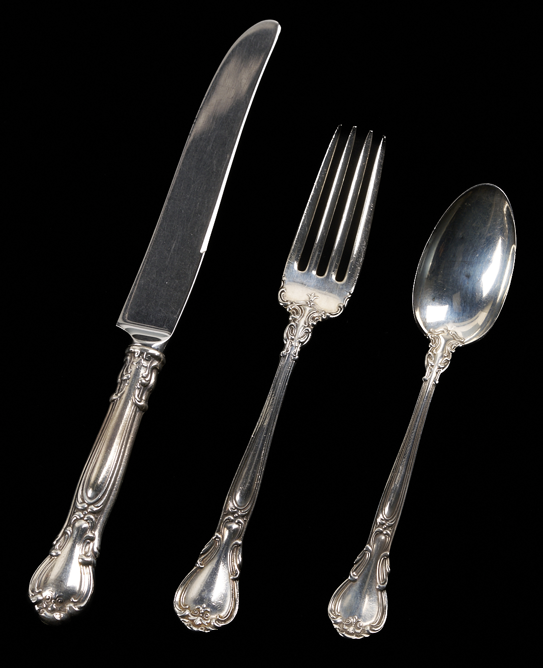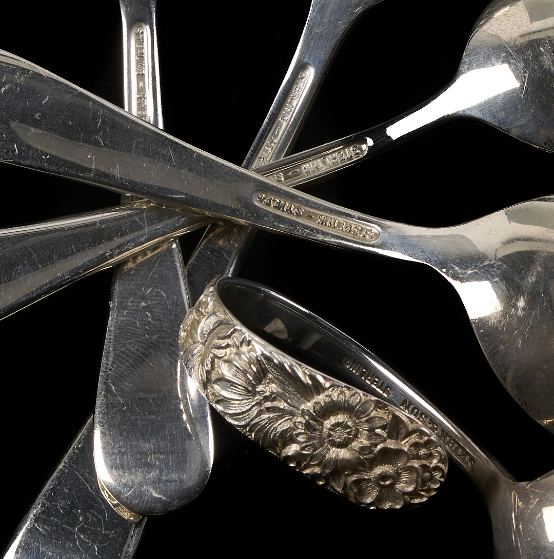 Thirty-seven (37) assorted youth or baby sterling items including 3 baby cups, two marked for Reed & Barton and International Silver; 1 Towle baby rattle; 4 Steiff repousee pieces, a baby fork and spoon together with a youth fork and spoon; 4 Kirk & Son repousee pieces, a youth knife, a food pusher, a baby spoon with curved handle and an infant feeding spoon; 4 Gorham Chantilly pieces including a baby spoon, a baby fork, a baby spoon with curved handle and a youth knife; 4 Gorham King Edward pieces including 3 baby spoons and 1 youth fork; 9 Reed & Barton King Edward pieces including a youth knife, 2 youth forks, a youth spoon, a baby knife, a baby fork, a baby spoon, and 2 infant feeding spoons; 1 James E Blake baby spoon, 1 sterling baby fork, 1 Kirk & Son baby spoon, 1 Reed & Barton infant spoon and 1 Gorham infant feeding spoon. Lot also includes a Towle sterling goblet with monogram, a sterling pocket watch rattle or charm. a sterling small monogrammed beaker, and a Gorham Art Deco hairbrush. 24.8 total weighable troy ounces.